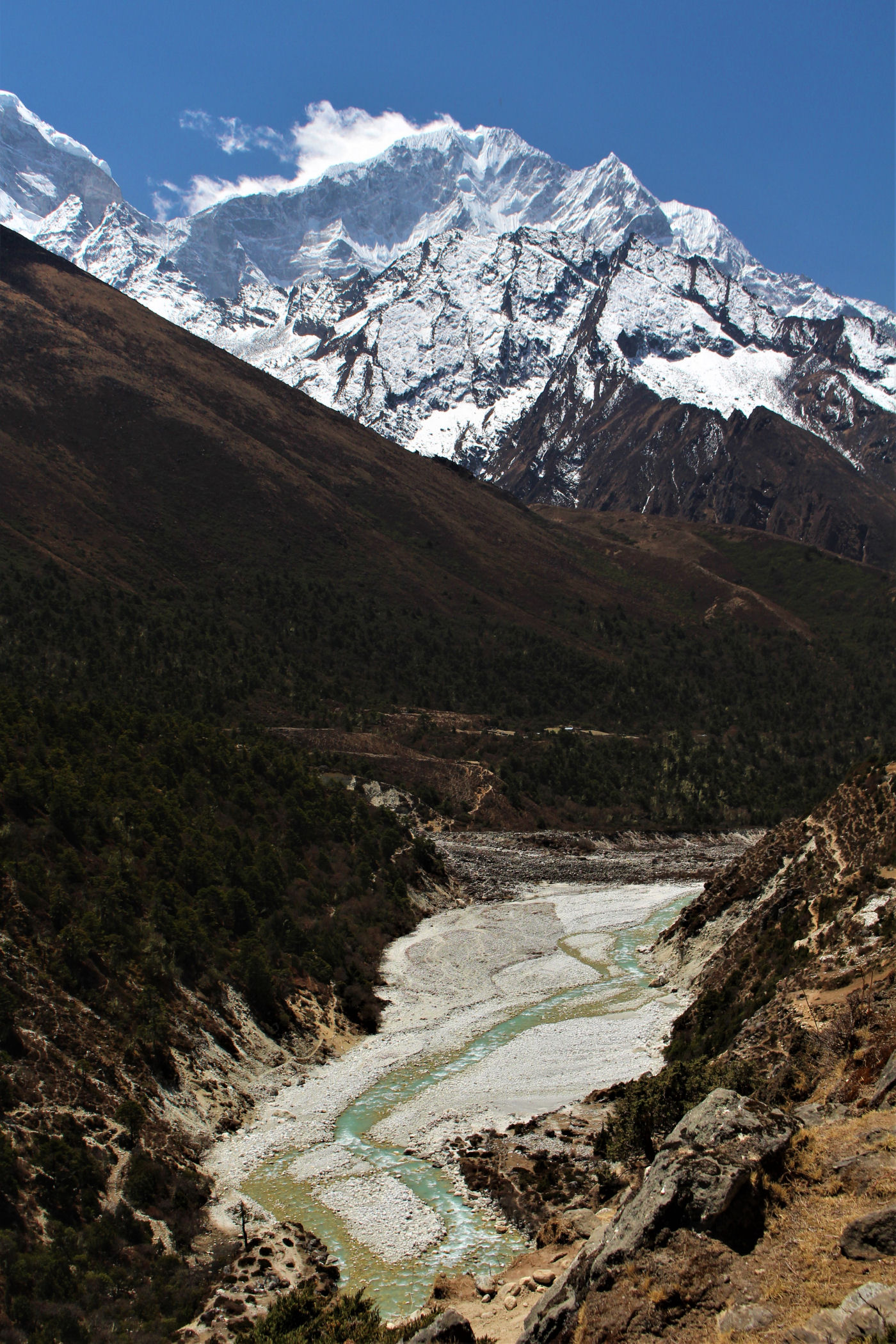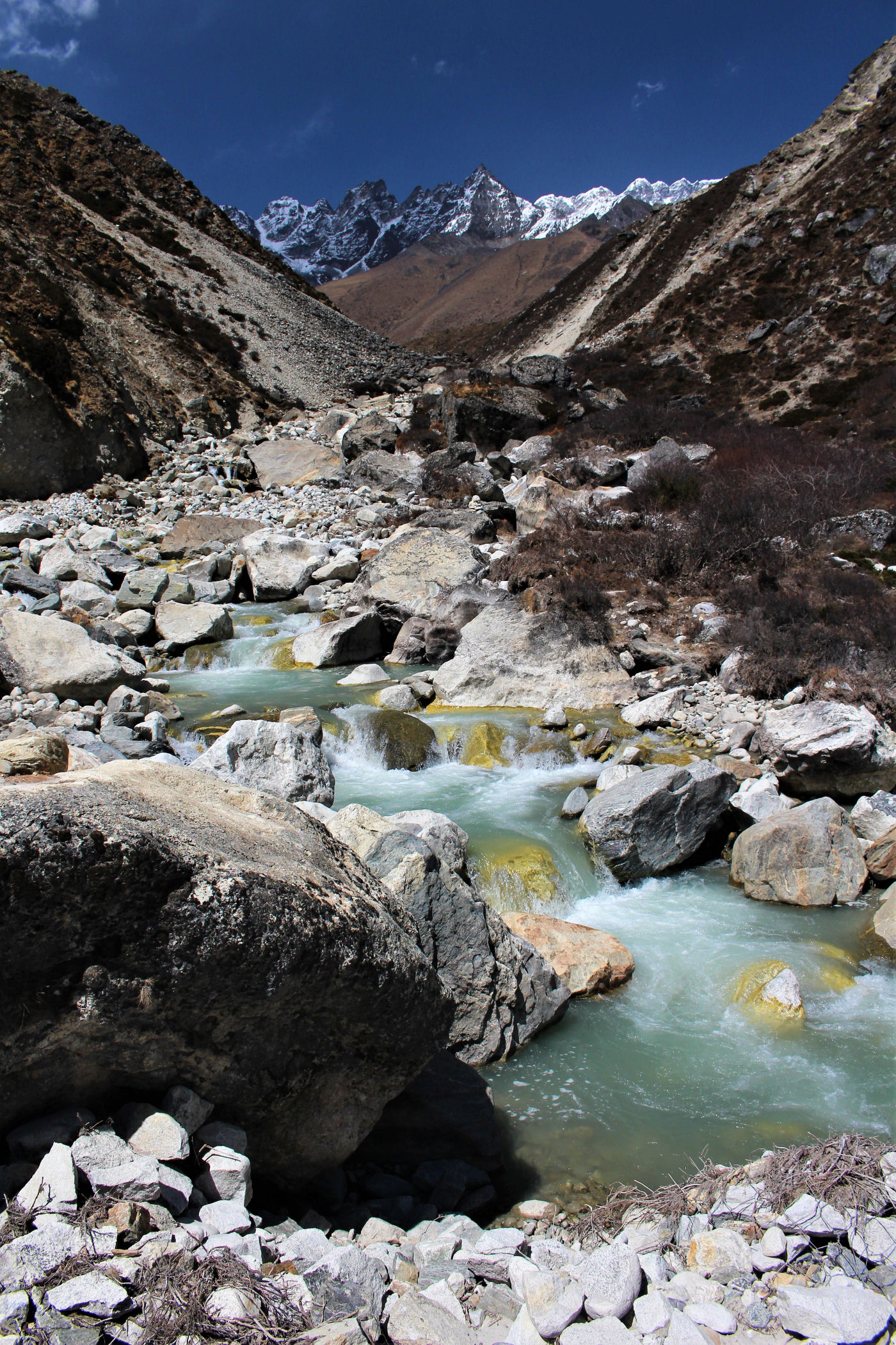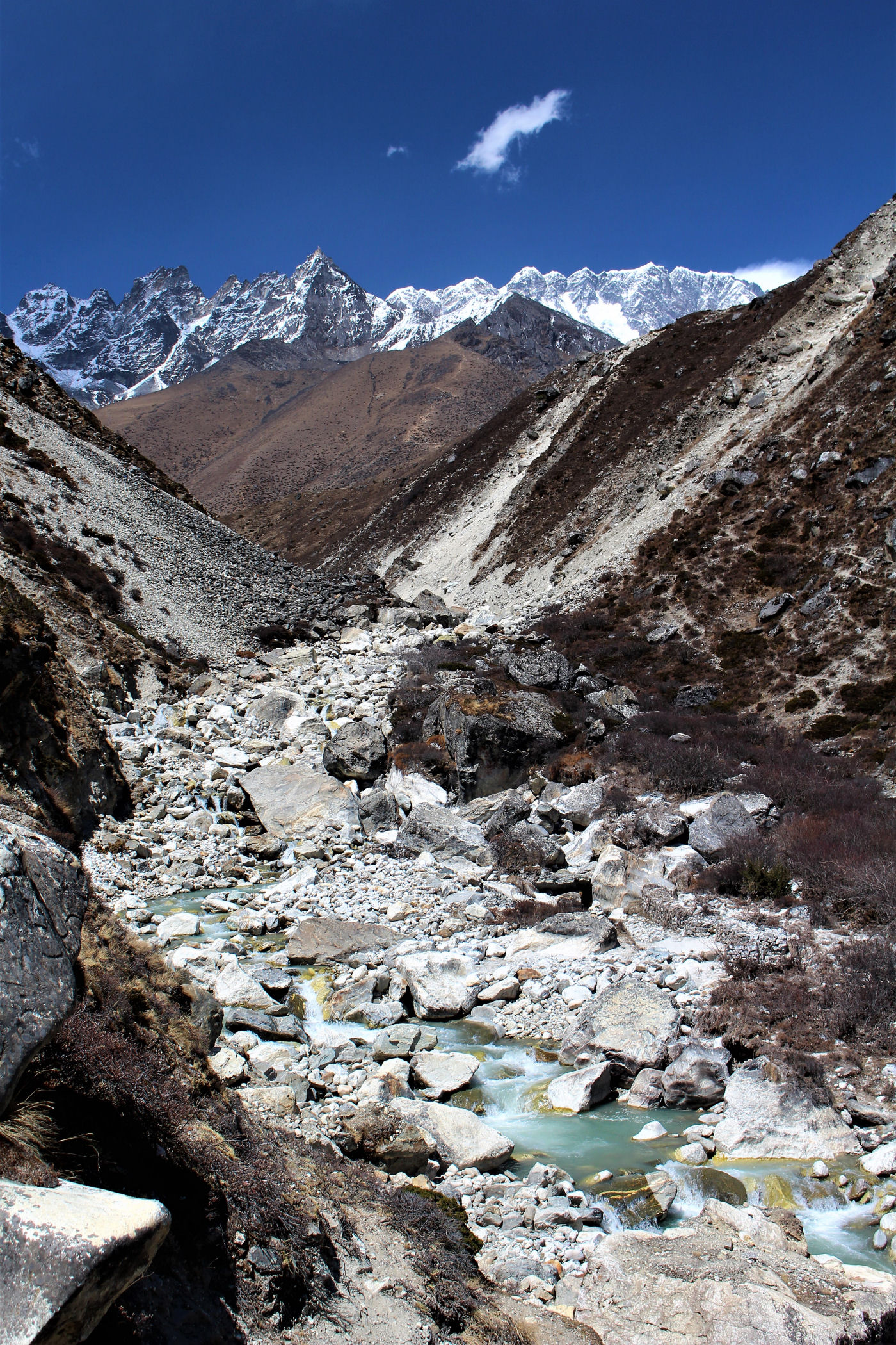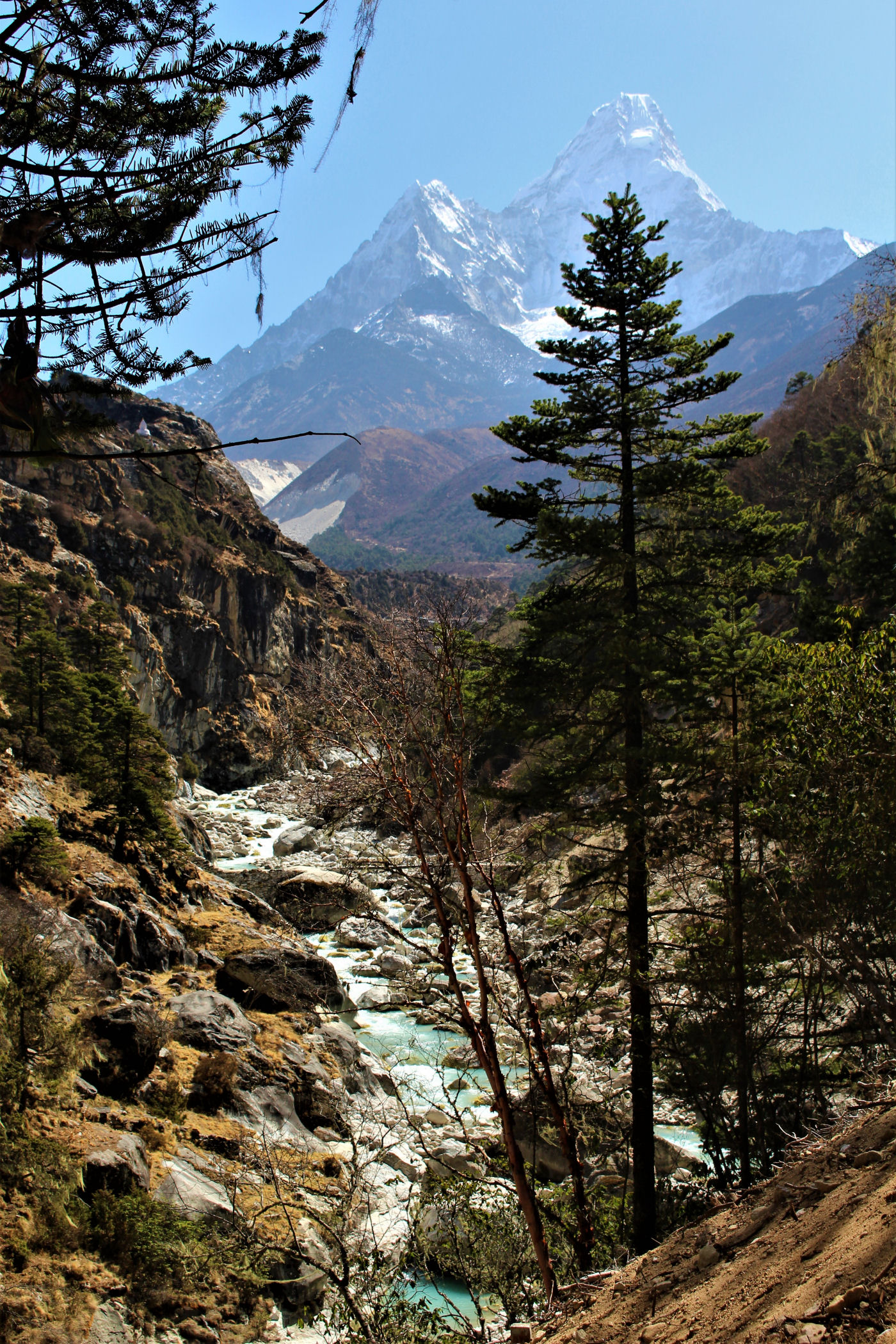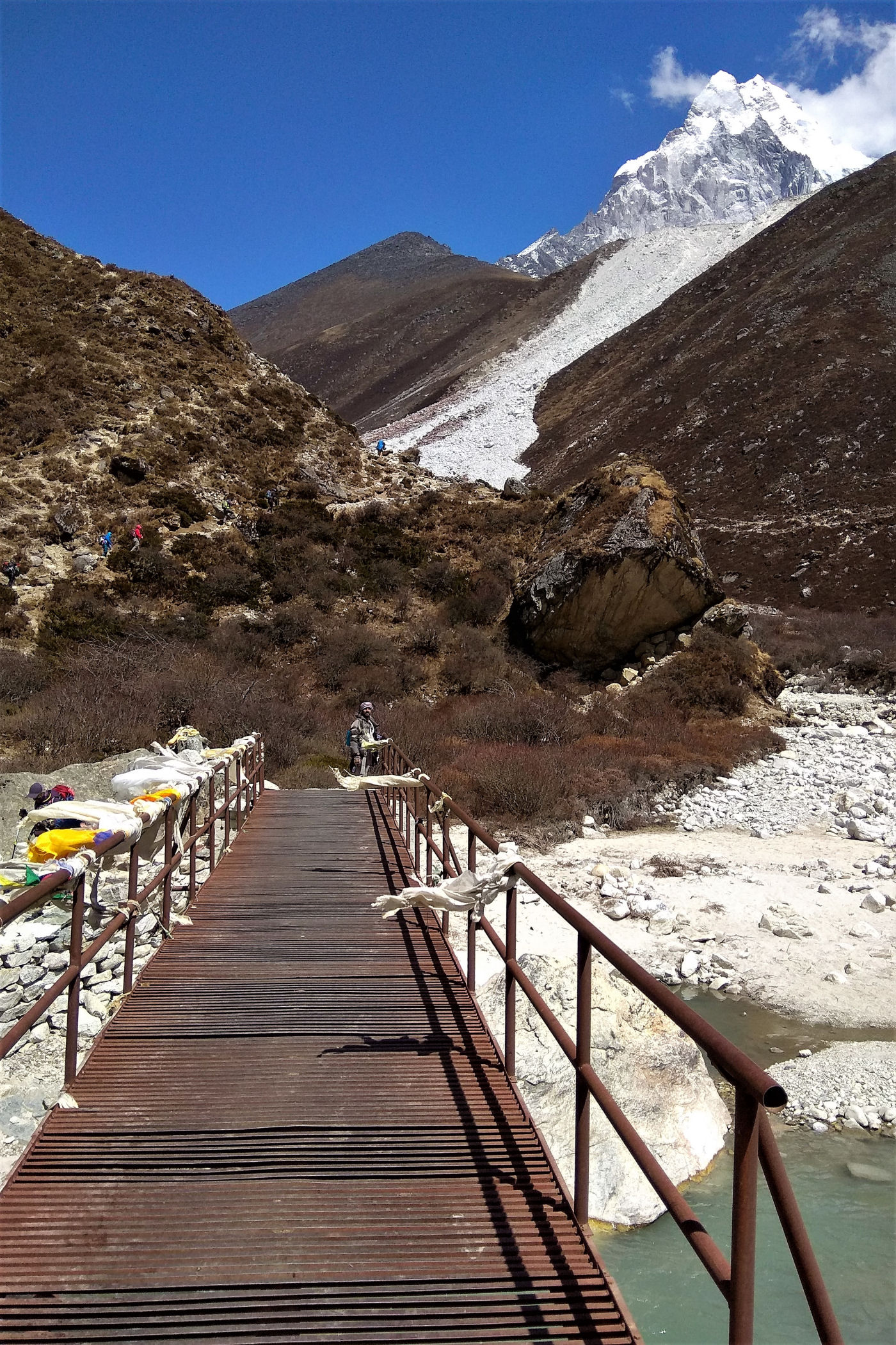 Ostatni odcinek do przejścia jest jeszcze piękniejszy. Krajobraz staje się coraz bardziej surowy, z coraz mniejszą ilością roślinności. W rozwidleniu potoków na białych jak śnieg kamieniach rozgrzanych w słońcu w otoczeniu śnieżnych gigantów i turkusowej wody robimy sobie jeszcze mały odpoczynek, aby potem prosto skierować się już do naszego dzisiejszego celu – Dingboche.