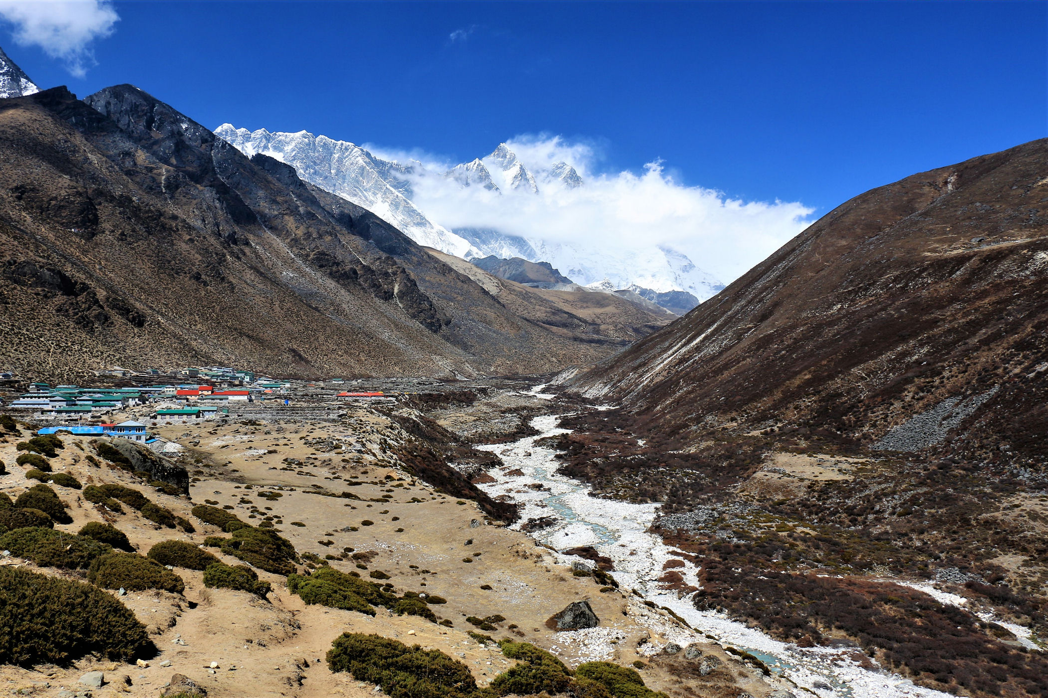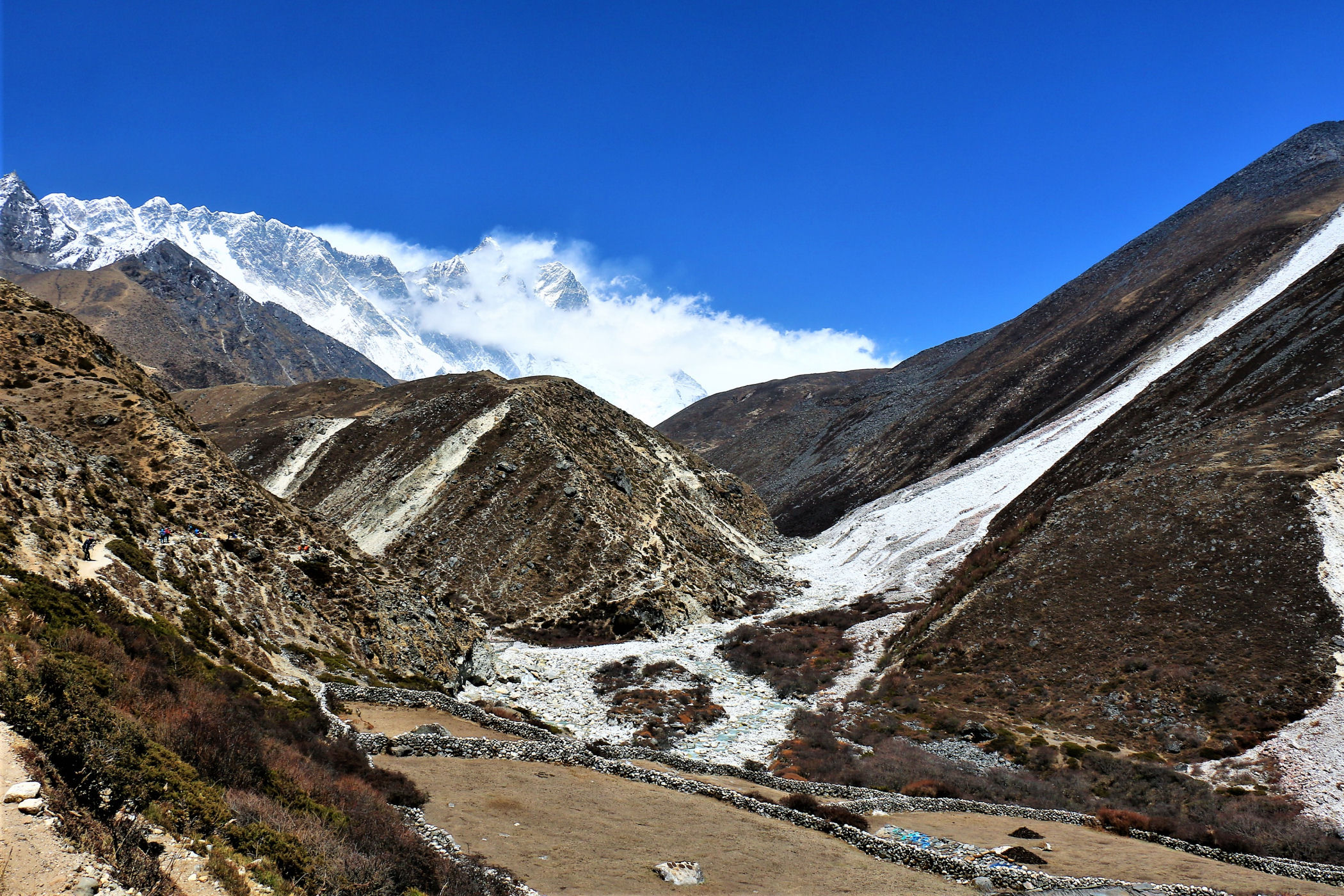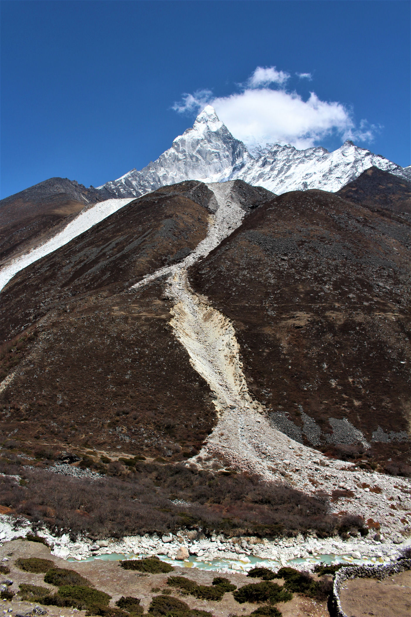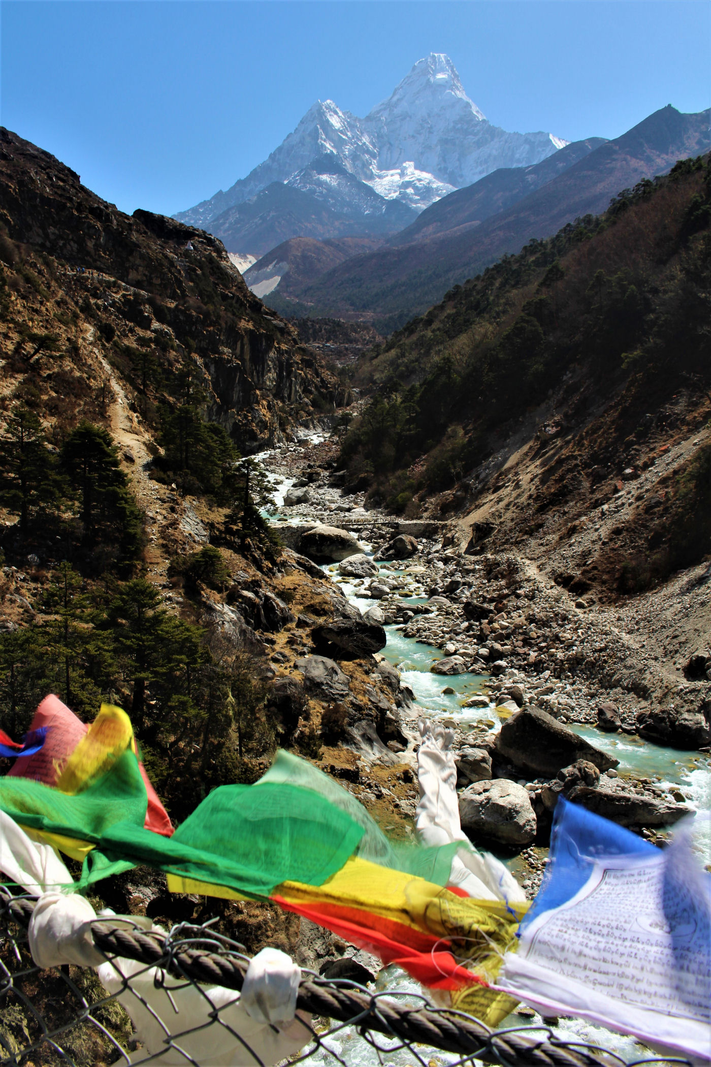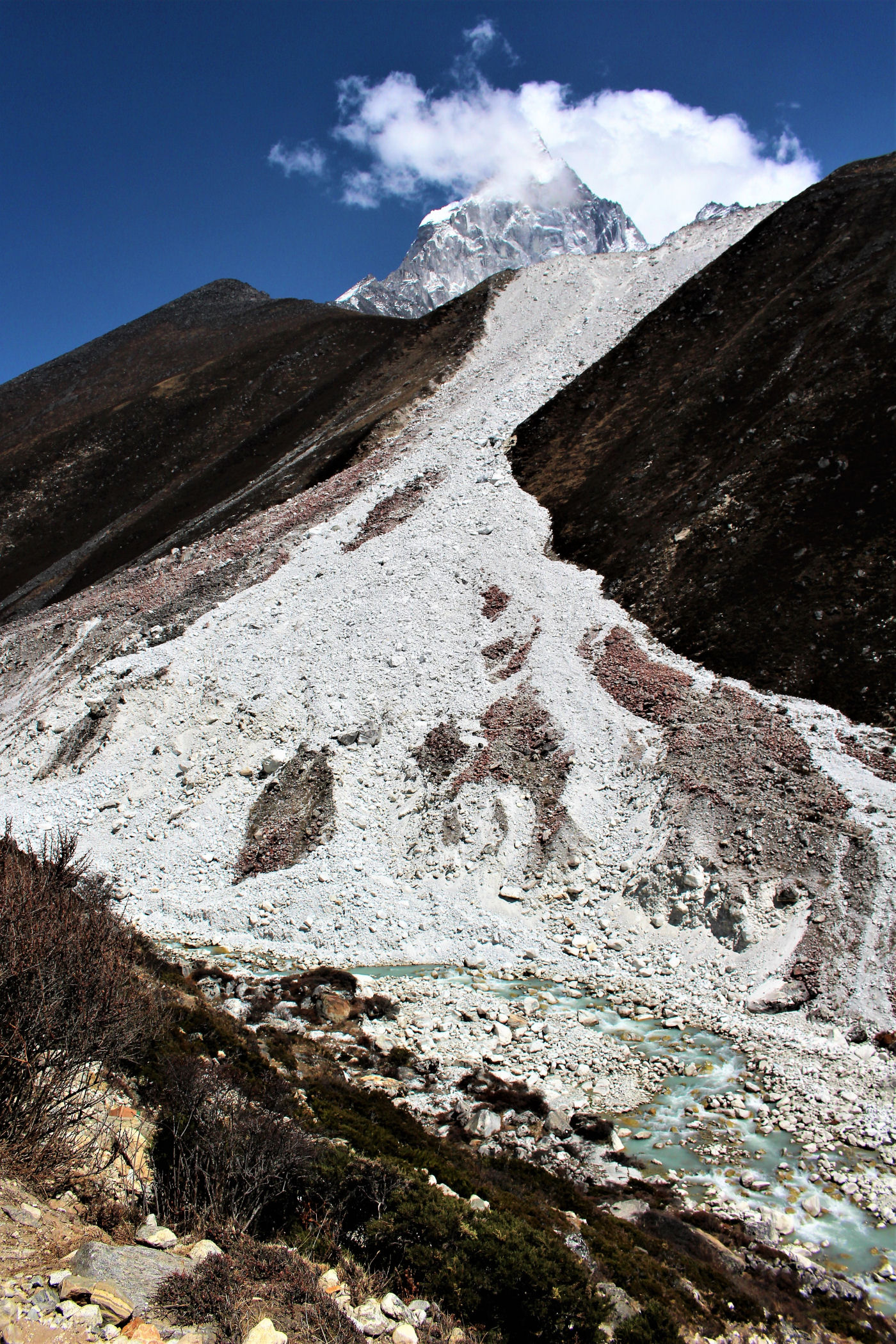 Ostatni odcinek do przejścia jest jeszcze piękniejszy. Krajobraz staje się coraz bardziej surowy, z coraz mniejszą ilością roślinności. W rozwidleniu potoków na białych jak śnieg kamieniach rozgrzanych w słońcu w otoczeniu śnieżnych gigantów i turkusowej wody robimy sobie jeszcze mały odpoczynek, aby potem prosto skierować się już do naszego dzisiejszego celu – Dingboche.