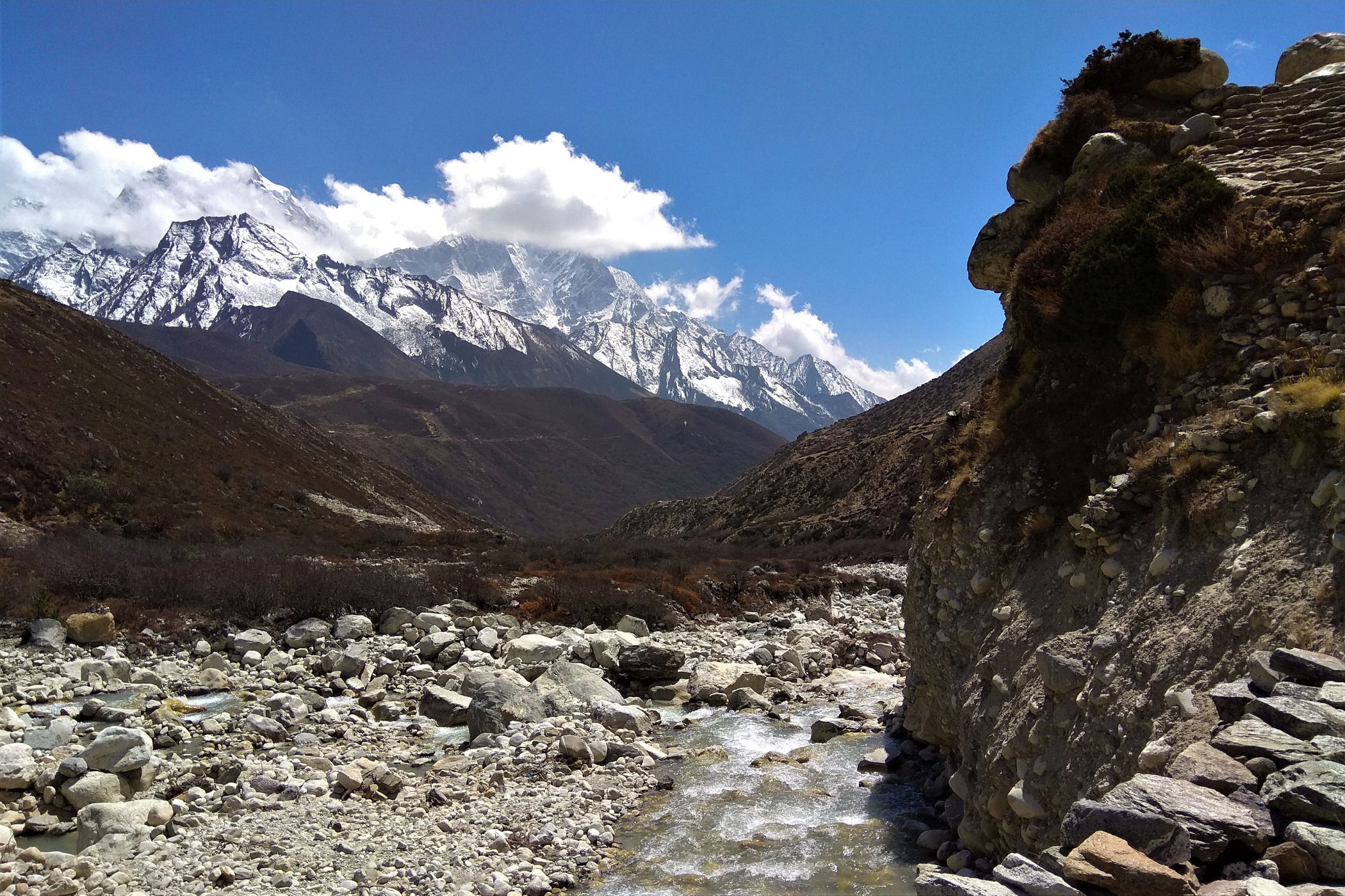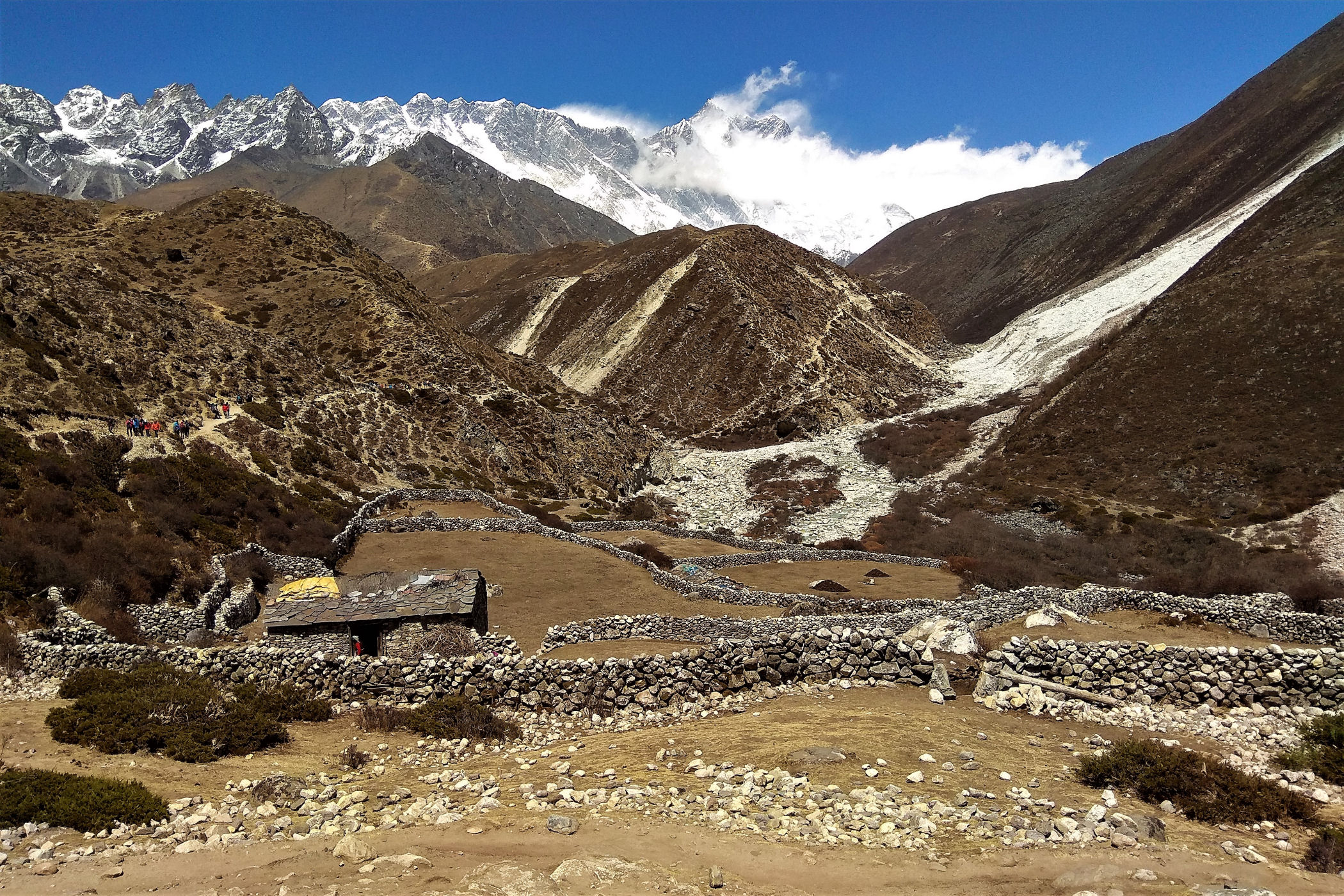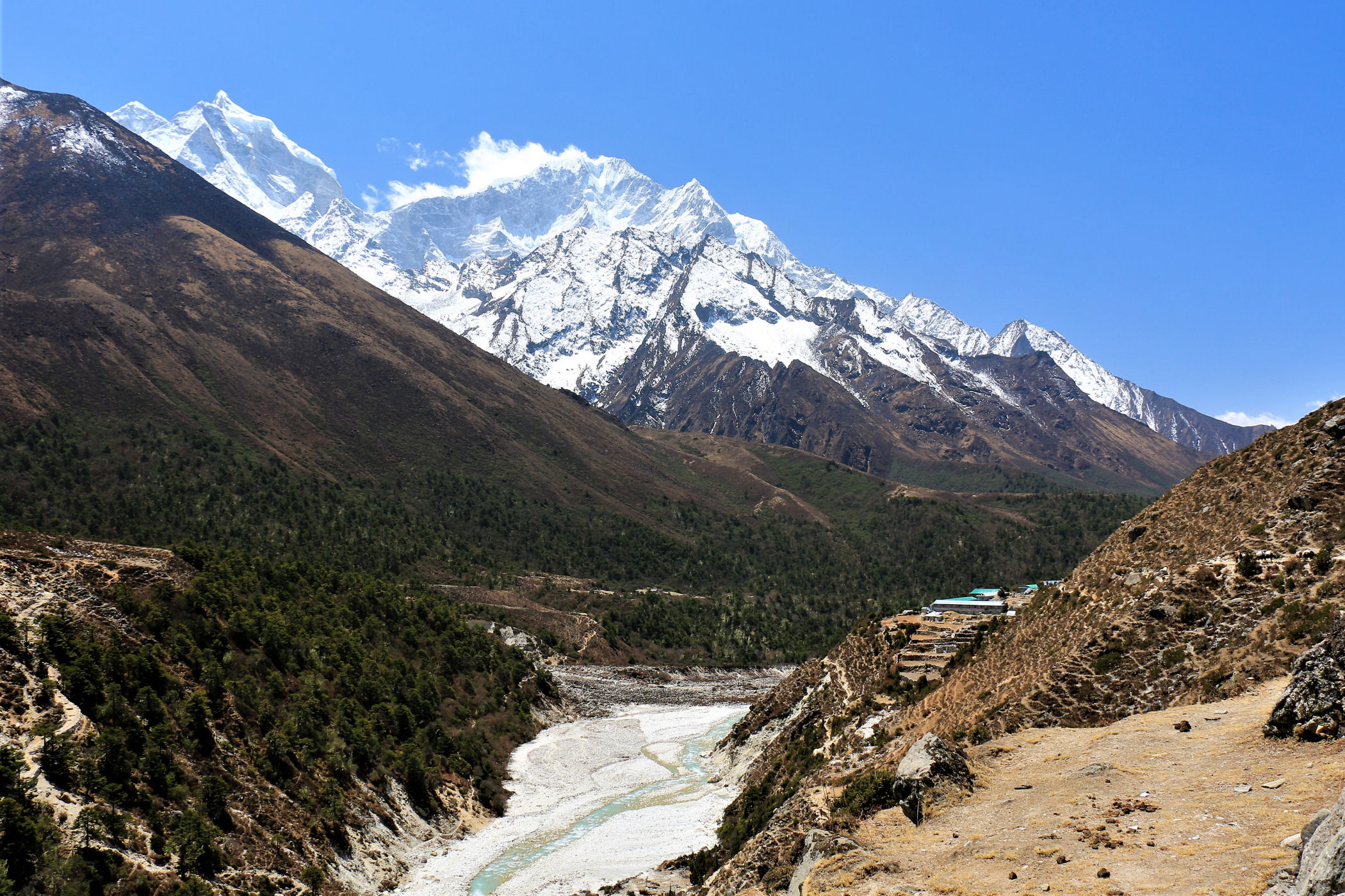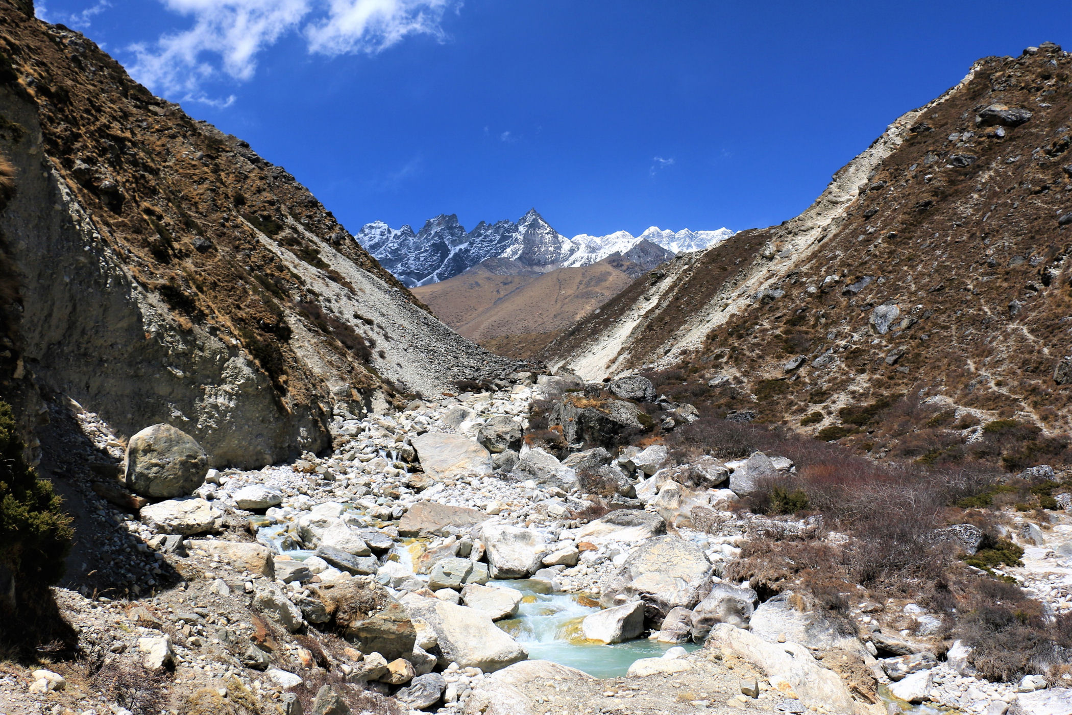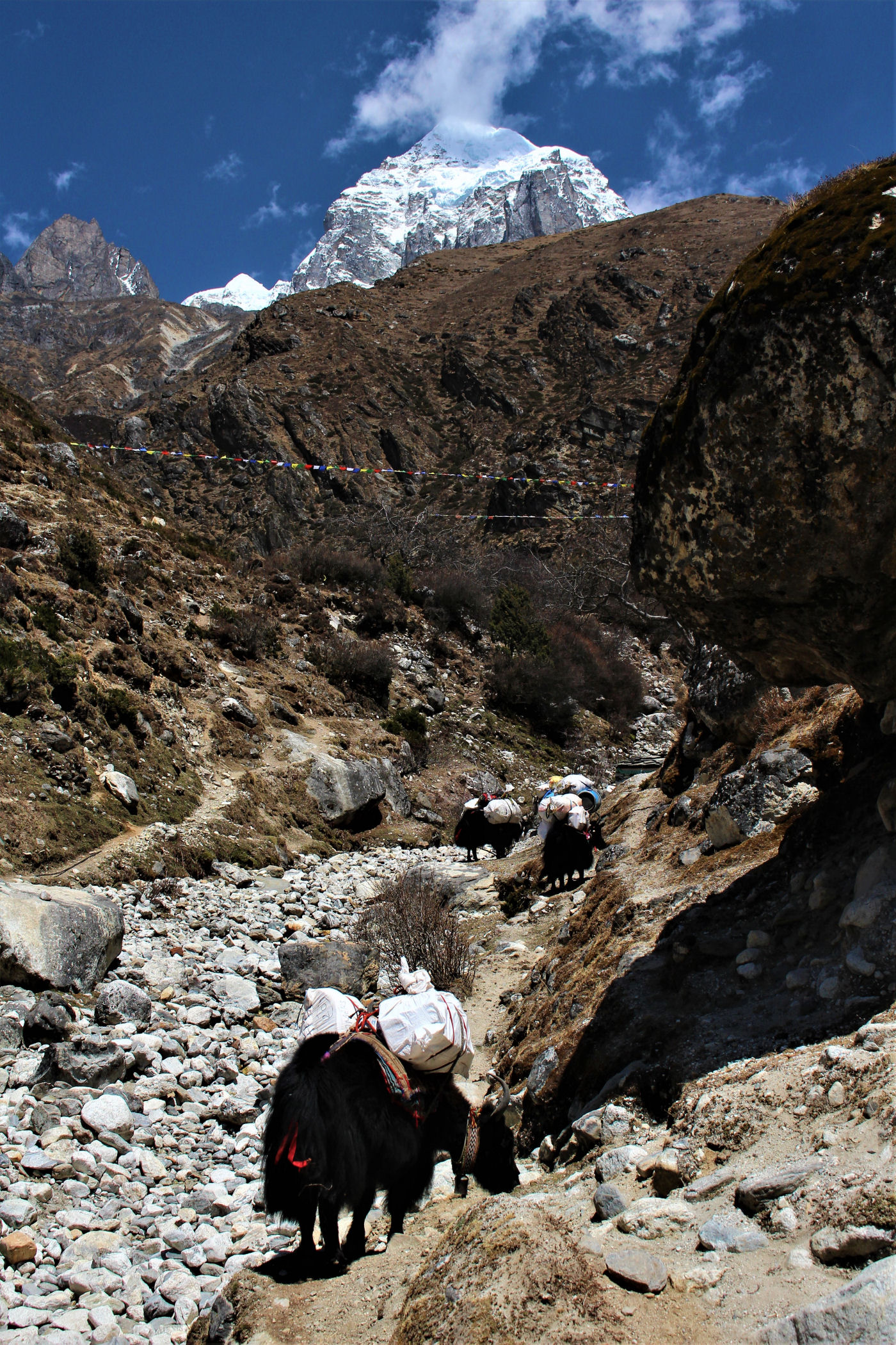 Ostatni odcinek do przejścia jest jeszcze piękniejszy. Krajobraz staje się coraz bardziej surowy, z coraz mniejszą ilością roślinności. W rozwidleniu potoków na białych jak śnieg kamieniach rozgrzanych w słońcu w otoczeniu śnieżnych gigantów i turkusowej wody robimy sobie jeszcze mały odpoczynek, aby potem prosto skierować się już do naszego dzisiejszego celu – Dingboche.