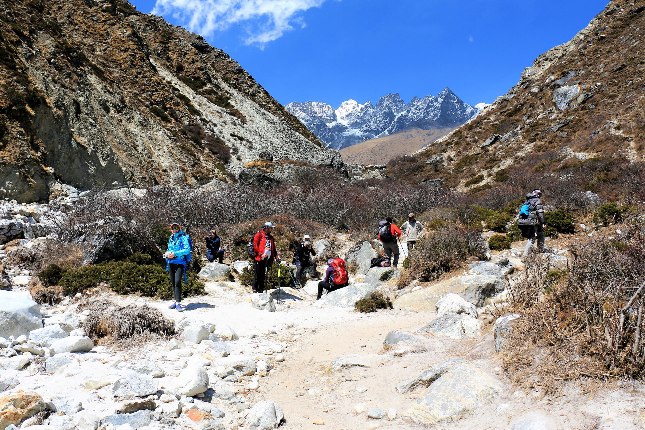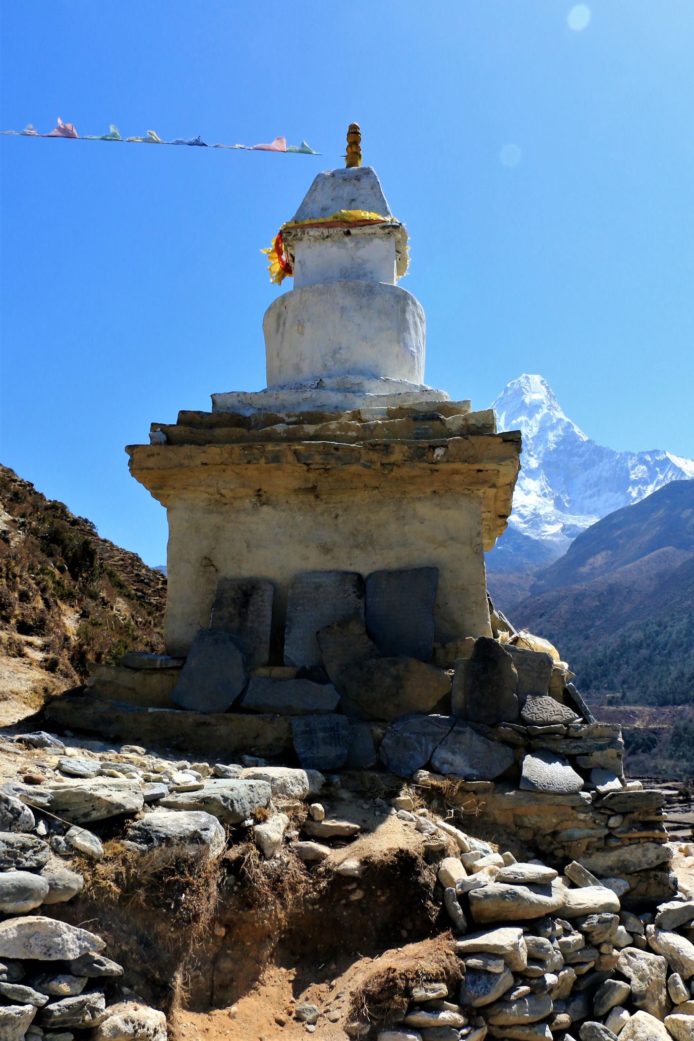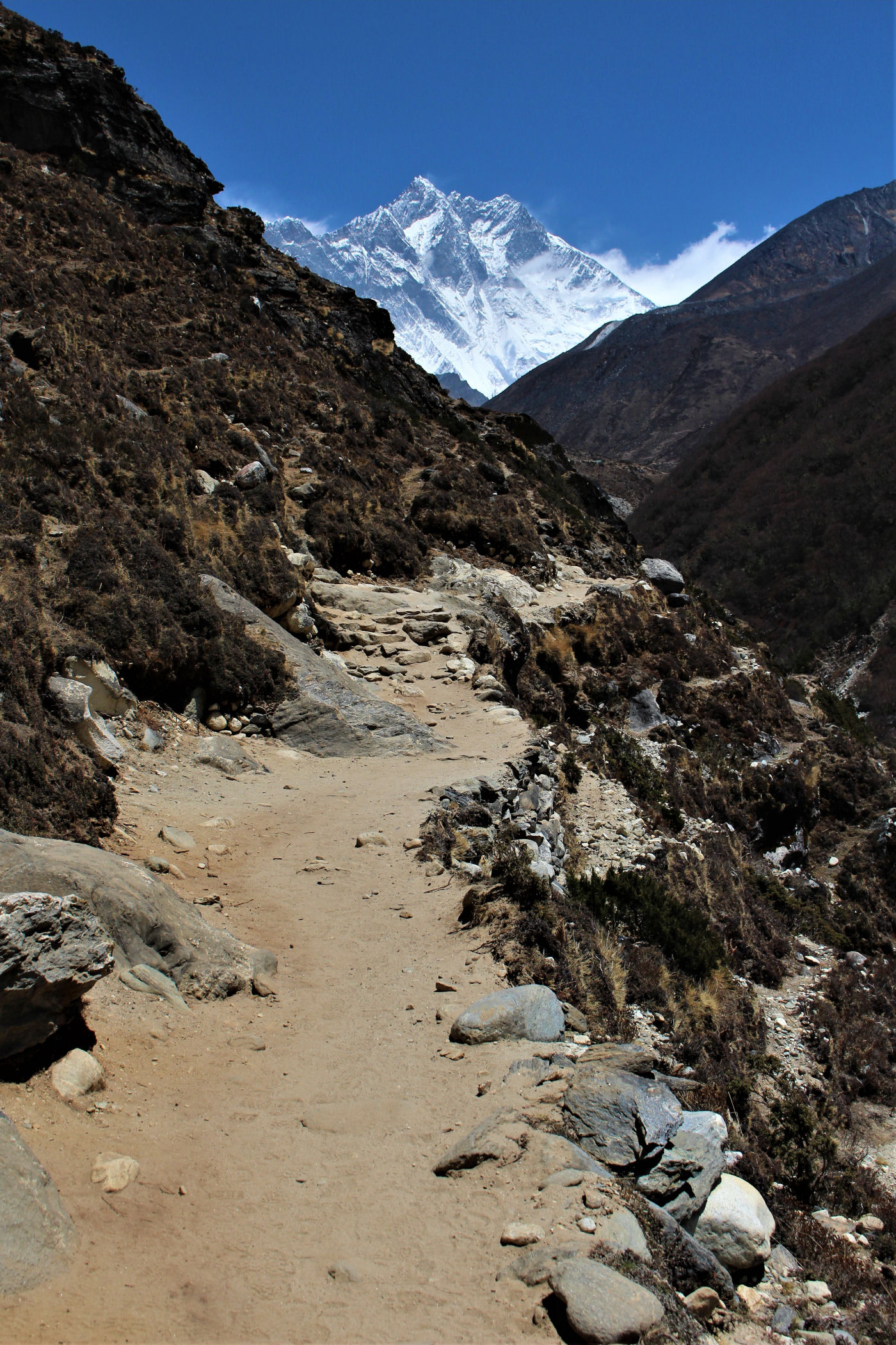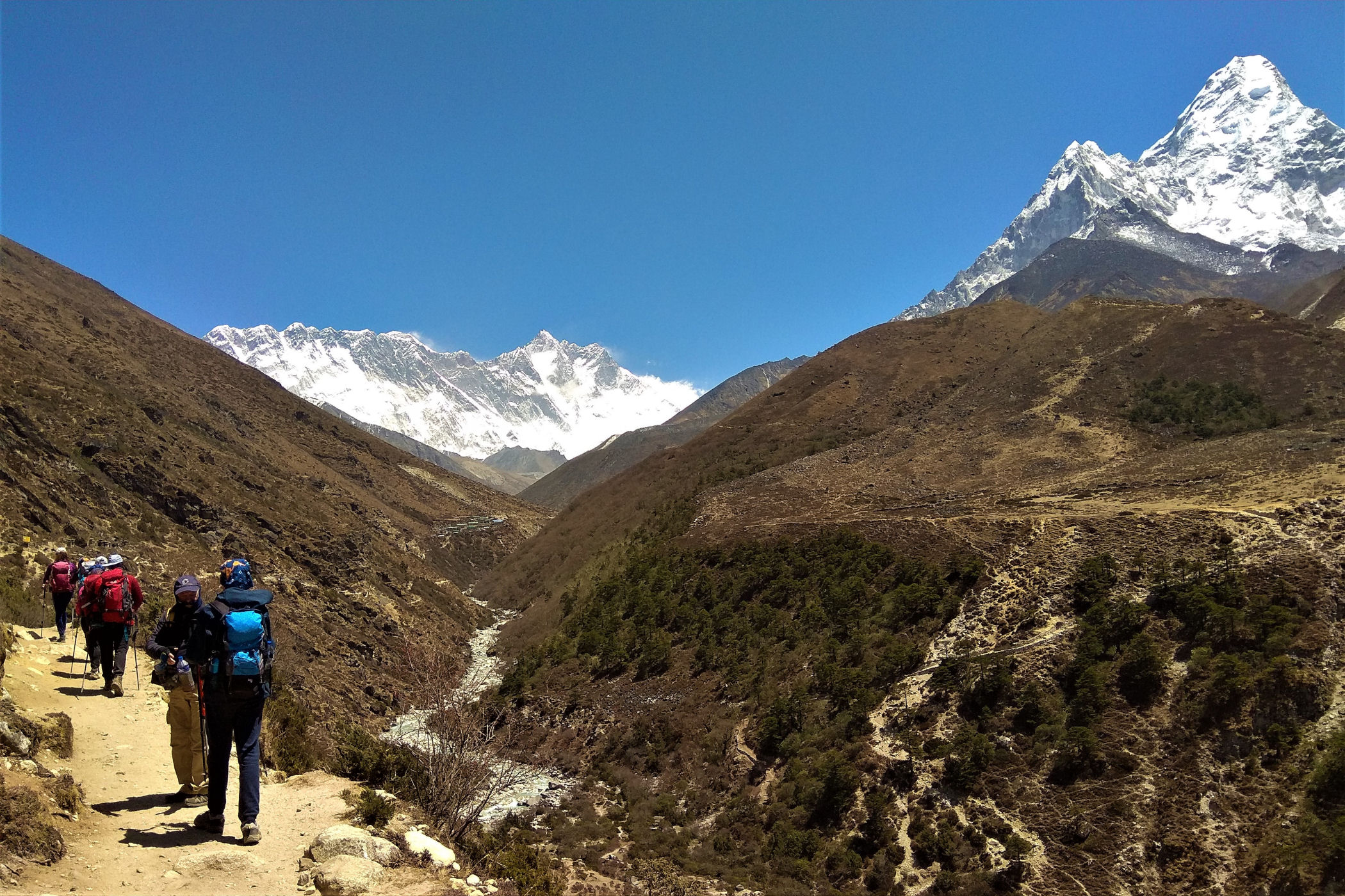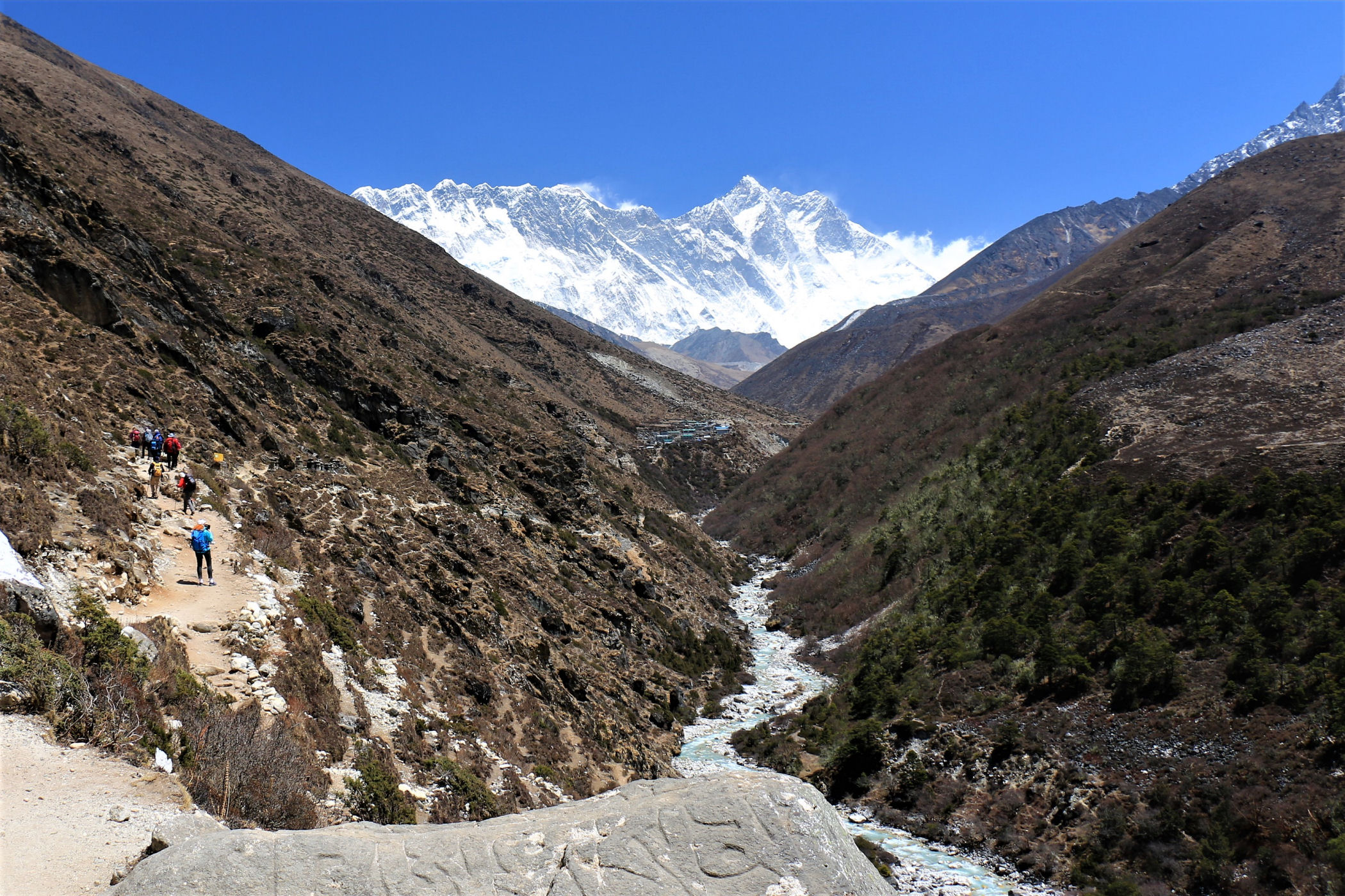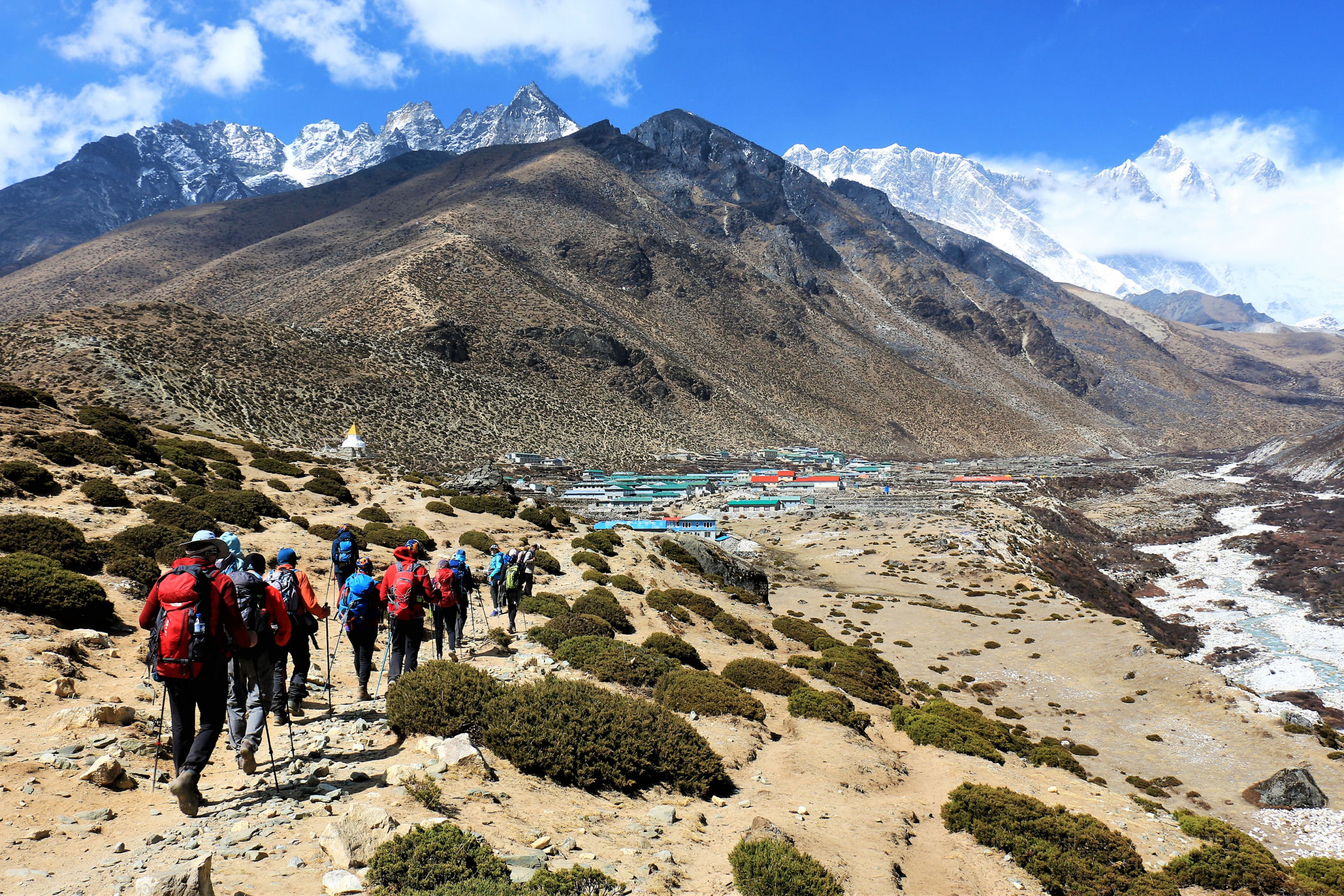 Ostatni odcinek do przejścia jest jeszcze piękniejszy. Krajobraz staje się coraz bardziej surowy, z coraz mniejszą ilością roślinności. W rozwidleniu potoków na białych jak śnieg kamieniach rozgrzanych w słońcu w otoczeniu śnieżnych gigantów i turkusowej wody robimy sobie jeszcze mały odpoczynek, aby potem prosto skierować się już do naszego dzisiejszego celu – Dingboche.