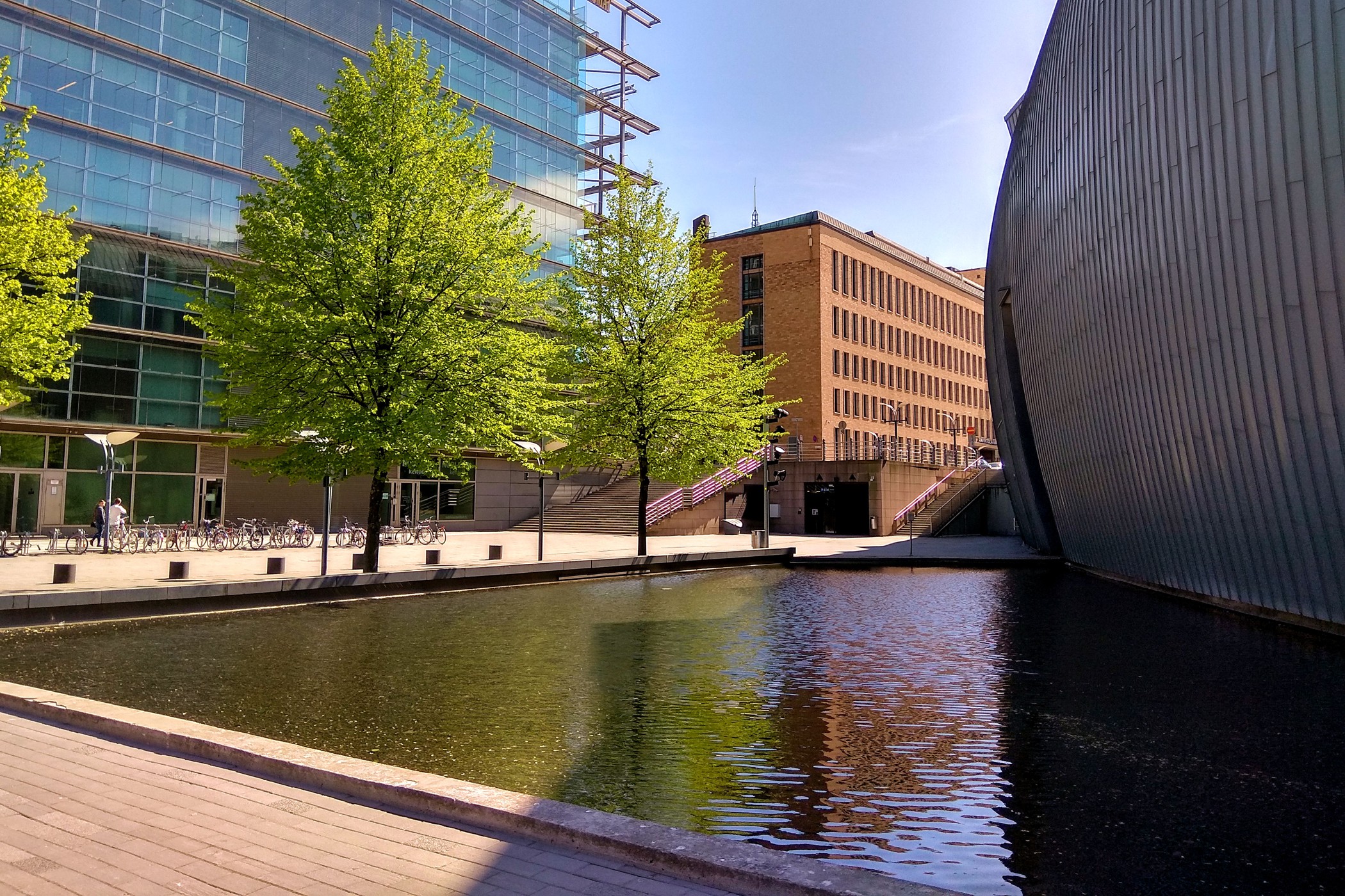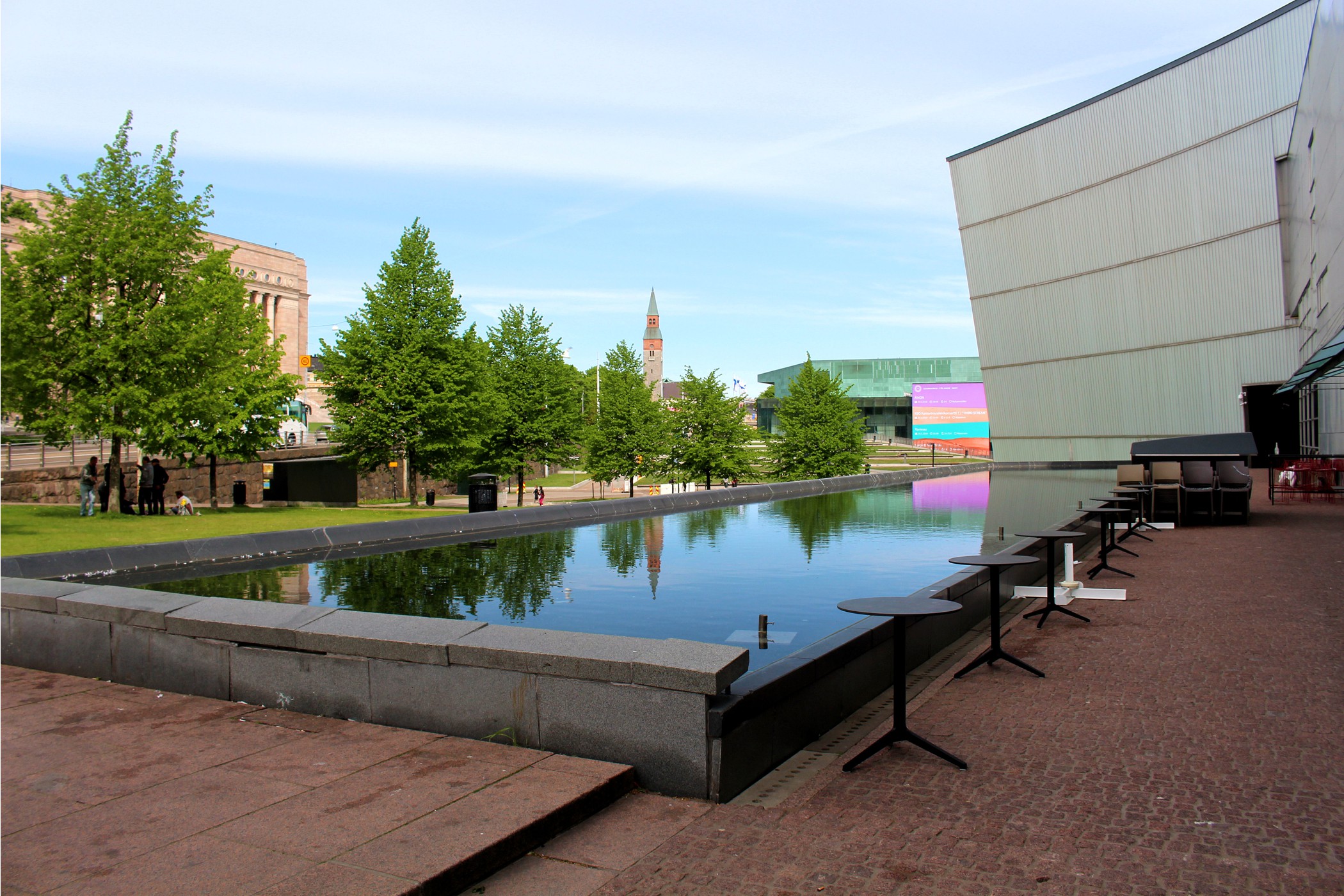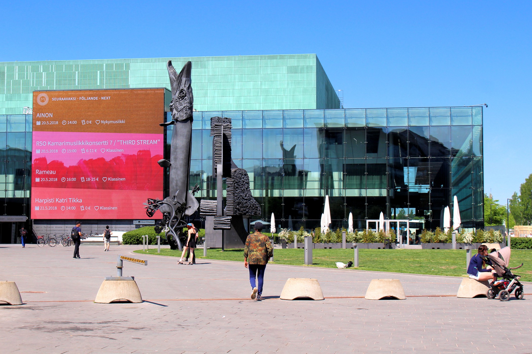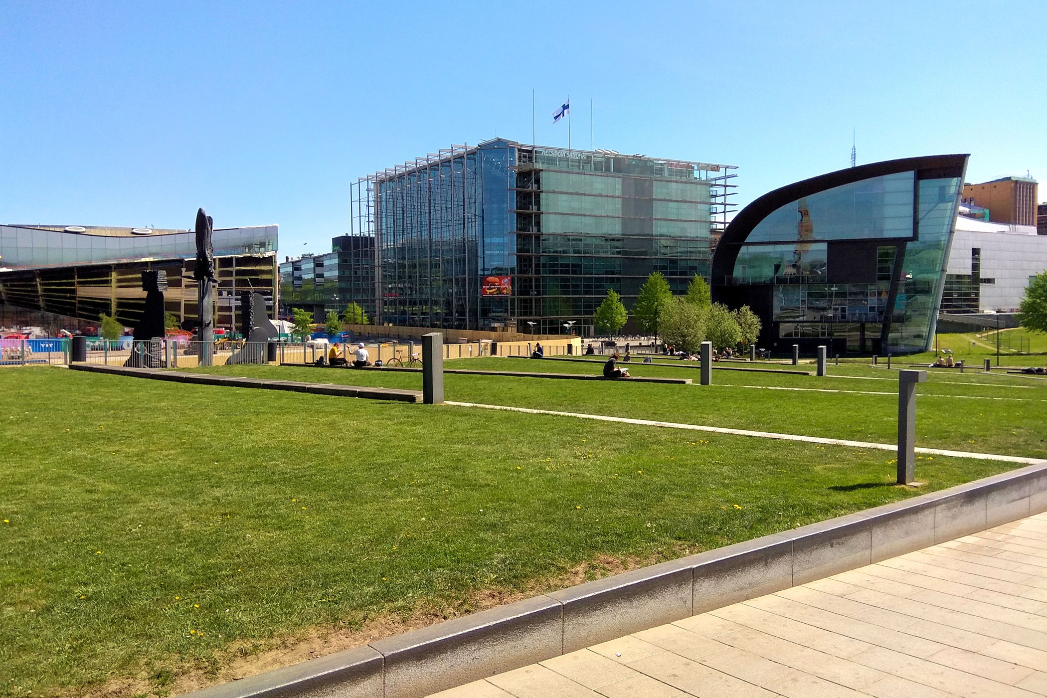 Po drugiej stronie dwupasmowej drogi znajdujemy już bardziej nowoczesną zabudowę. Helsińskie Centrum Muzyki Musiikkitalo to sala koncertowa i centrum muzyczne mieszczące w swoich wnętrzach Akademia Sibeliusa i dwie orkiestry symfoniczne: Fińską Orkiestrę Symfoniczną i Orkiestrę Filharmonii Helsińskiej. Główna sala koncertowa mieści 1,704 osób, ale budynek składa się jeszcze z pięciu mniejszych pomieszczeń: sala kameralna, sala operowa, sala organowa, sala „czarnej skrzynki” na muzykę ze wzmocnieniem elektrycznym i sala prób. Poprzednia sala koncertowa zaprojektowana przez Alvara Aalto, a ukończona w 1971 roku nie miała satysfakcjonującej akustyki, postanowiono więc wybudować nową. Obecna ukończona została i otwarła swoje podwoje dla publiczności w 2011 roku.