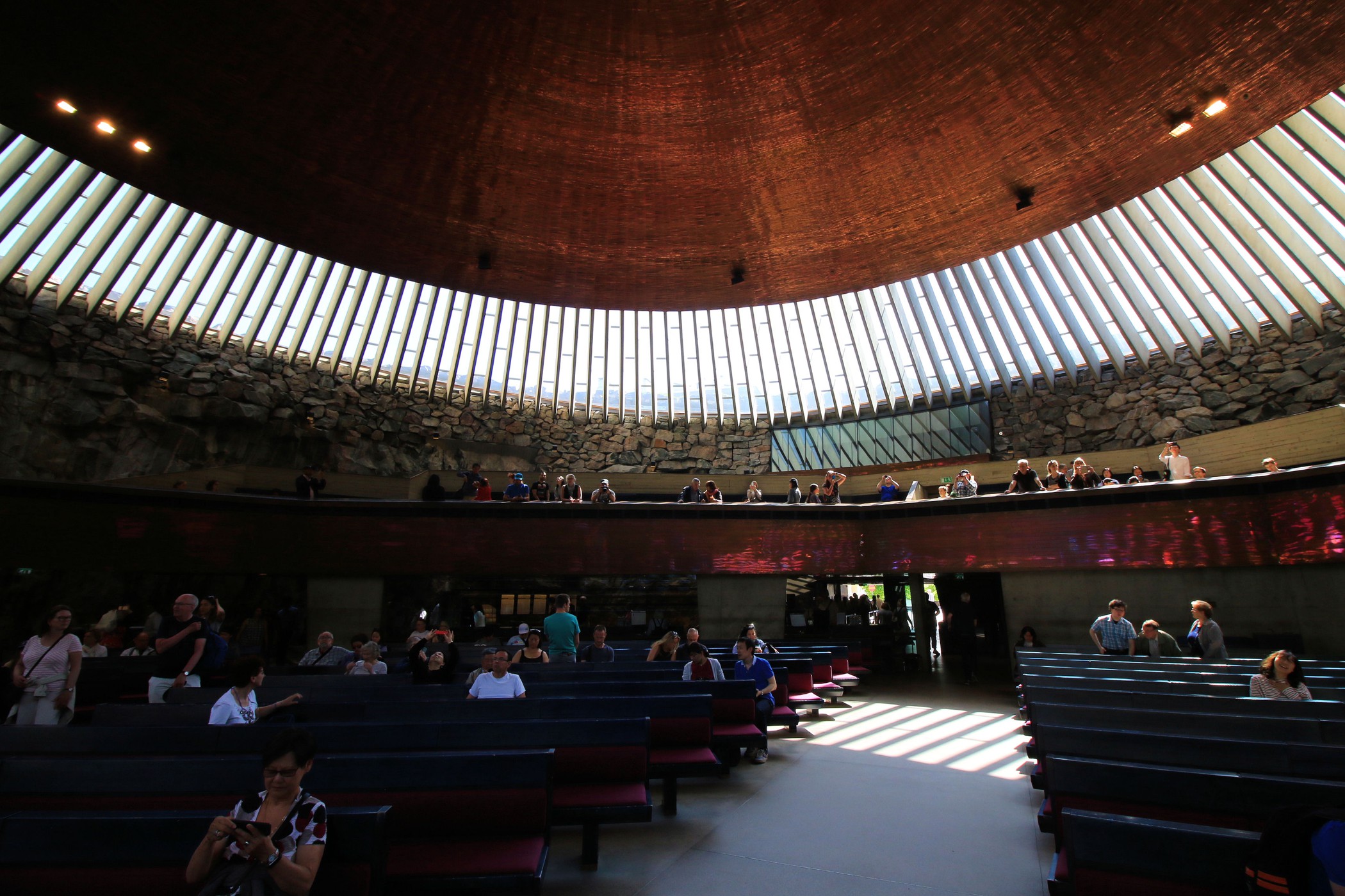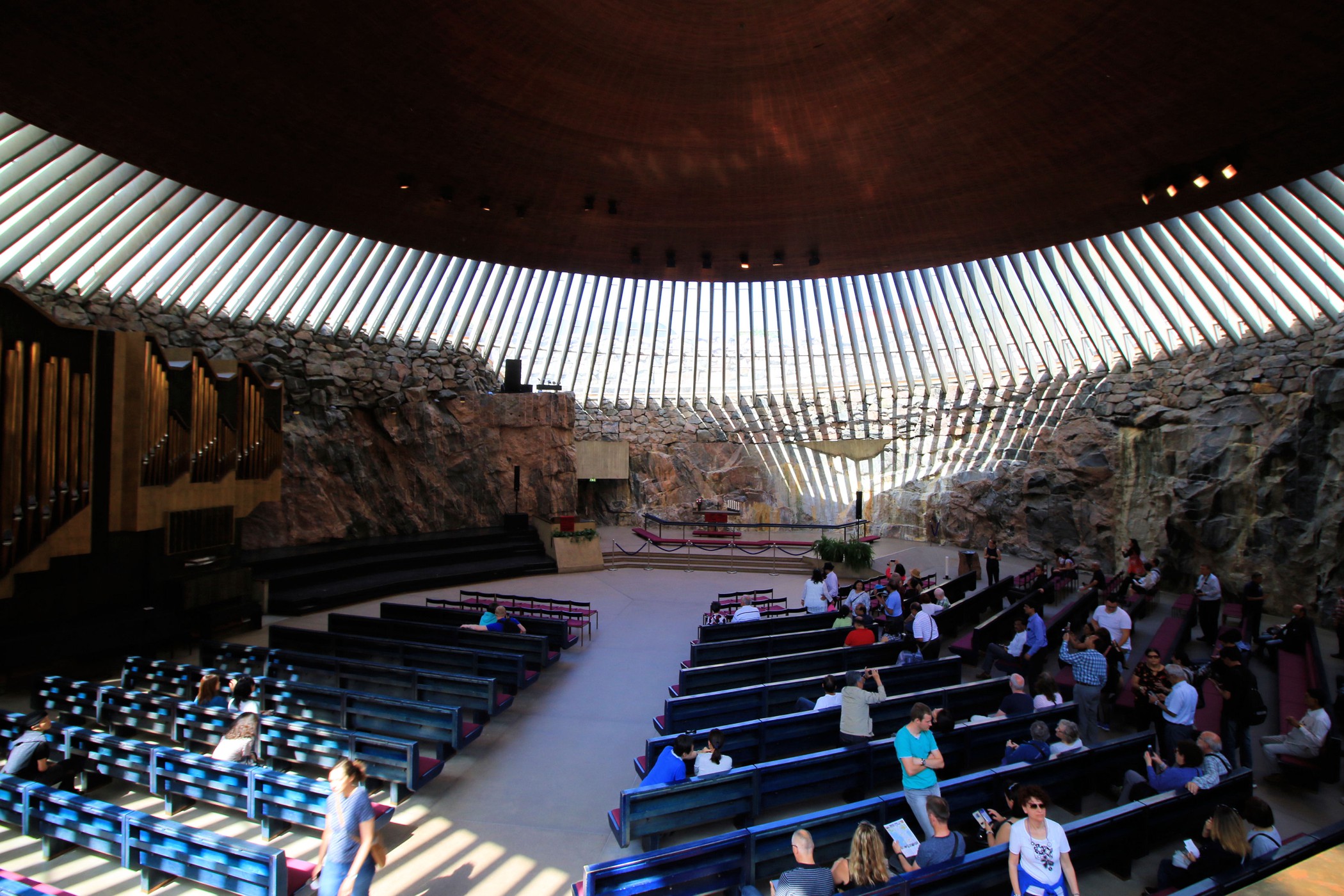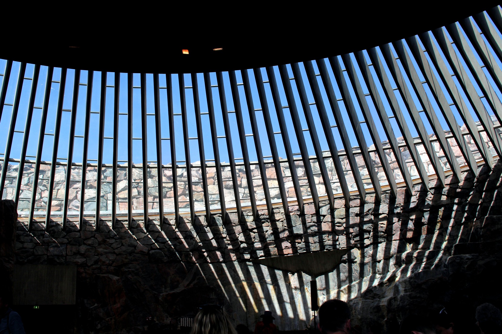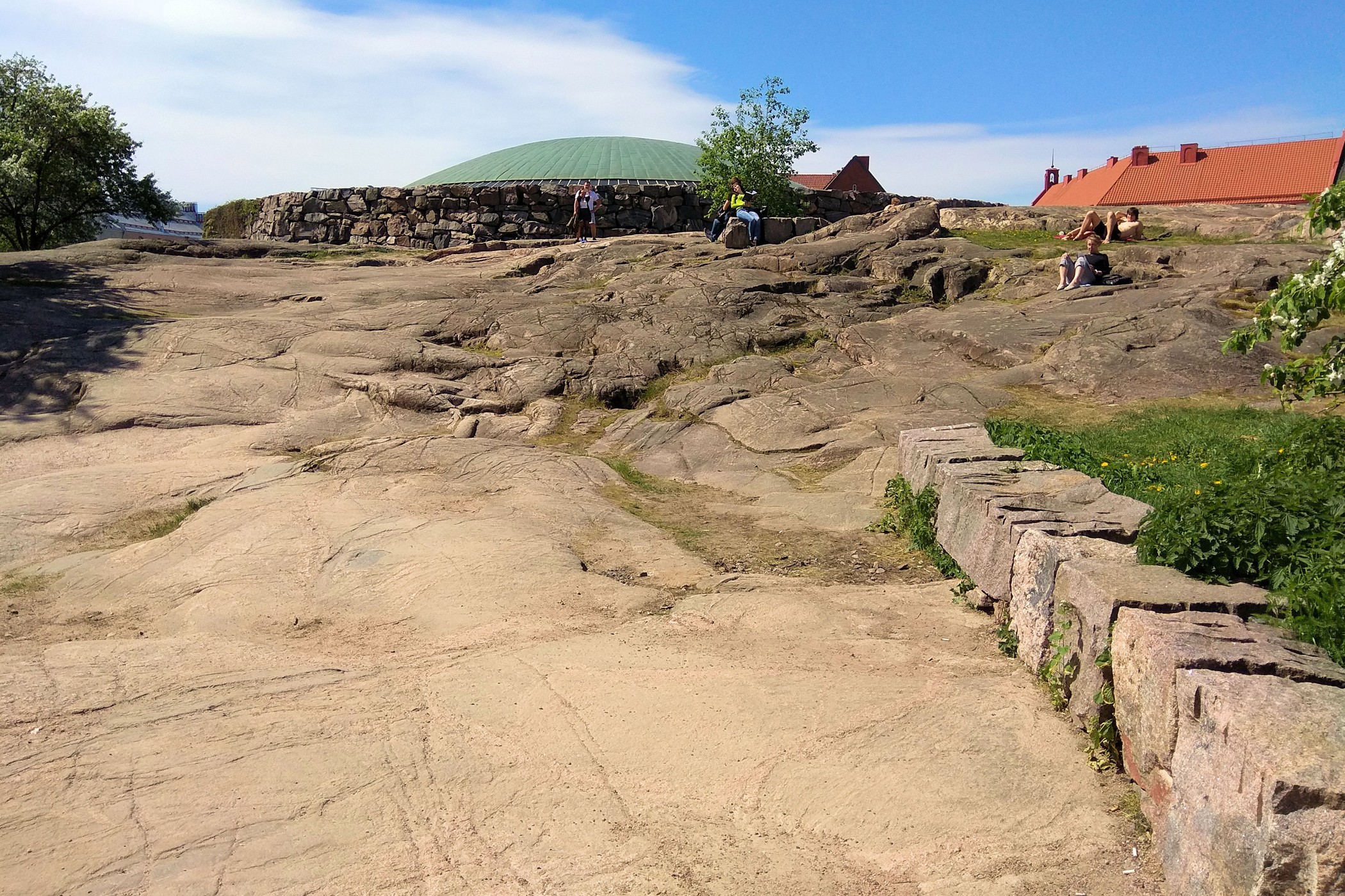 To jeden z najbardziej niesamowitych obiektów Finlandii. Kościół Temppeliaukio, zwany również Skalnym Kościołem, to nowoczesny, podziemny kościół. Zbudowany został w 1969 według projektu braci: Timo i Tuomo Suomalainen. Dzisiaj zaliczyć go można do jednych z najpopularniejszych obiektów architektonicznych, jakie zostały wybudowane na terenie Finlandii, nie tylko wśród budowli nowoczesnych, ale również i historycznych. Kościół powstał wewnątrz masywnych, granitowych skał, które stanowią naturalne ściany wewnętrzne. Na zewnątrz widoczna jest tylko miedziana kopuła wystająca ponad skały. My trafiamy tu na początku podczas mszy, turyści nie mają wtedy prawa wstępu. Wracamy więc ponownie, aby obejrzeć kościół od środka. Ma on ponoć niesamowitą akustykę – niestety nie mieliśmy przyjemności, aby uczestniczyć tu w jakimś koncercie. Jest koniec maja, straszny (jak na Finlandię) upał, ale dość kontrowersyjnie wyglądają tu okoliczni mieszkańcy wylegujący się na skałach w strojach kąpielowych na „dachu” jak by nie było kościoła.
