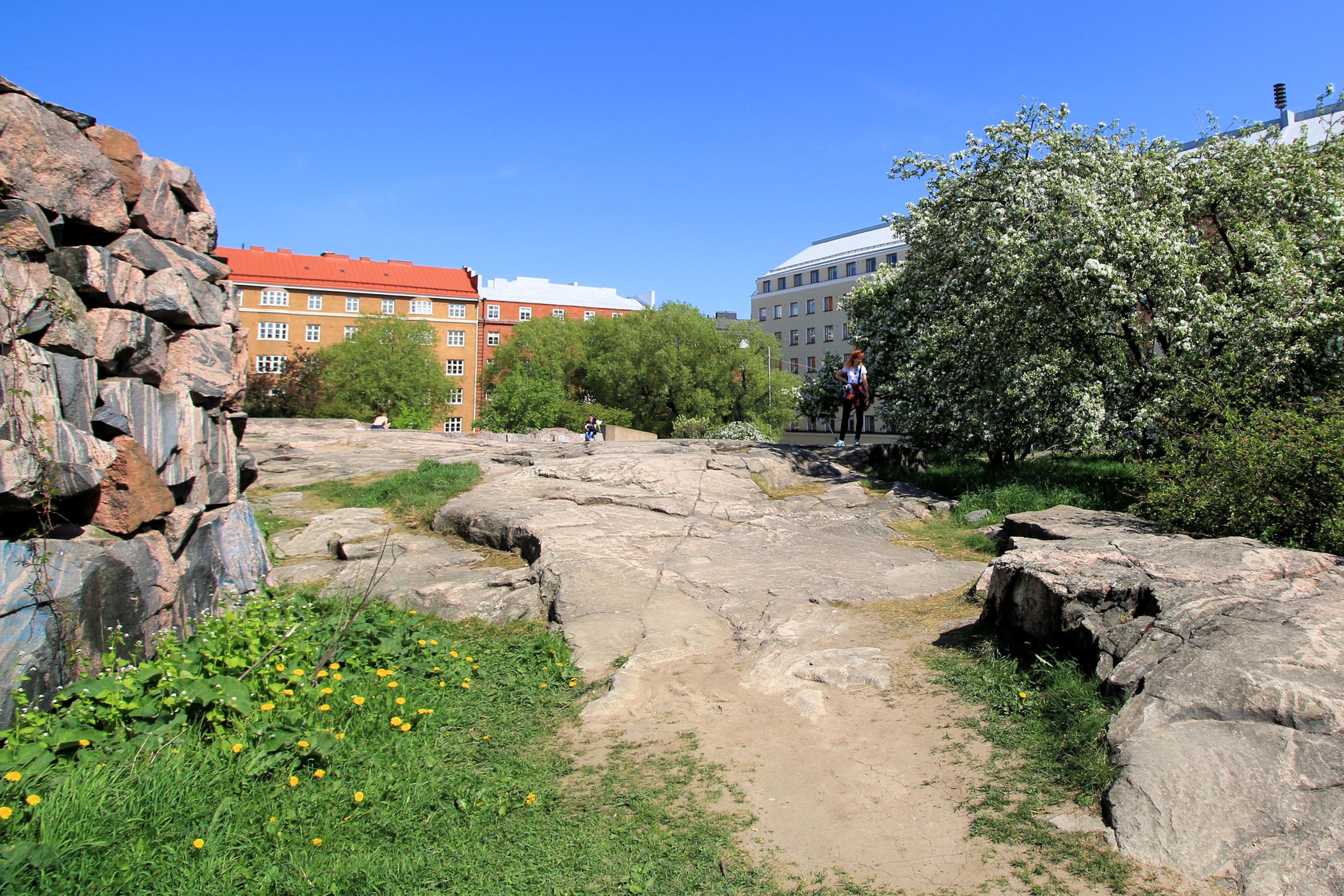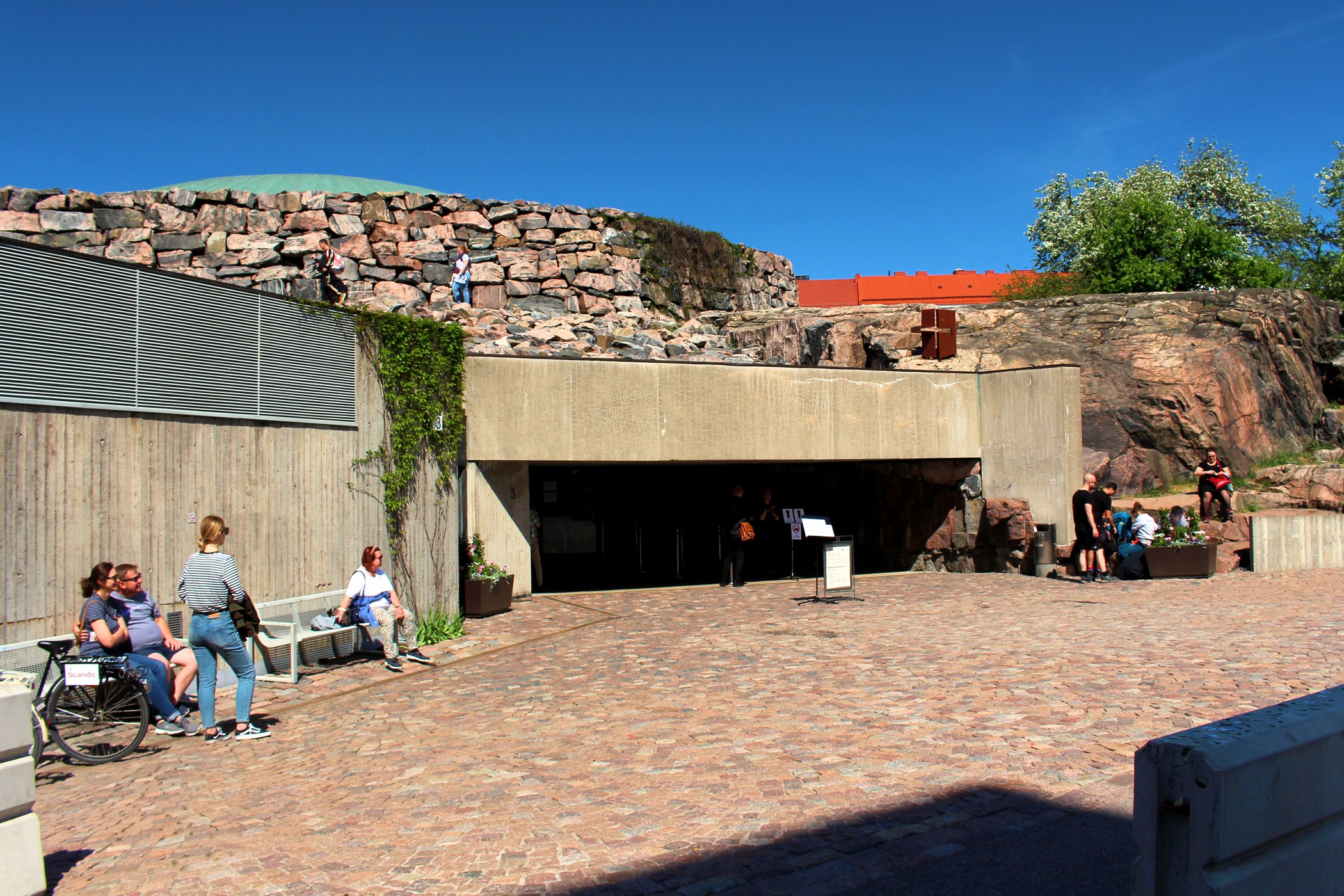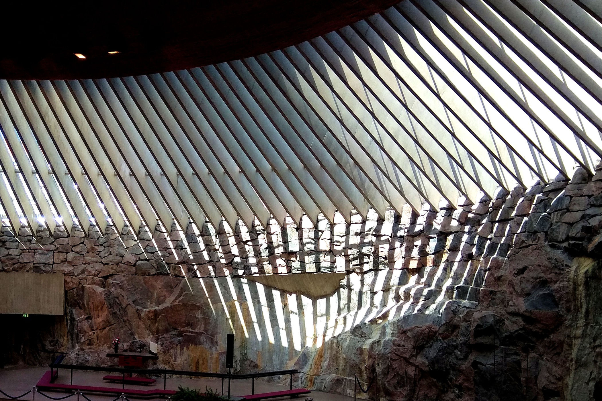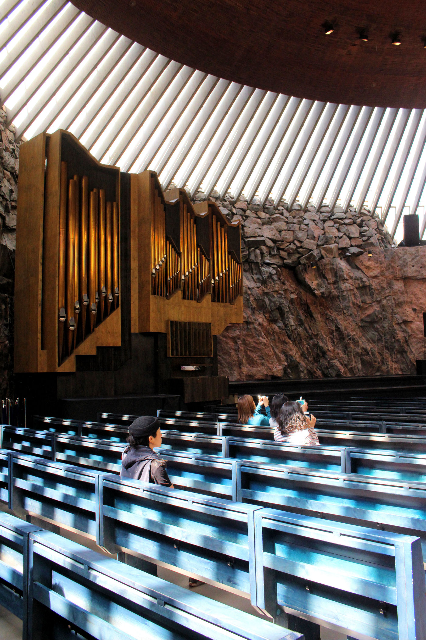 To jeden z najbardziej niesamowitych obiektów Finlandii. Kościół Temppeliaukio, zwany również Skalnym Kościołem, to nowoczesny, podziemny kościół. Zbudowany został w 1969 według projektu braci: Timo i Tuomo Suomalainen. Dzisiaj zaliczyć go można do jednych z najpopularniejszych obiektów architektonicznych, jakie zostały wybudowane na terenie Finlandii, nie tylko wśród budowli nowoczesnych, ale również i historycznych. Kościół powstał wewnątrz masywnych, granitowych skał, które stanowią naturalne ściany wewnętrzne. Na zewnątrz widoczna jest tylko miedziana kopuła wystająca ponad skały. My trafiamy tu na początku podczas mszy, turyści nie mają wtedy prawa wstępu. Wracamy więc ponownie, aby obejrzeć kościół od środka. Ma on ponoć niesamowitą akustykę – niestety nie mieliśmy przyjemności, aby uczestniczyć tu w jakimś koncercie. Jest koniec maja, straszny (jak na Finlandię) upał, ale dość kontrowersyjnie wyglądają tu okoliczni mieszkańcy wylegujący się na skałach w strojach kąpielowych na „dachu” jak by nie było kościoła.