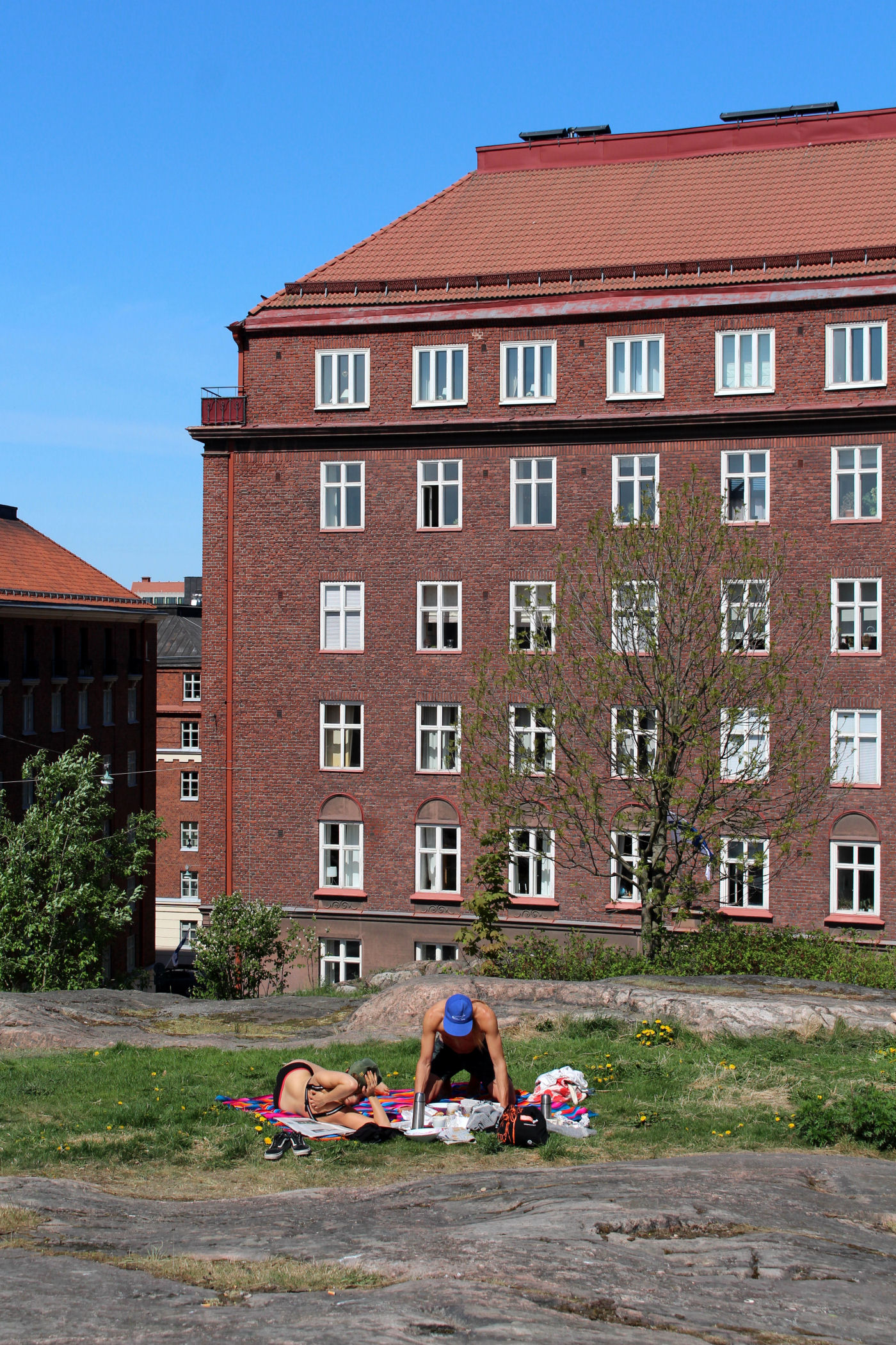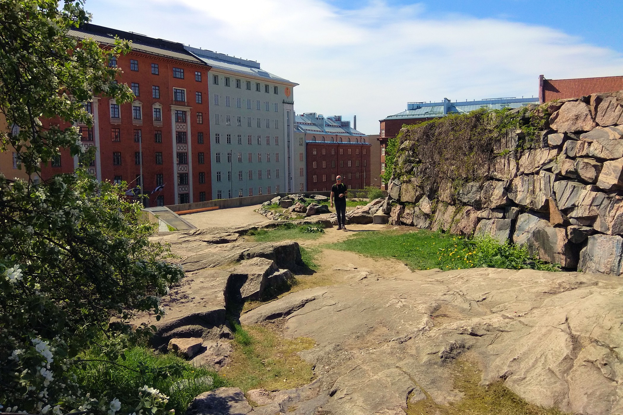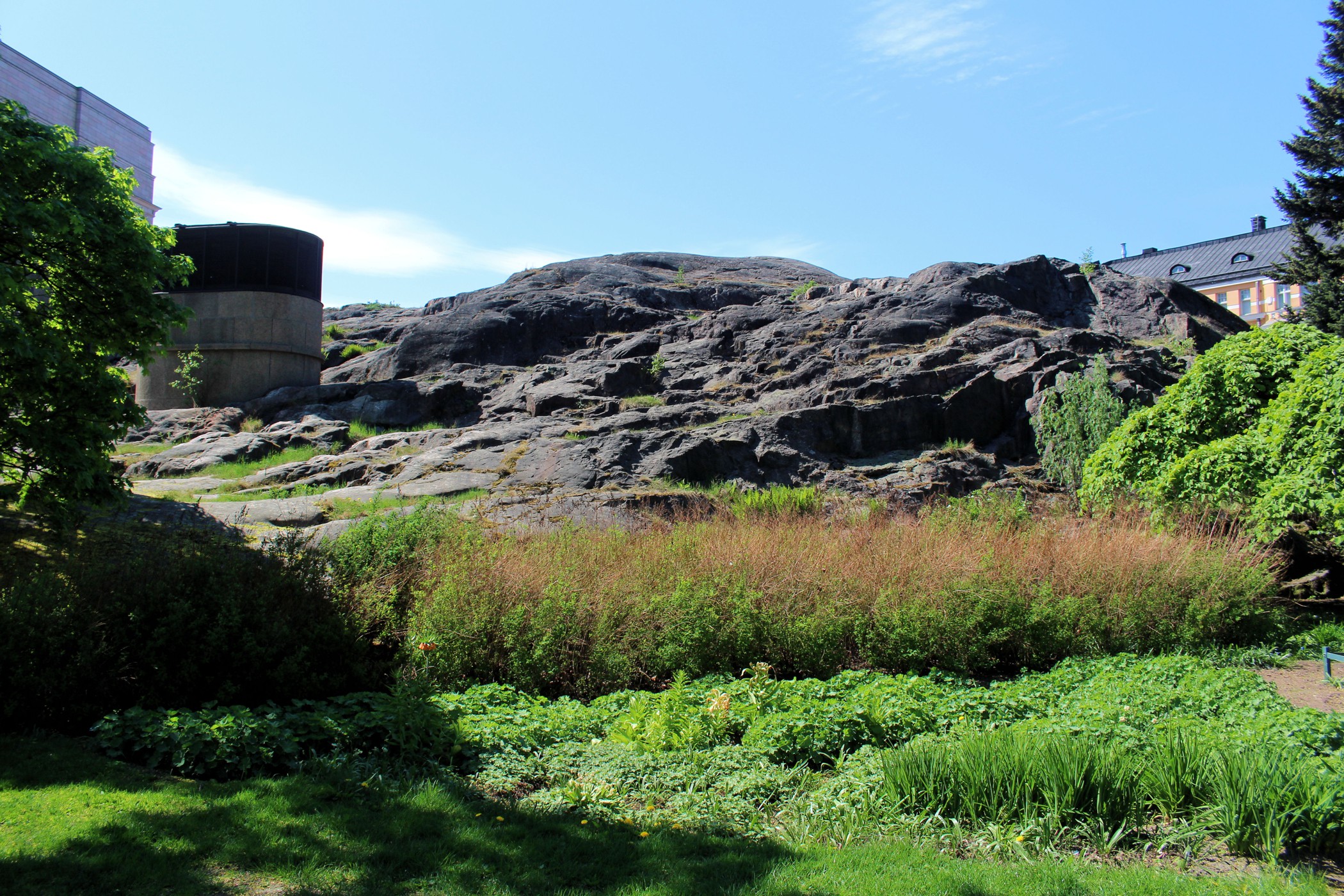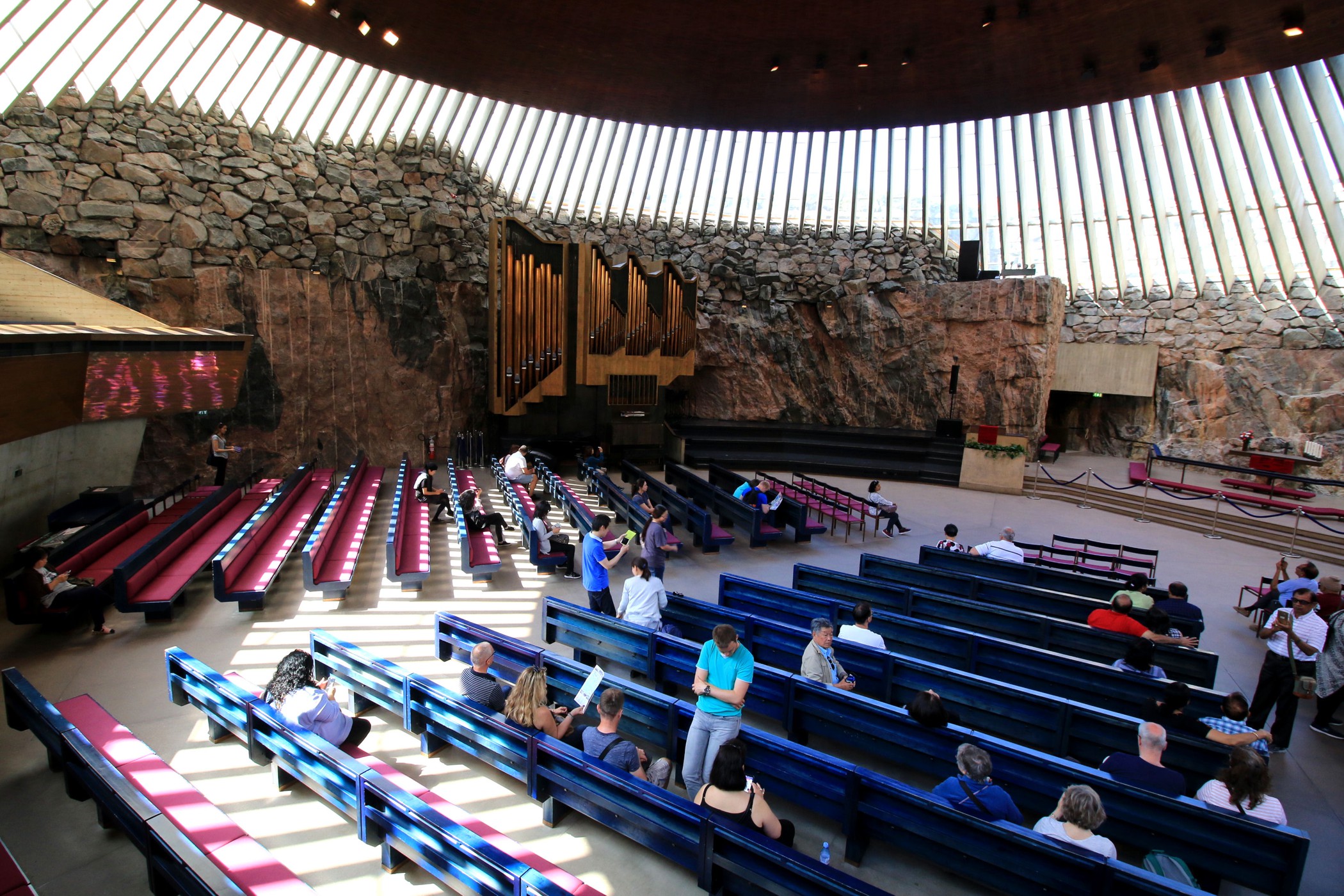 To jeden z najbardziej niesamowitych obiektów Finlandii. Kościół Temppeliaukio, zwany również Skalnym Kościołem, to nowoczesny, podziemny kościół. Zbudowany został w 1969 według projektu braci: Timo i Tuomo Suomalainen. Dzisiaj zaliczyć go można do jednych z najpopularniejszych obiektów architektonicznych, jakie zostały wybudowane na terenie Finlandii, nie tylko wśród budowli nowoczesnych, ale również i historycznych. Kościół powstał wewnątrz masywnych, granitowych skał, które stanowią naturalne ściany wewnętrzne. Na zewnątrz widoczna jest tylko miedziana kopuła wystająca ponad skały. My trafiamy tu na początku podczas mszy, turyści nie mają wtedy prawa wstępu. Wracamy więc ponownie, aby obejrzeć kościół od środka. Ma on ponoć niesamowitą akustykę – niestety nie mieliśmy przyjemności, aby uczestniczyć tu w jakimś koncercie. Jest koniec maja, straszny (jak na Finlandię) upał, ale dość kontrowersyjnie wyglądają tu okoliczni mieszkańcy wylegujący się na skałach w strojach kąpielowych na „dachu” jak by nie było kościoła.