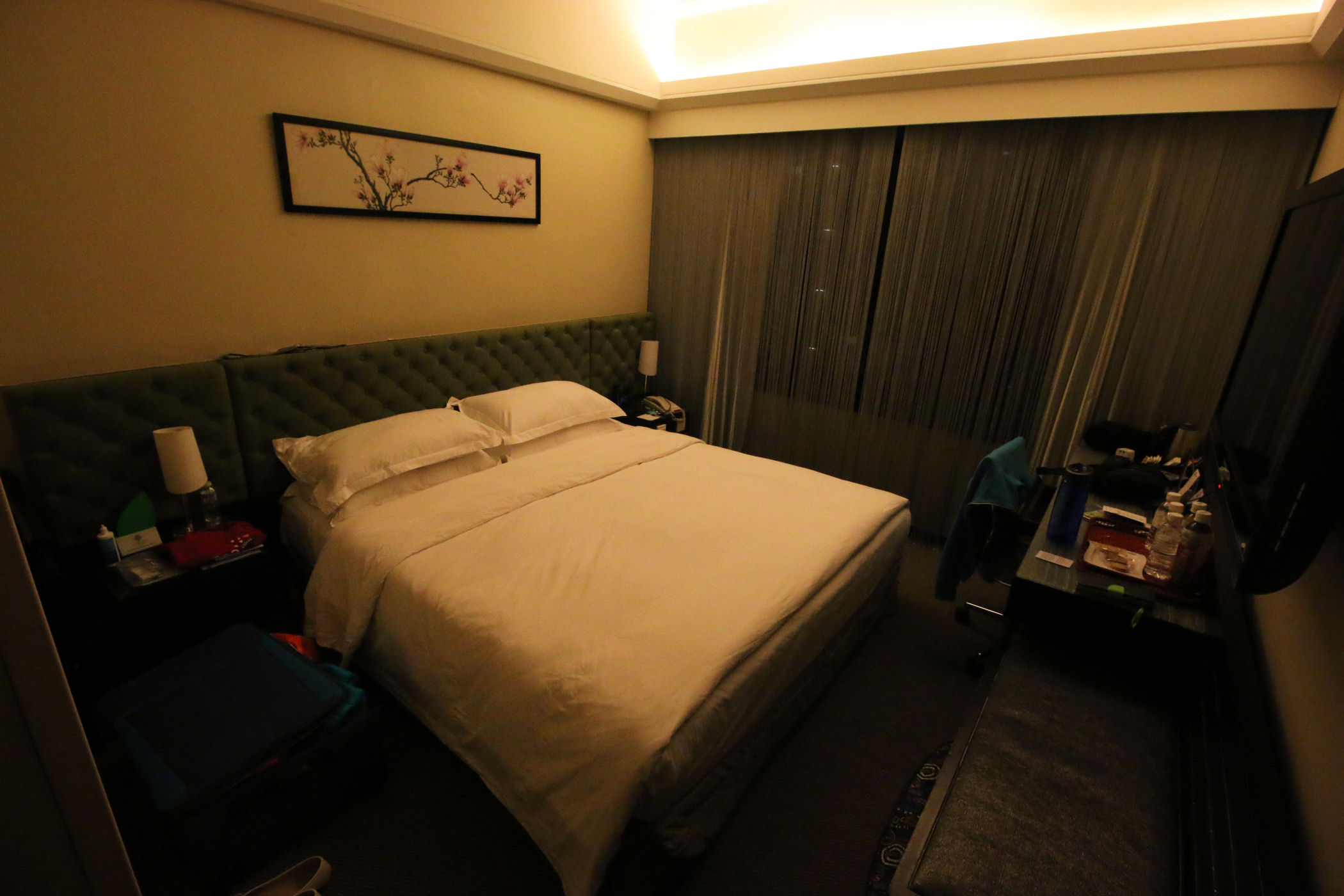 Rezerwację mieliśmy w niższej klasy hotelu, ale w ostatniej chwili przed Świętami Bożego Narodzenia ceny tak drastycznie spadły, że zmieniliśmy na ten hotel. Empire Hotel Hong Kong to wysoki na kilkadziesiąt pięter obiekt wciśnięty między inne wysokościowce przy tej ulicy Hennesy. Wygodne pokoje, duże łazienki, niestety tylko 2-osobowe, musieliśmy więc zarezerwować dla naszej trójki dwa. Widok z okien na ulicę taki jak na zdjęciach.