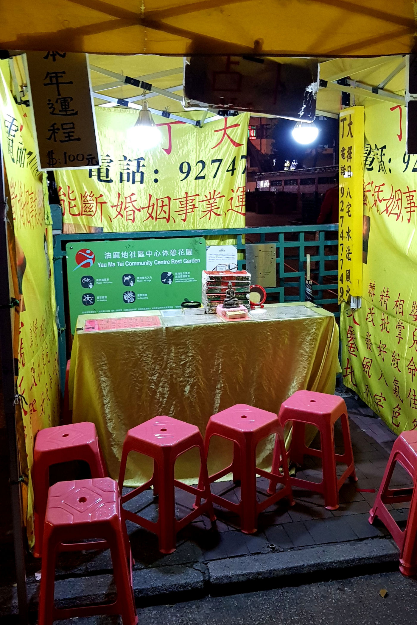 Zanim miniemy charakterystyczną czerwoną bramę prowadząca na Temple Street przechodzimy obok dziesiątek namiotów. Okazuje się, że wieczorami rozkładają tu swoje gabinetu wróżbici i uzdrowiciele. Niektóre namioty wglądają bardzo profesjonalnie, a wręcz wiarygodnie .