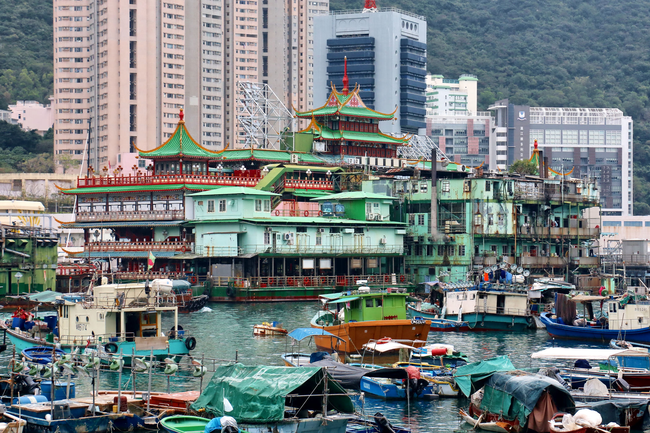 Pływająca restauracja Jumbo została założona w październiku 1976 r. przez ojca Ho, potentata kasyna w Makau Stanley Ho Hung-sun. Zbudowana jest w stylu pałacu z dynastii Ming, a wykończona ręcznie co trwało aż 4 lata. JUMBO ma 79 metrów długości i 3 pietra. Restauracja może pomieścić jednocześnie ponad 2000 gości. Ale to tylko 1 z części królestwa Jumbo, w skład którego wchodzi także siostrzana restauracja Tai Pak (z 1952 r.), Barka na zbiorniki z owocami morza, łódź kuchenna i osiem małych promów do transportu gości z dwóch pobliskich promenad. Restauracja pojawiła się w wielu międzynarodowych filmach (Jamesa Bonda „Człowiek ze złotym pistoletem” i „Obrońca” Jackie Chana), a odwiedzili ją nawet Królowa Elżbieta II, Tom Cruise i Chow Yun Fat.