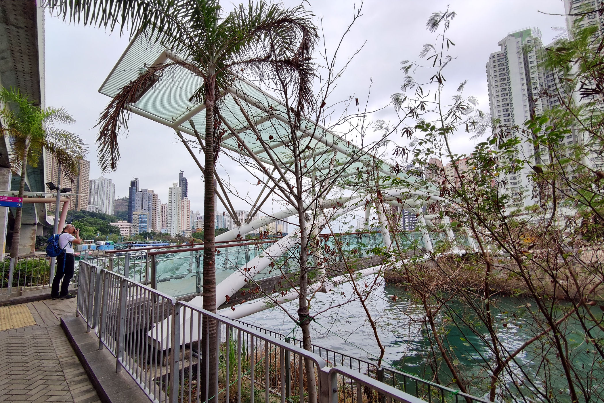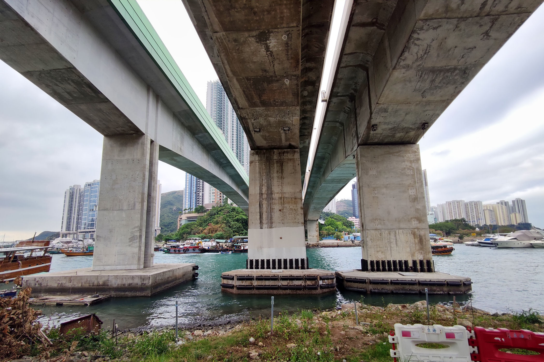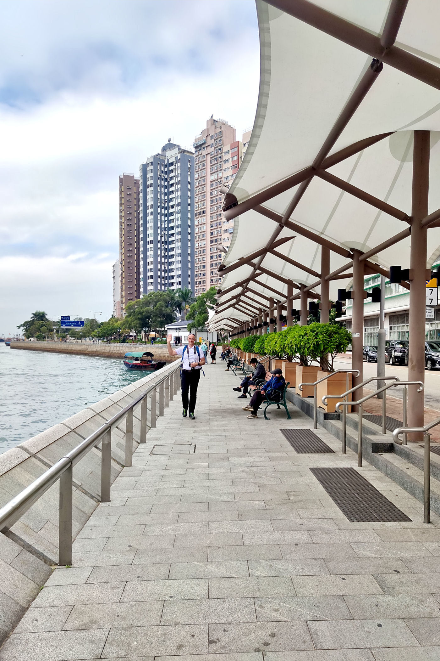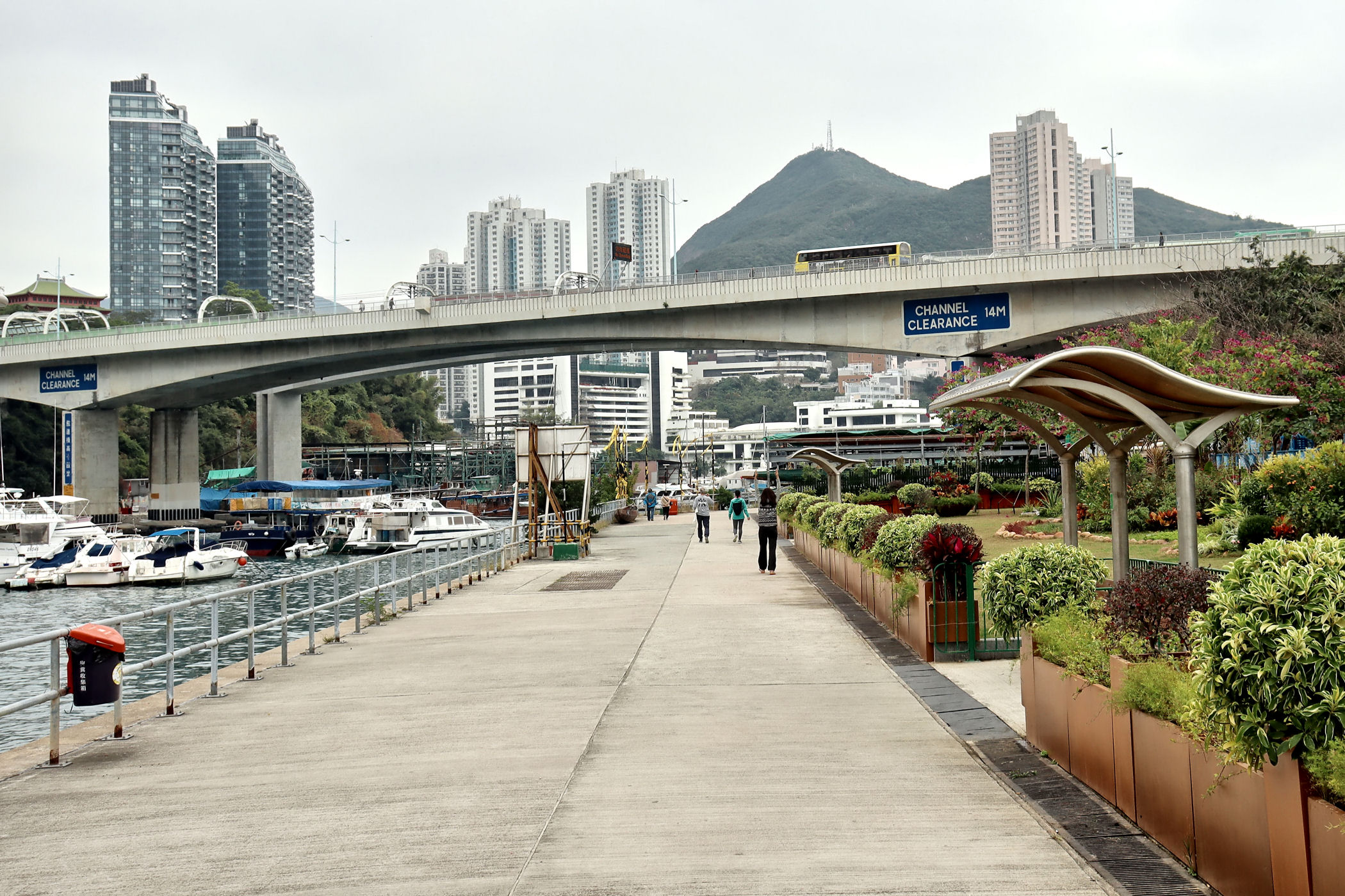 Teraz kierujemy się promenadą wyspy w kierunku zachodnim . Przechodzimy pod ogromnym mostem i idziemy wzdłuż Parku Lei Chau.