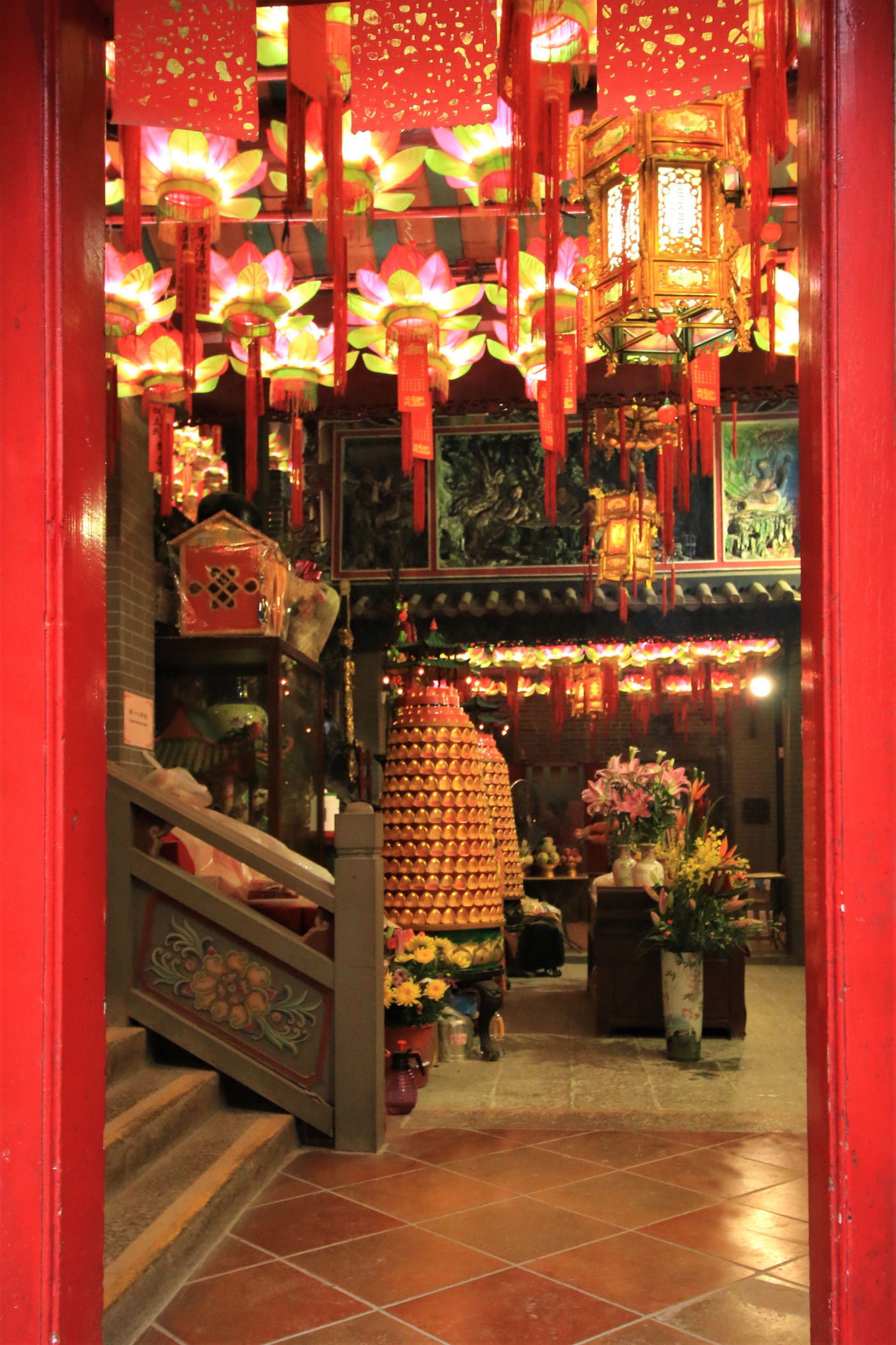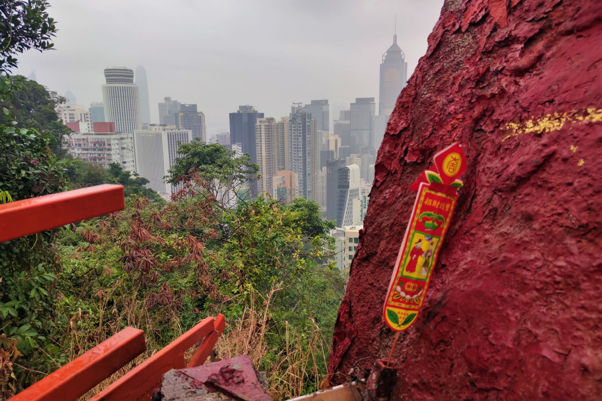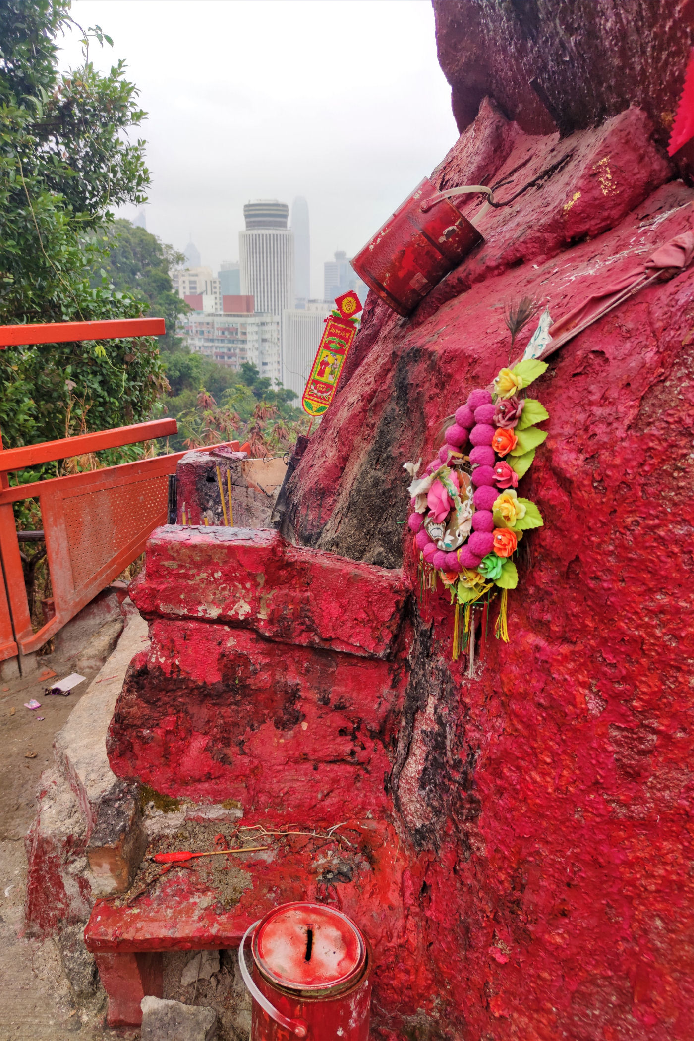 Teraz kierujemy się wąskimi schodkami w górę ponad dzielnicę Wan Chai. Warto się troszkę wysilić, aby obejrzeć dzielnicę z góry, nawet w deszczu. Lovers’ Rock to wymalowana na czerwono skała stanowiąca świetny punkt widokowy. Niestety nie udało mi się odnaleźć informacji skąd wzięła się nazwa i jakie historie opowiada to miejsce.