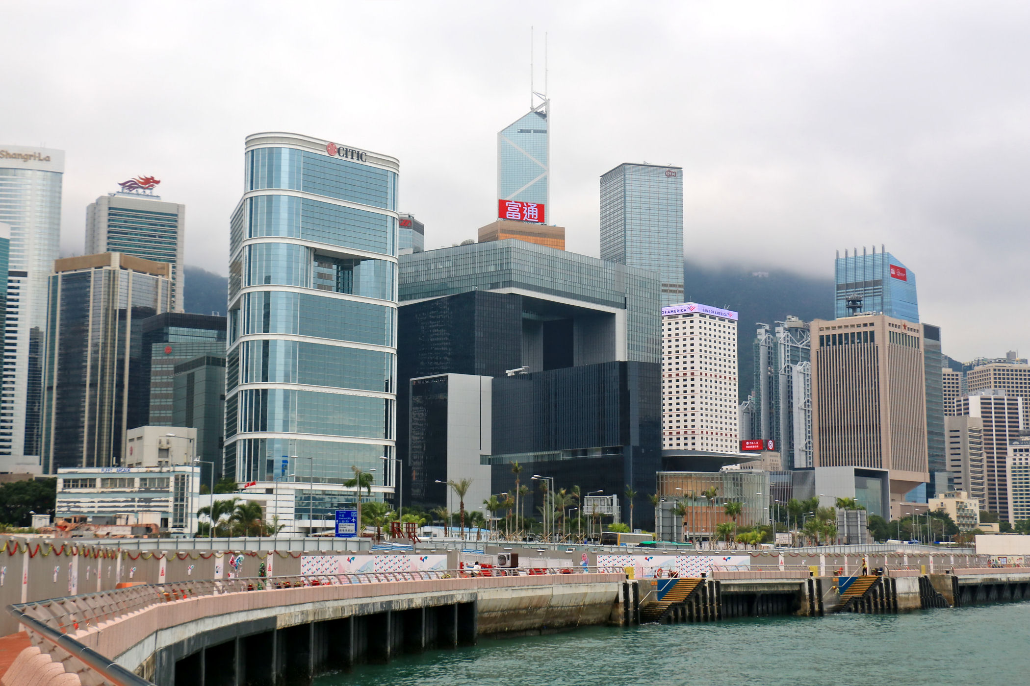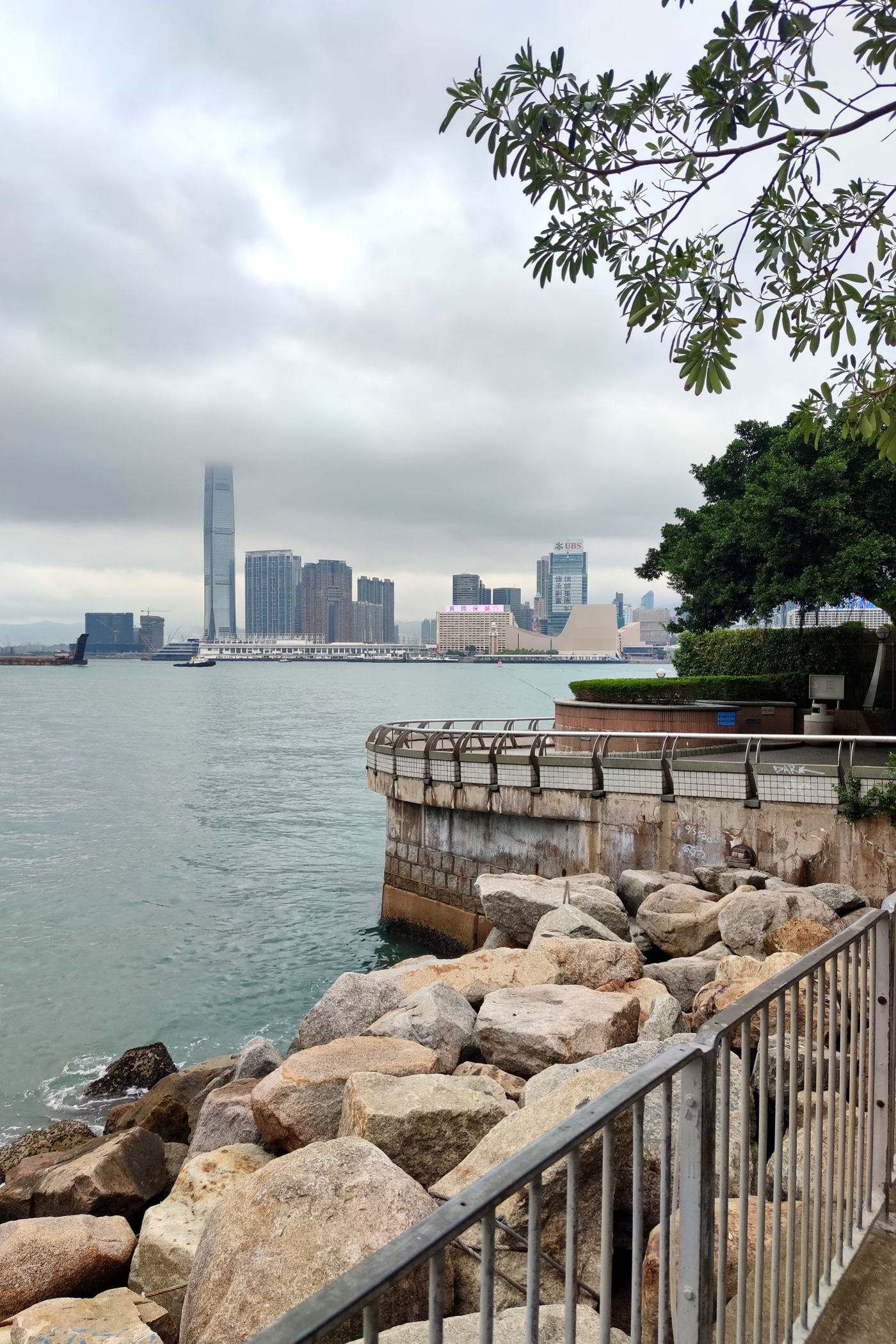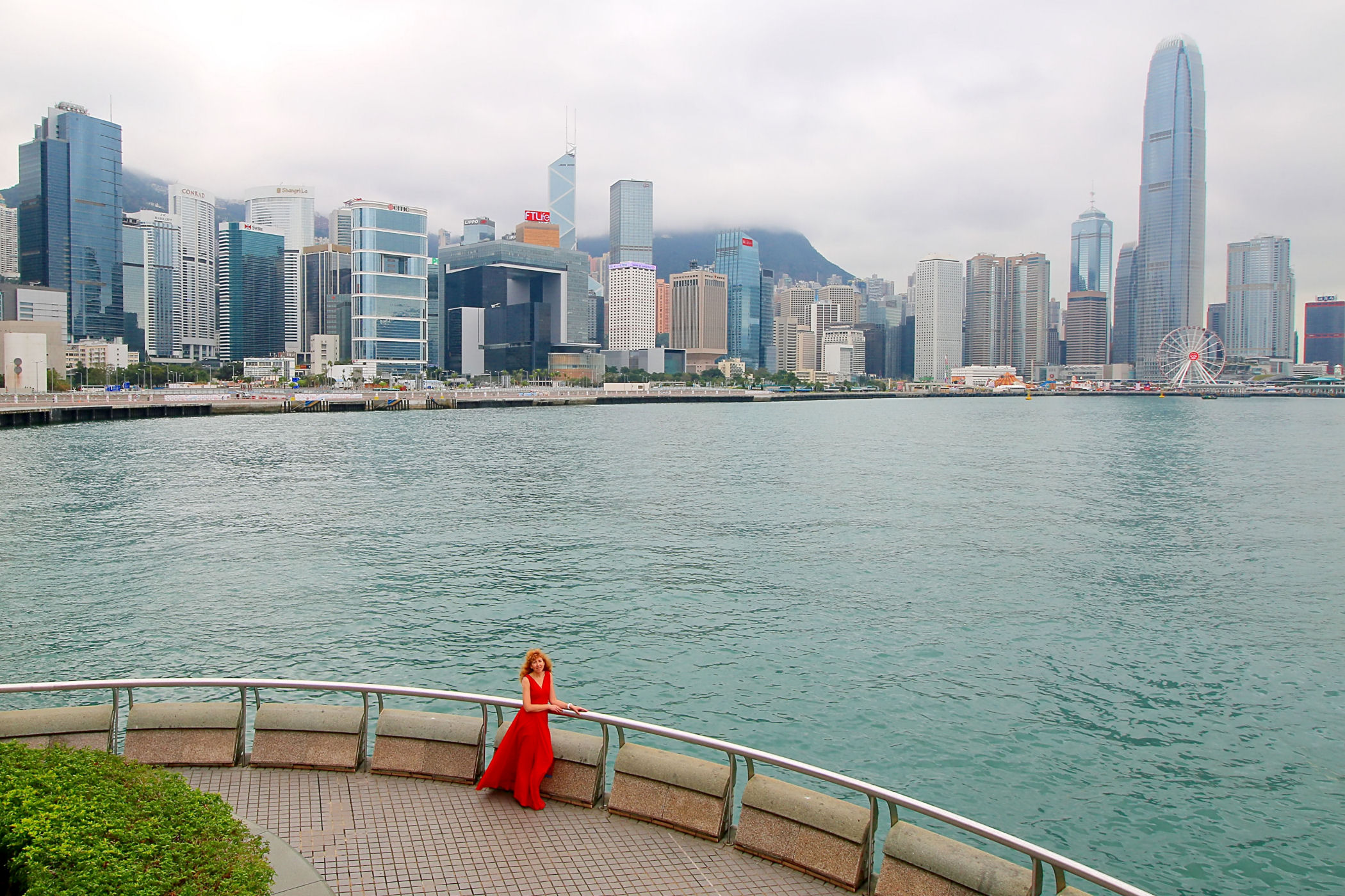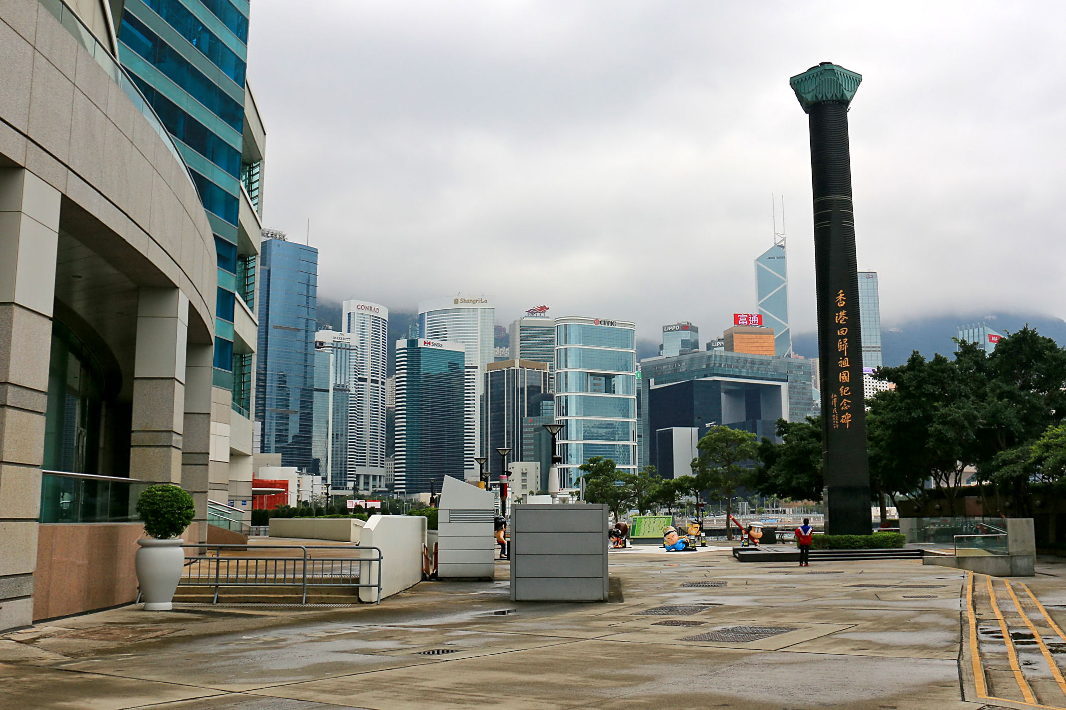 Przy centrum zaczyna się promenada ciągnąca się w kierunku zachodnim aż do Observation Wheel i Martime Museum. Oto mały jej fragment przy samym placu Golden Bauhinia Square, od zachodniej strony centrum i kawałek dalej. Roztacza się stąd piękna panorama zabudowy drugiego brzegu – dzielnicy TSIM SHA TSUI, a także centrum Wyspy Hongkong.