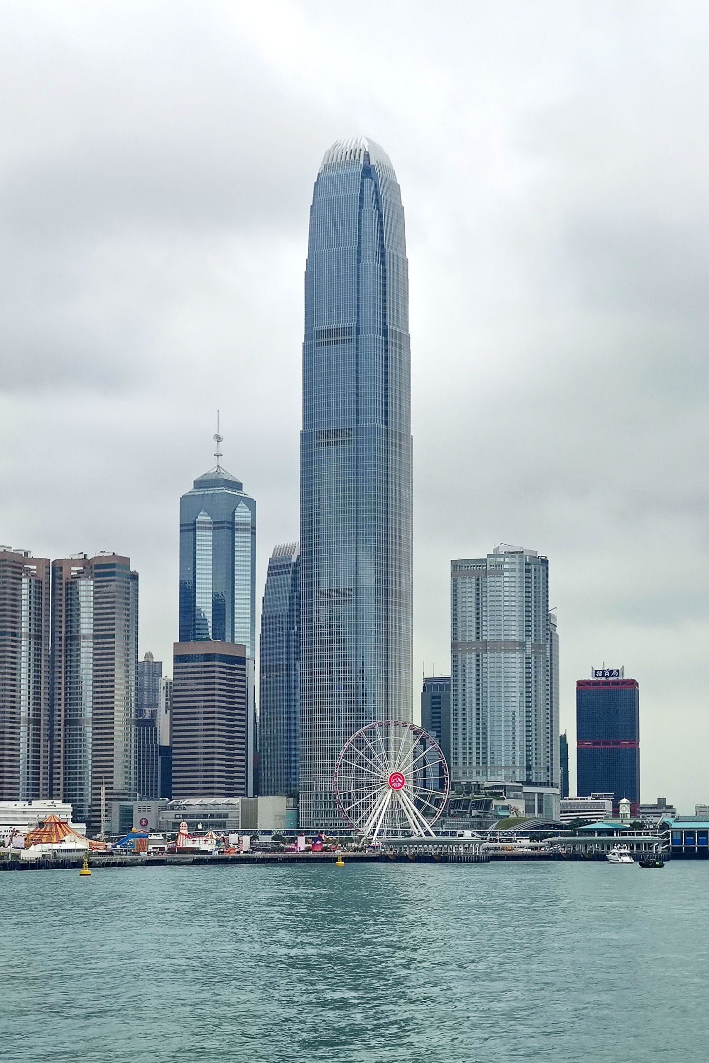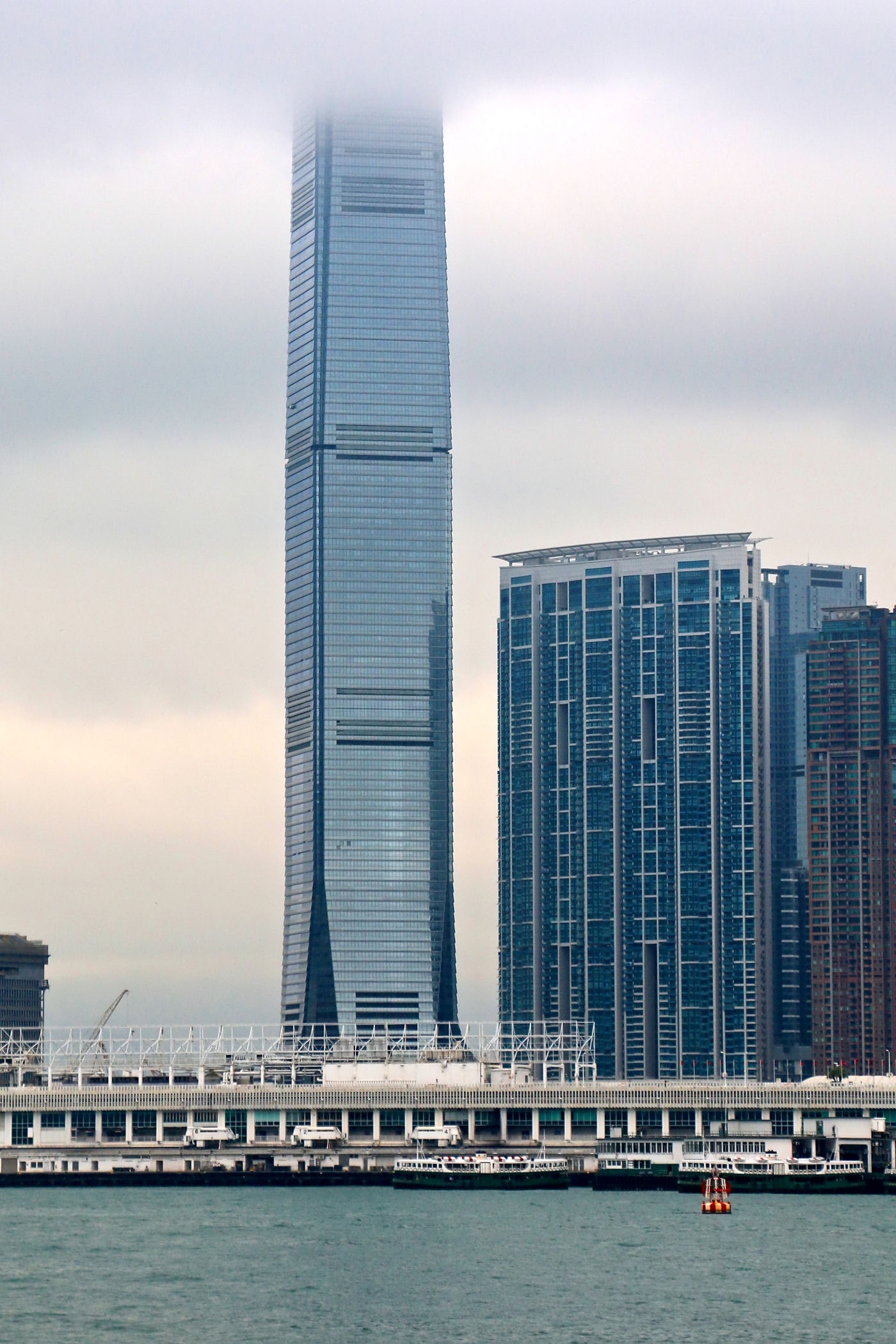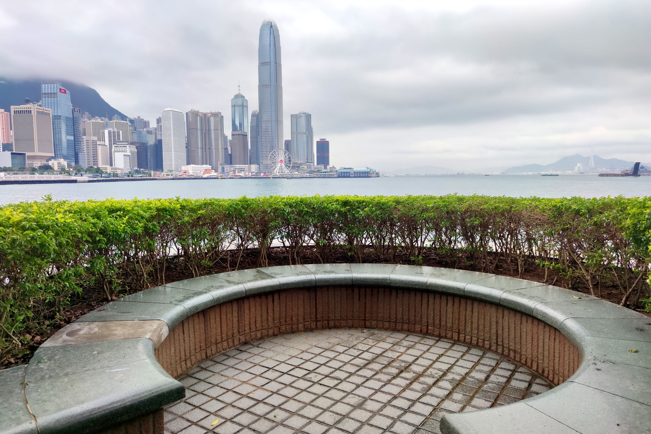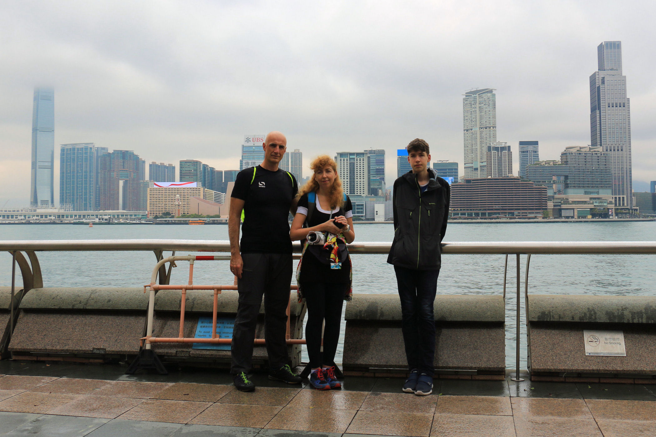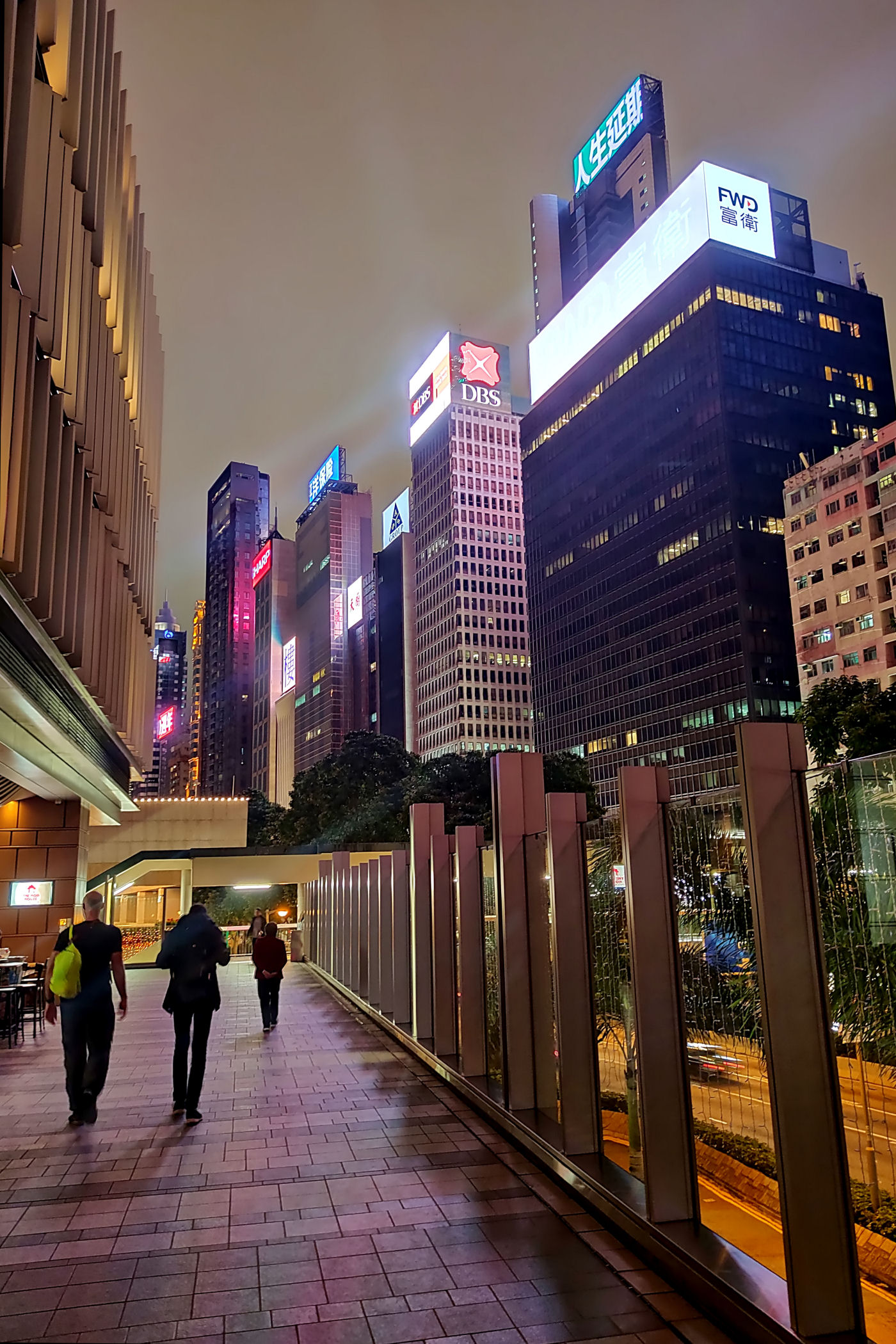 Przy centrum zaczyna się promenada ciągnąca się w kierunku zachodnim aż do Observation Wheel i Martime Museum. Oto mały jej fragment przy samym placu Golden Bauhinia Square, od zachodniej strony centrum i kawałek dalej. Roztacza się stąd piękna panorama zabudowy drugiego brzegu – dzielnicy TSIM SHA TSUI, a także centrum Wyspy Hongkong.