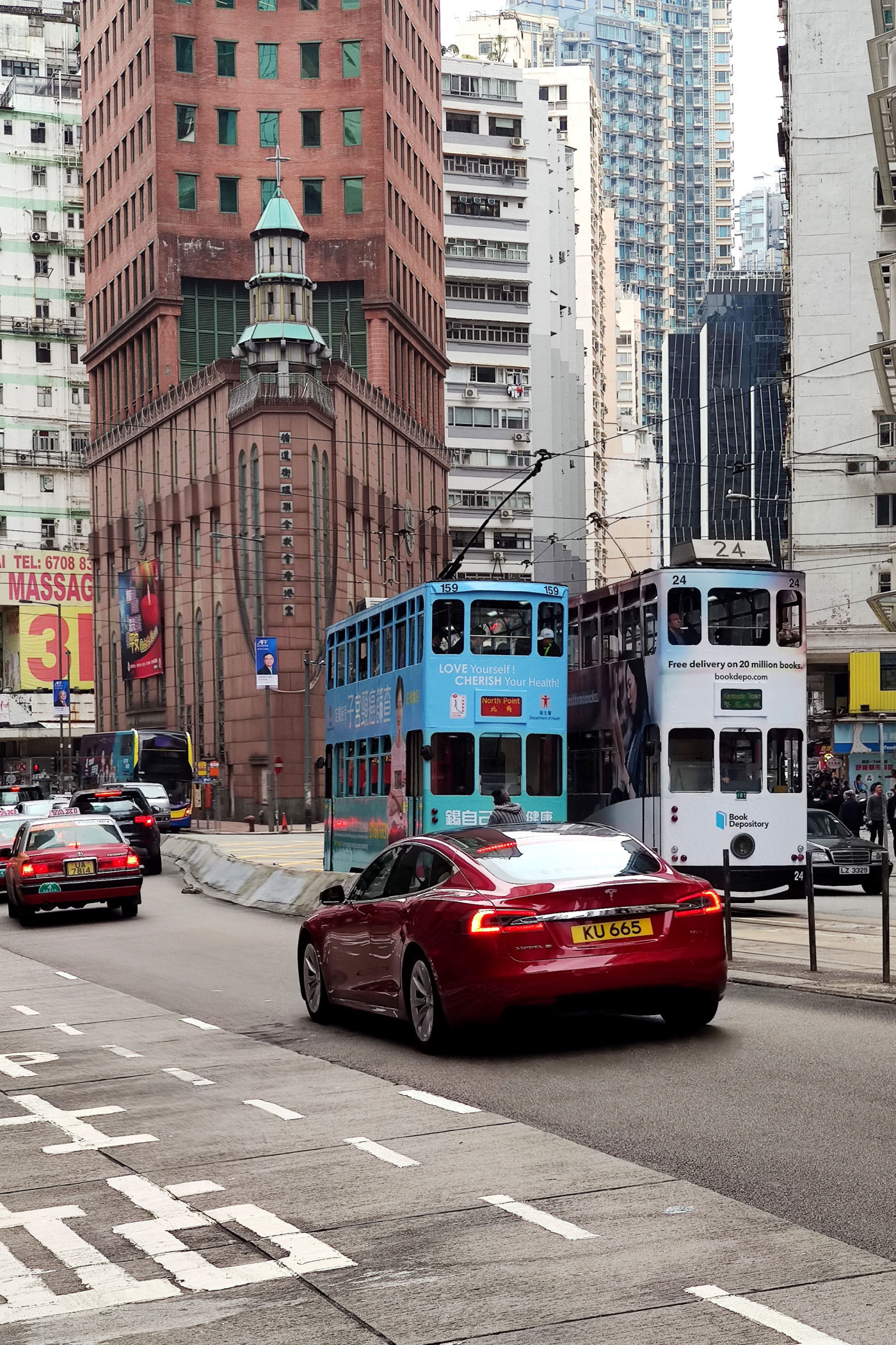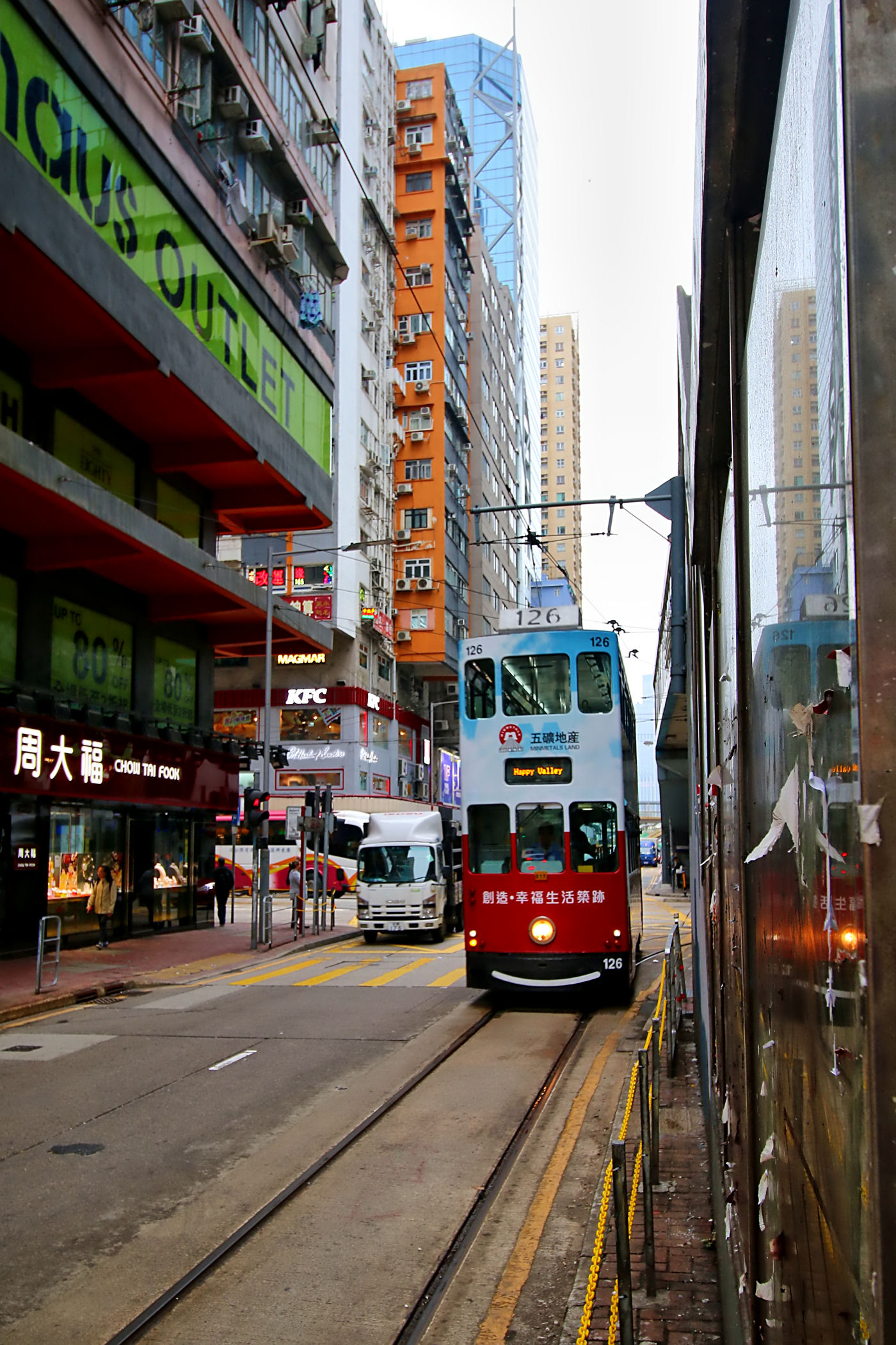 Przez dzielnicę Wan Chai przebiegają dwie główne arterie. Jedna z nich to Hennesy Road przy której stoi nasz hotel. Wędrujemy nią i przekraczamy kładkami nadziemnymi dziesiątki razy. Mamy też wielka przyjemność, aby przejechać się wzdłuż jedynym takim na świecie dwupiętrowym tramwajem. Ruch na ulicy jest nieprawdopodobny, tysiące autobusów, tramwajów, czy aut przejeżdża tu każdego dnia. Pod ulicą pociągnięta jest też linia metra i znajduje się jedyna stacja metra w dzielnicy o nazwie Wan Chai.