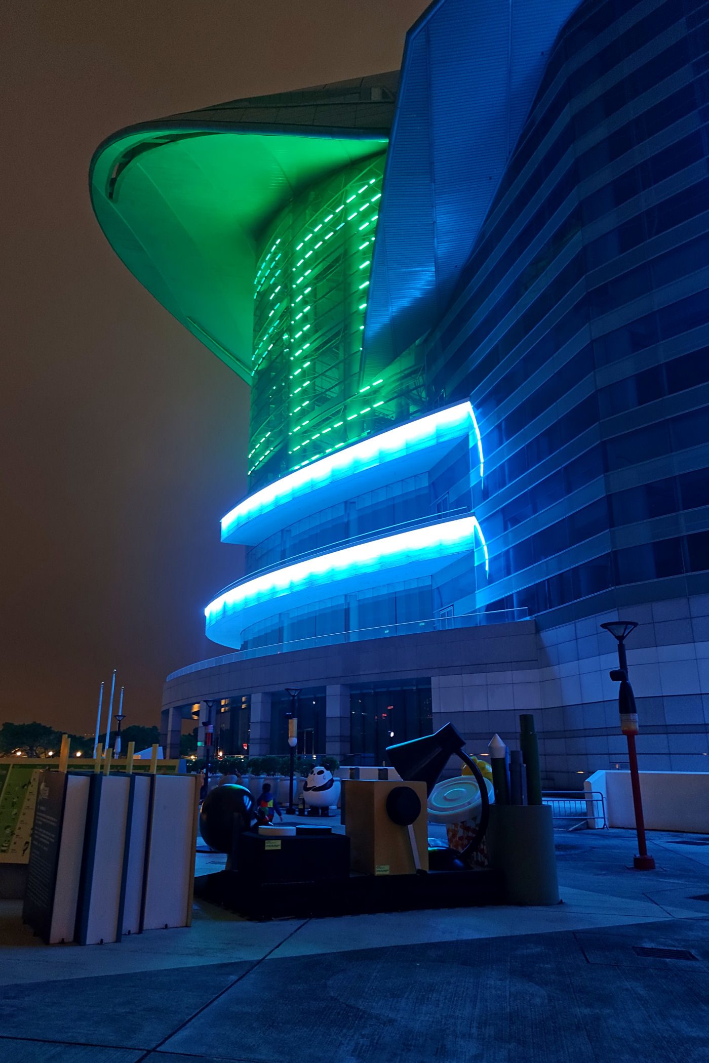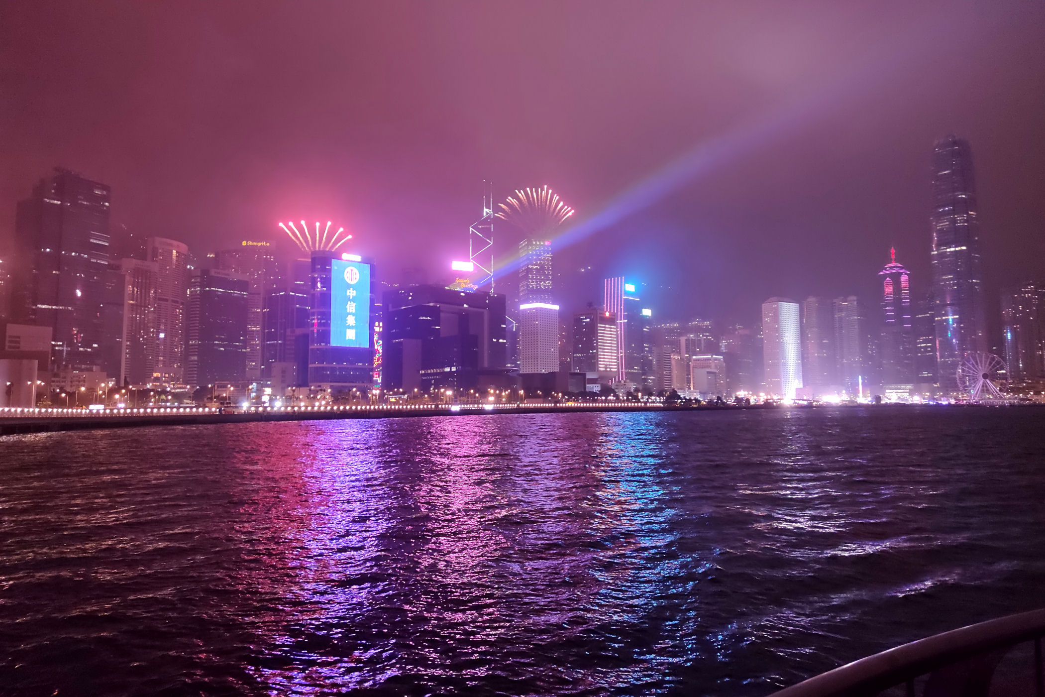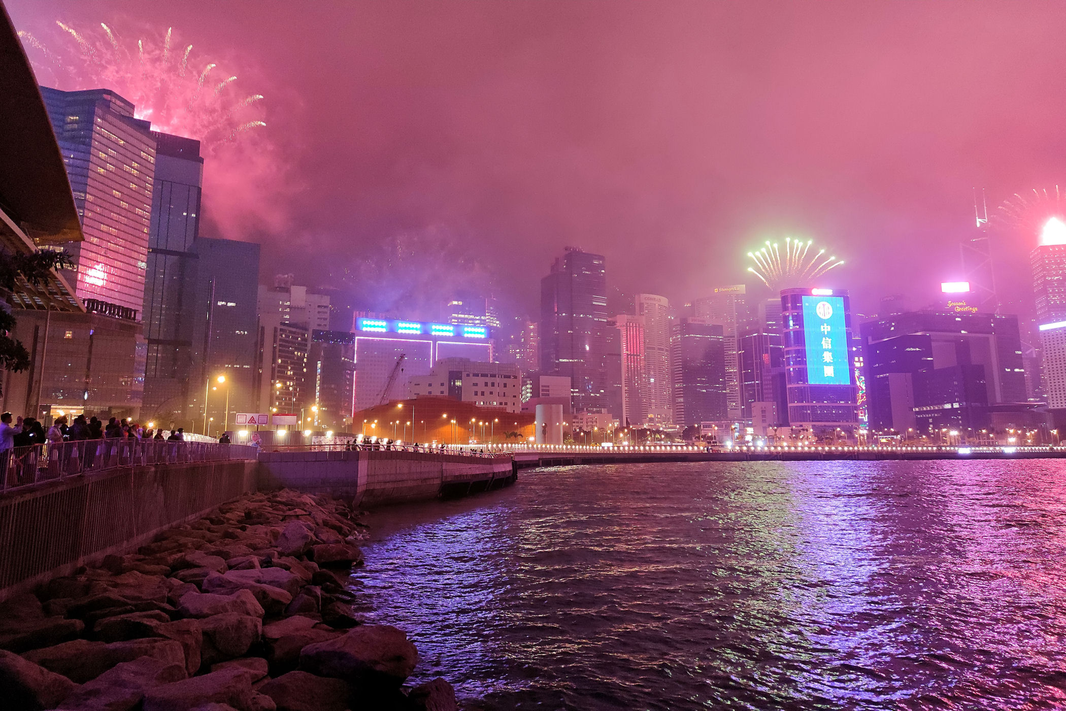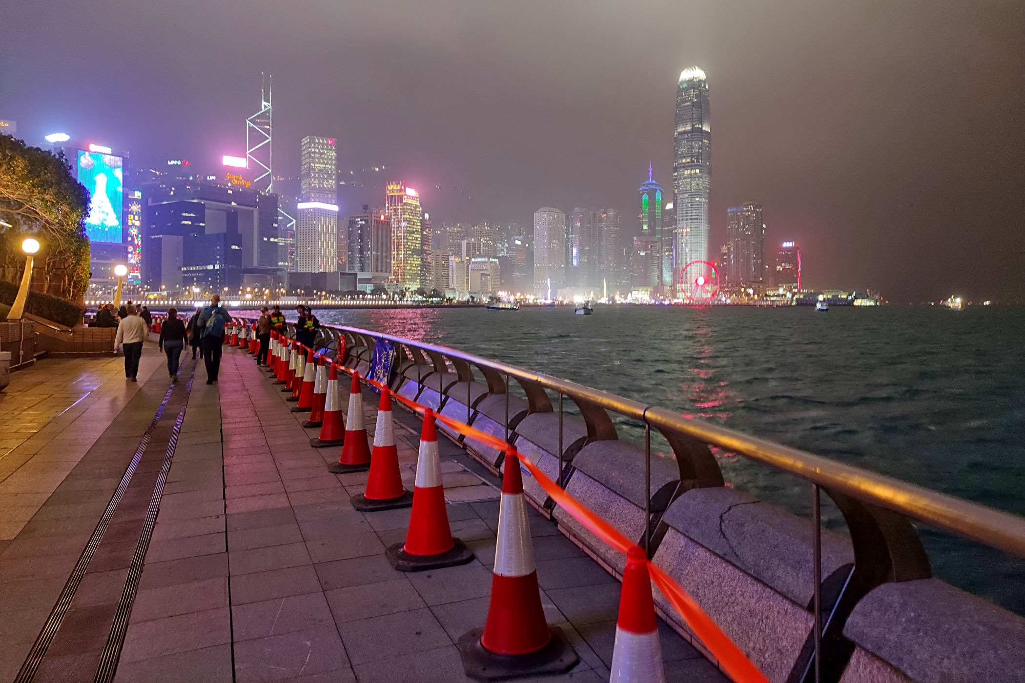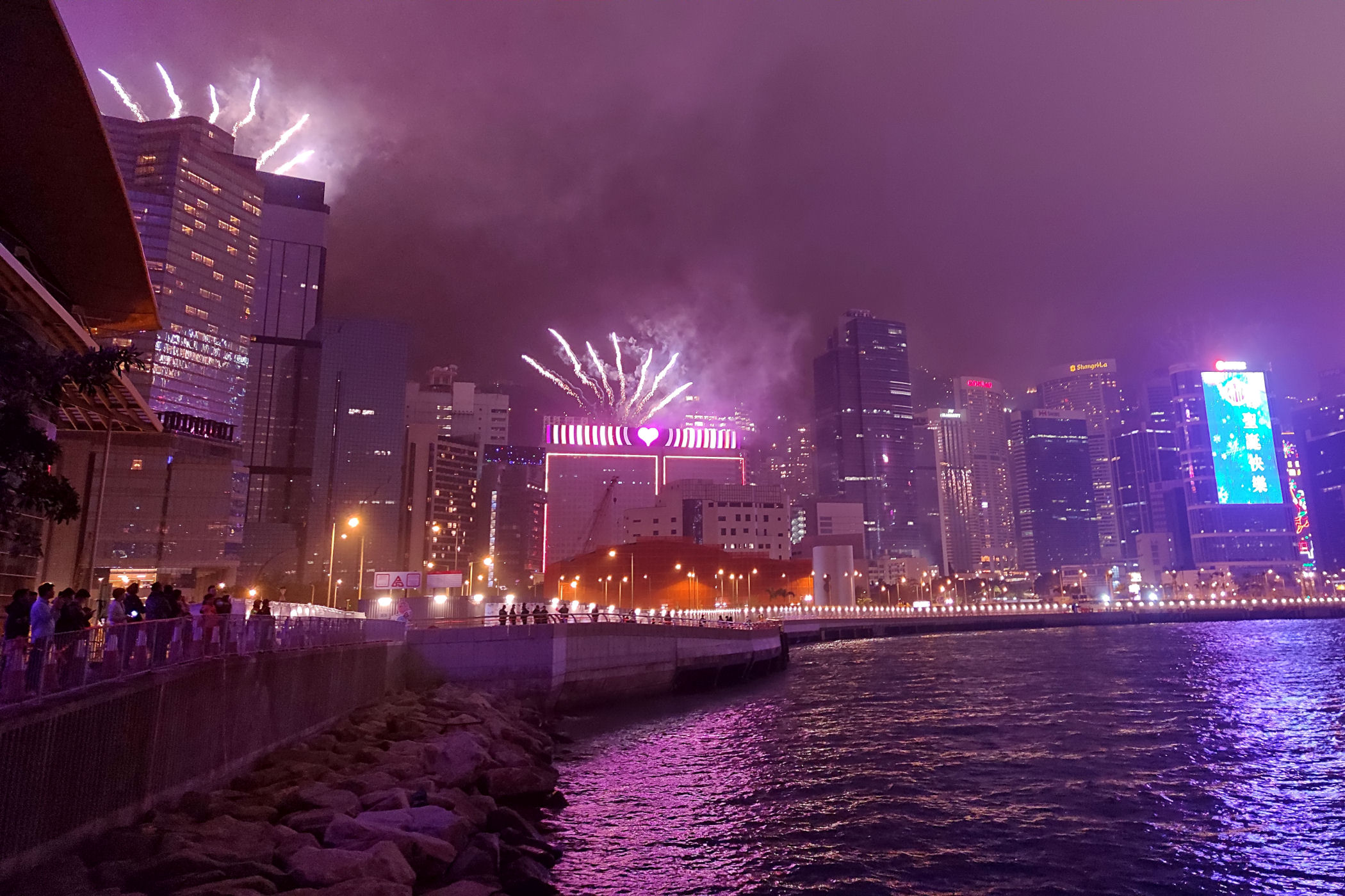 Plan pierwotnie zakładał spędzanie sylwestrowej nocy i powitanie Nowego Roku na PROMENADZIE GWIAZD po drugiej stronie zatoki. Tam jest po prostu najlepszy punkt widokowy dla takiego niesamowitego show jakim jest jeden z największych na świecie pokaz fajerwerków. Ze względu jednak na trwające protesty i niepewność co wydarzy się tej nocy zdecydowaliśmy się pozostać na naszej wyspie. W razie zamieszek mieliśmy po prostu blisko do hotelu. Dosłownie chwilę przed naszym wyjściem z hotelu na nocny spektakl dowiedzieliśmy się z wiadomości, że ze względów bezpieczeństwa pokaz został odwołany. I tak bez żalu już całkowicie powitaliśmy Nowy Rok na naszej promenadzie przy zachodniej stronie Centrum Kongresowego .