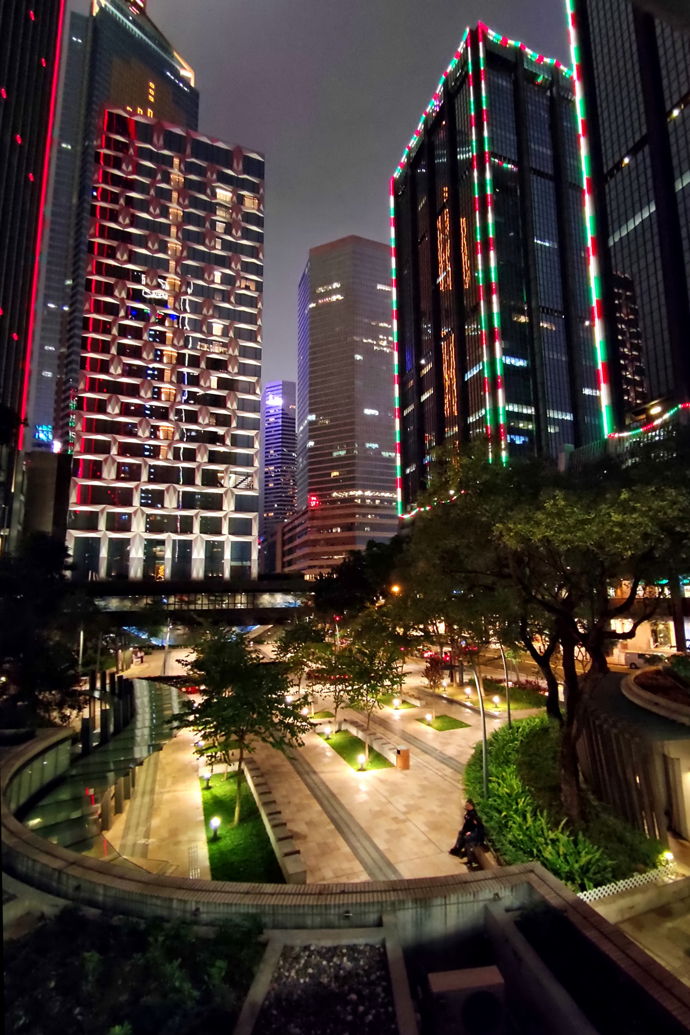 Na północ od arterii znajdują się kolejne biurowce, a między nimi piękne place i ogrody. Dzielnica wieczorem rozświetla się milionami świateł, a część obiektów ma nawet podświetlone całe elewacje.
