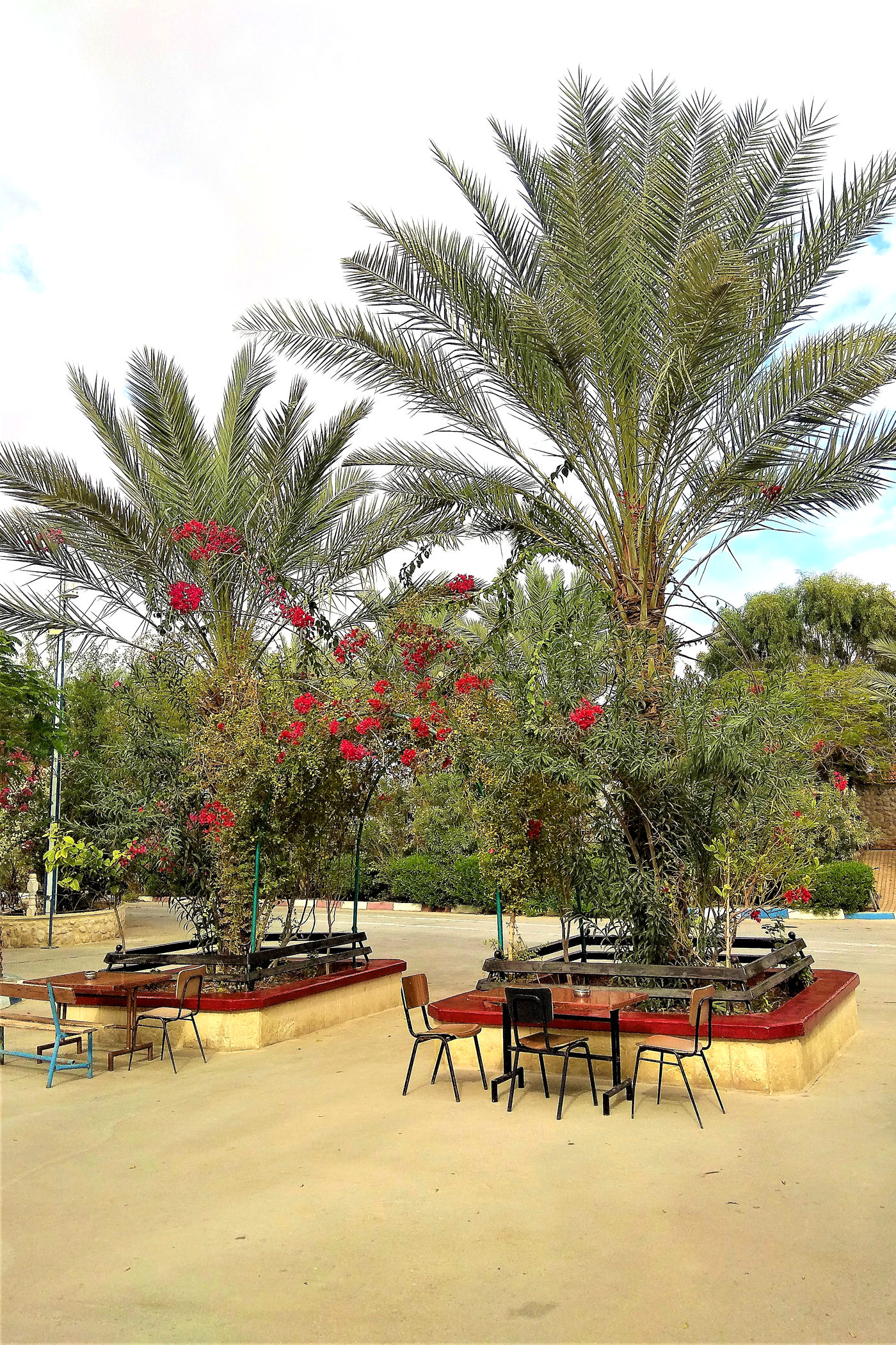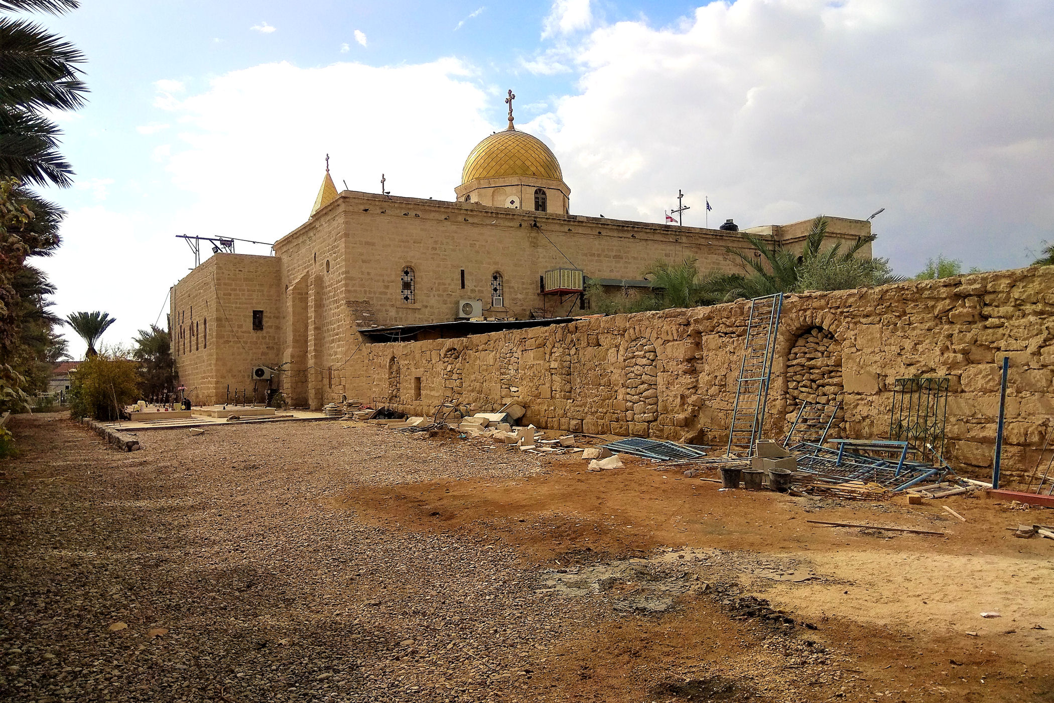 Jadąc dalej na południe drogą nr 90 mijamy w pewnym momencie oazę na pustyni. Prowadzi do niej droga, a pośrodku znajduje się całkiem spory parking. Zatrzymujemy się więc, choć nie mamy informacji co się tu znajduje, a jesteśmy już na wysokości 344m p.p.m. Pośrodku pięknych ogrodów odnajdujemy Klasztor nazwany przez mnichów prawosławnych „Klasztorem św. Gerasimosa”. To nazwa po św. Gerasimosie, który założył klasztor w 455 roku. Klasztor Deir Hajla był założony w pobliżu klasztoru Malawn, małego kościoła wewnątrz jaskini, gdzie jak wierzono, Święta Rodzina znalazła schronienie podczas ucieczki przed Herodem. W 617r, oba klasztory Malawn i Gerasimos połączyły się, by stać się znane jako Deir Hajla.