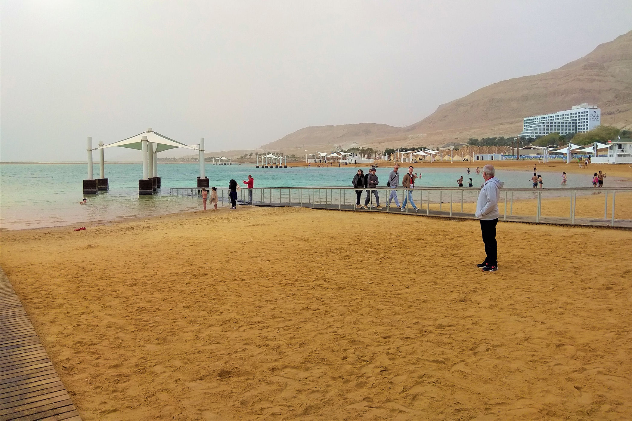 Droga nr 90 ciągnie się długo bez braku możliwości zjazdu, a nawet dojścia do brzegu, najbliższy ośrodek, a zarazem największy to Ein Bokek. Tu znajdują się liczne hotele, restauracje , plaże hotelowe, a także ( na szczęście dla nas ) plaża publiczna ( piaszczysta w przeciwieństwie do tych na północy ), z eleganckim zapleczem : przebieralnie, prysznice, pomosty zejściowe, zadaszenia, leżaki.