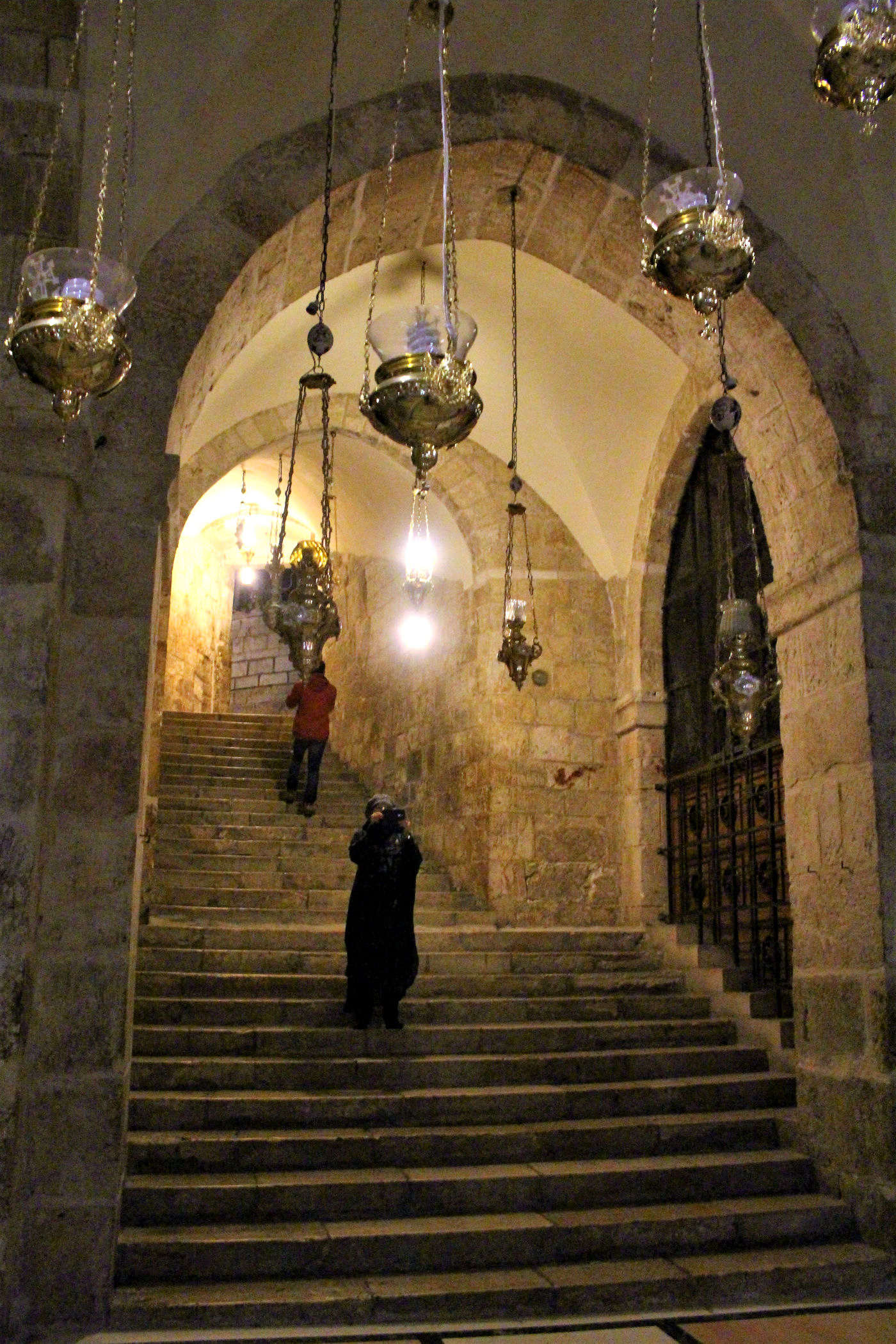 Późnoromański portal wprowadza nas do przedsionka, stąd schodami po prawej stronie można dostać się do Kaplicy Golgoty, gdzie znajduje się X i XI stacja drogi krzyżowej. Centralną część zajmuje ołtarz, pod nim otwór w którym miał być osadzony krzyż Chrystusa. Poniżej kaplicy znajduje się Kamień Namaszczenia. Na nim złożono ciało Jezusa na czas balsamowania. Z kolei po lewej stronie w centralnej części znajduje się Kaplica Grobu świętego. Za grobem znajduje się Kaplica Koptów gdzie pod ołtarzem jest skała w której wykuto grób. W bazylice znajduje się jeszcze wiele ciekawych miejsc : w Kaplicy jakobitów – Syryjczyków znajduje się grobowiec Józefa z Arymatei, jest tu ołtarz Marii Magdaleny oraz kaplica Najświętszego sakramentu. My trafiamy jeszcze do Kaplicy odnalezienia Krzyża świętego gdzie św. Helena odnalazła tą największa relikwię.