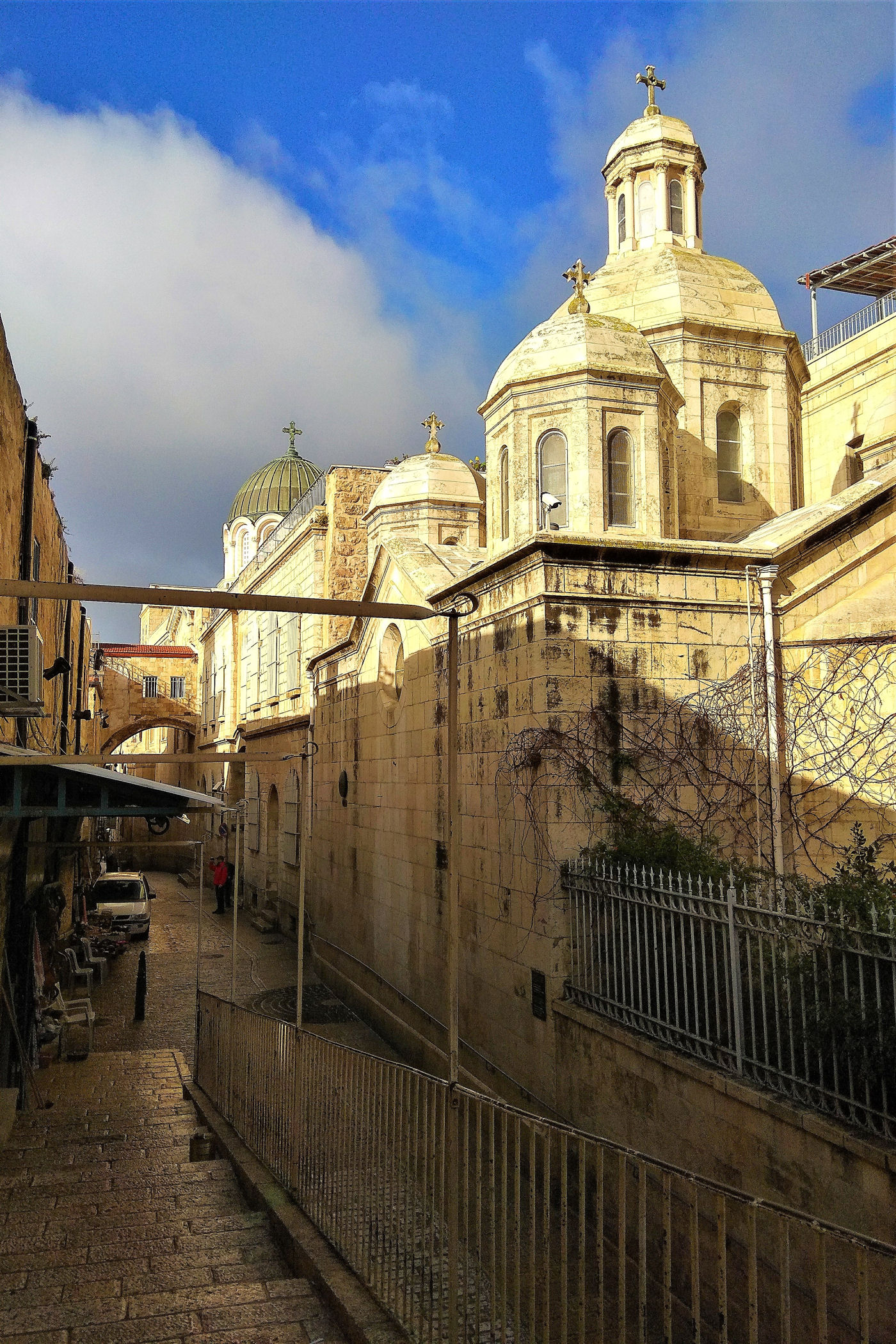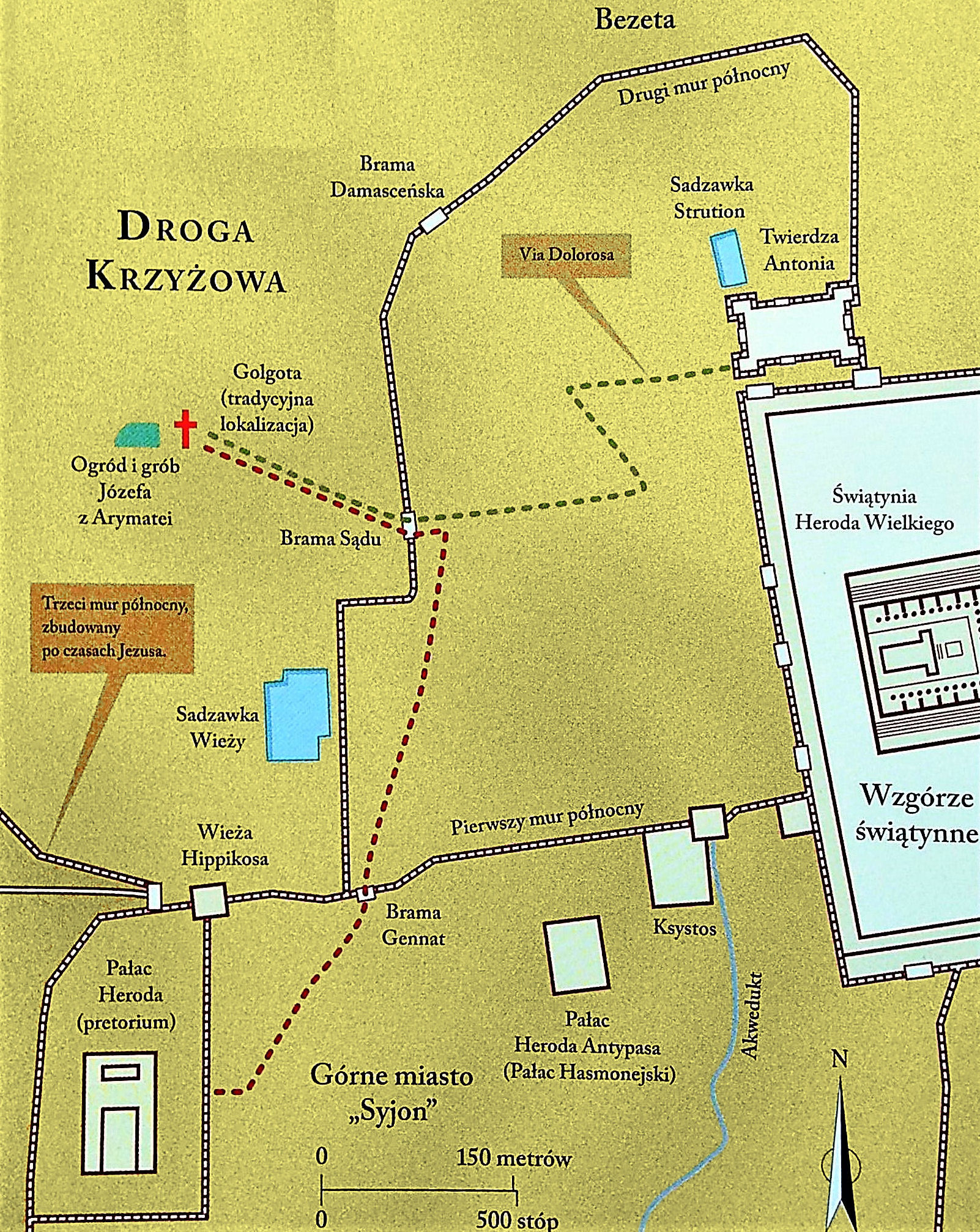 Kawałek dalej za klasztorem przy słynnej ulicy Via Dolorosa zaczyna się droga krzyżowa. Tak się przyjęło, choć najnowsze badania wykazały, że jej przebieg był zupełnie inny – mapka poniżej. Obok mapa Jerozolimy w okresie męki Pańskiej oraz schemat Drogi Krzyżowej .