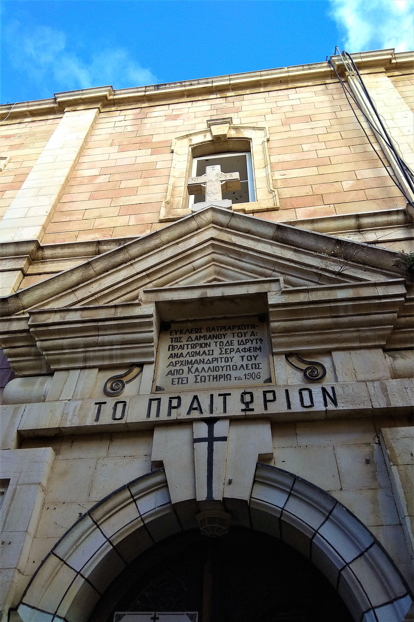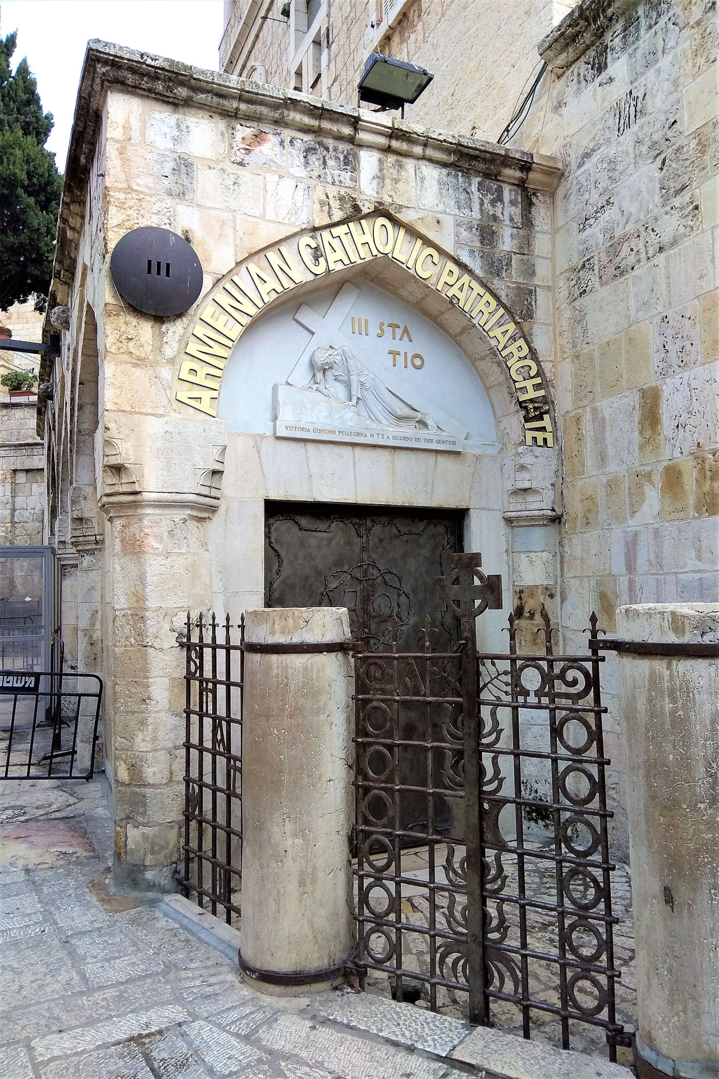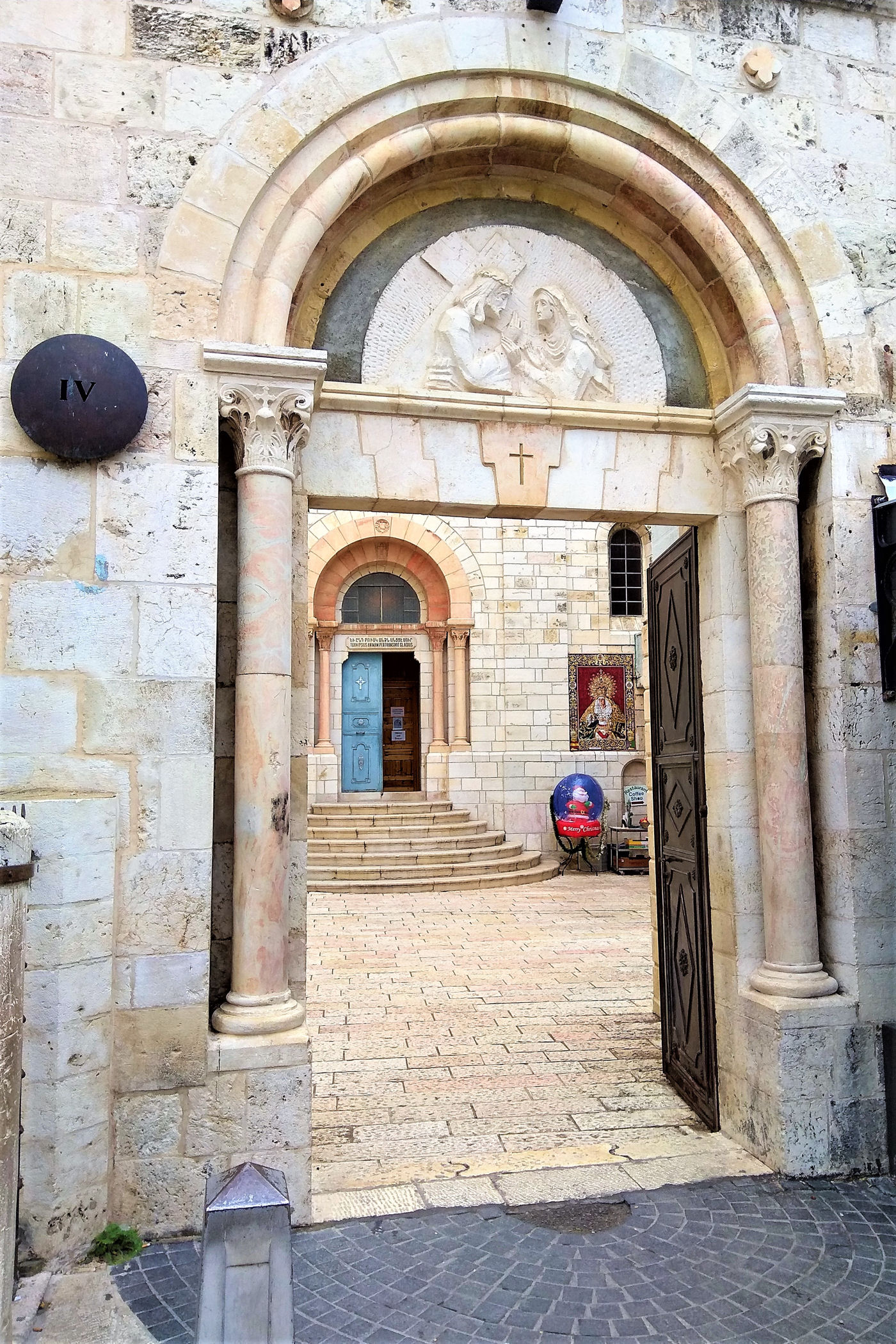 Znajduje się na murze Kaplicy Skazania na Śmierć, zbudowanej w 1920 w miejscu kaplicy bizantyjskiej. Idąc dalej mijamy łuk triumfalny z z czasów rzymskich I/II w. Część konstrukcji włączono w mur Kościółka Ecce Homo ( wstęp 9/5 NIS )