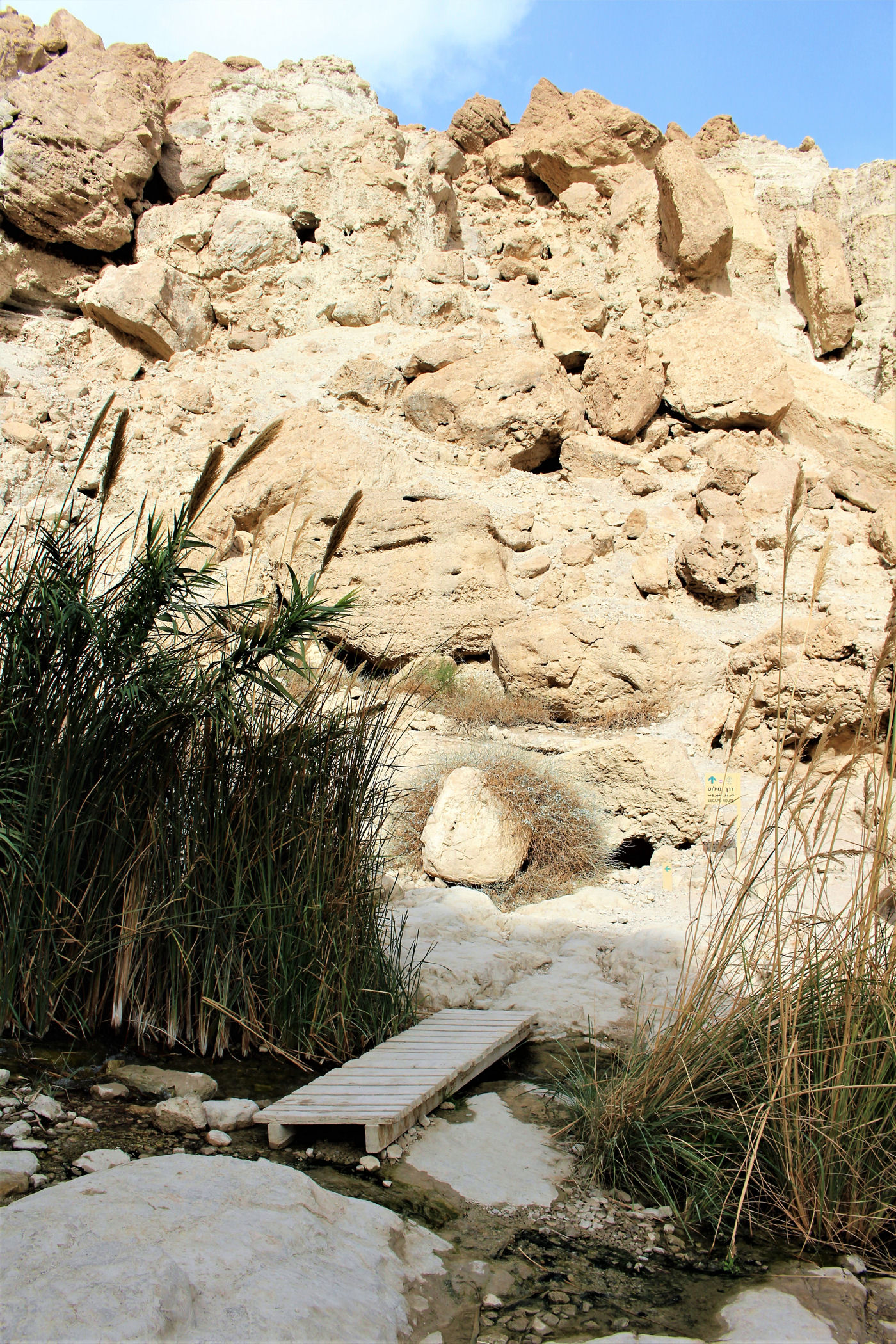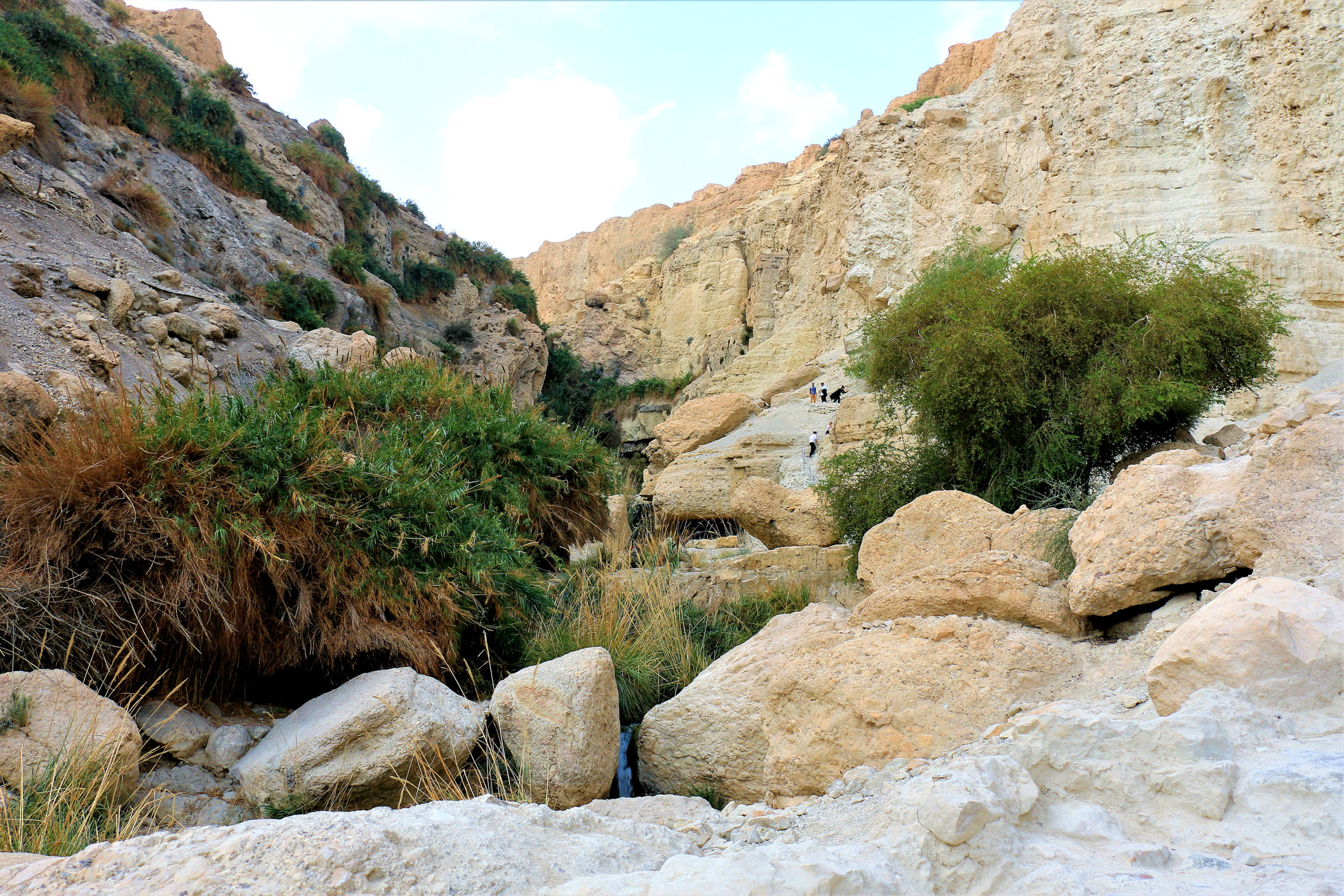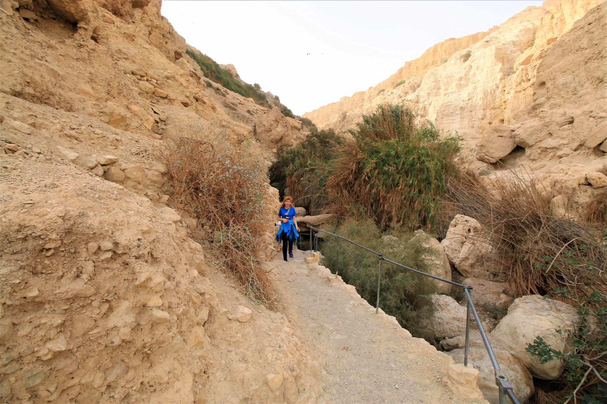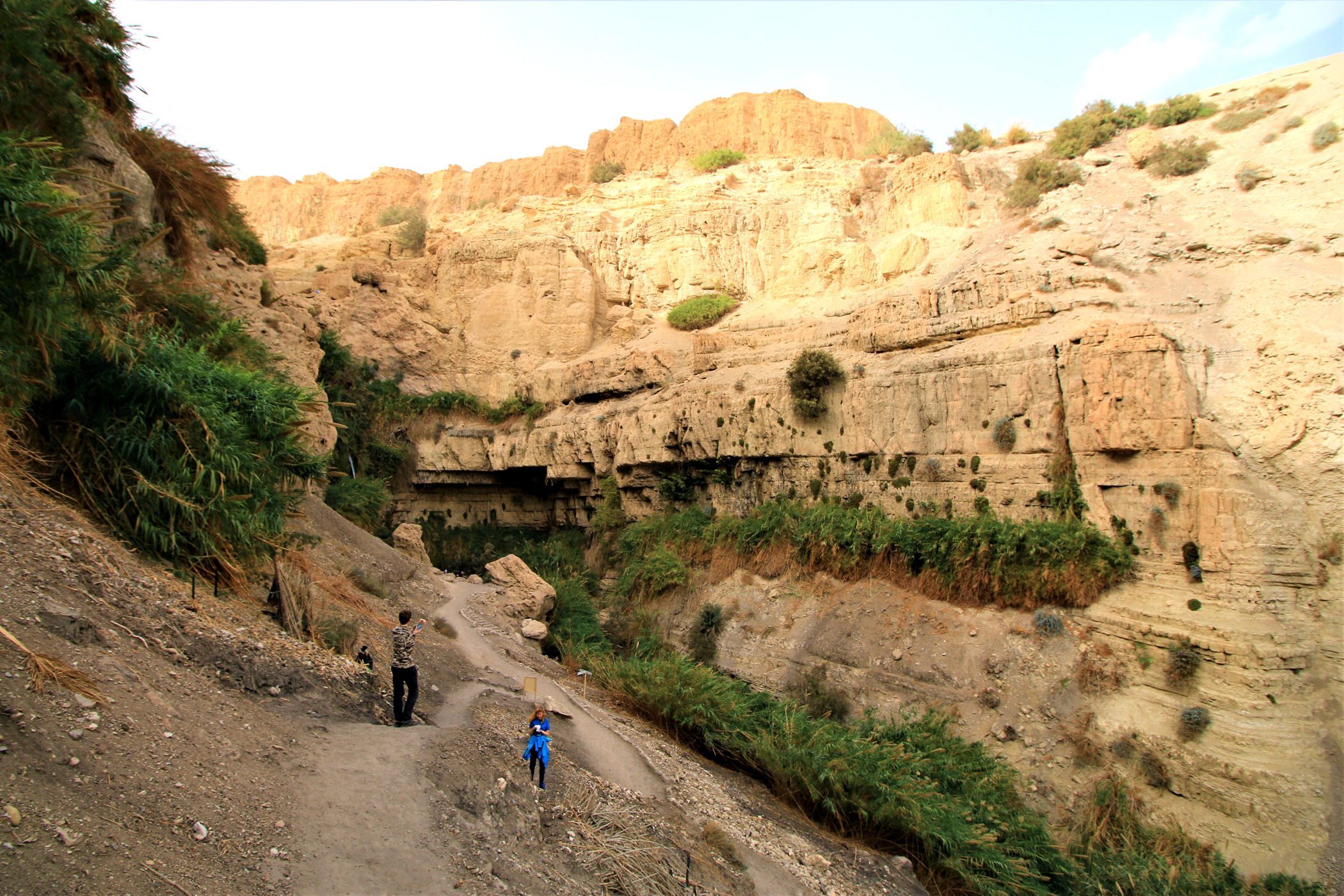 Najkrótszy i najpopularniejszy szlak prowadzi do Kanionu Wadi David , którym zawędrujemy do Wodospadu Dawida. Górna część kanionu dostępna jest dzięki stromej ścieżce prowadzącej wysoko ponad urwiskiem. Do górnej części wodospadu prowadzą metalowe klamry zamocowane na przewieszonej skałce . Niestety z powodów , które opisałam poniżej ( pod wpisem o faunie ) nie wpuszczono nas już na ten szlak.