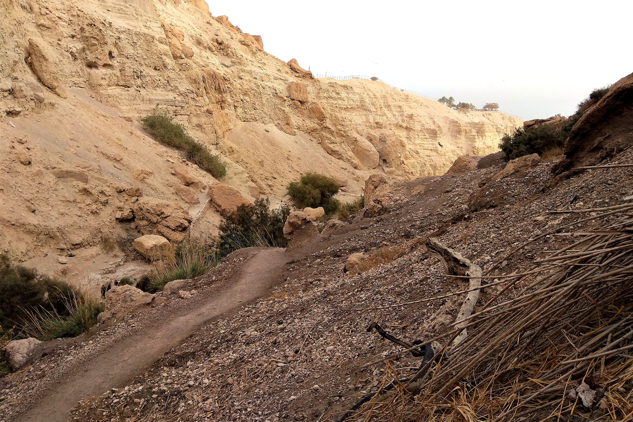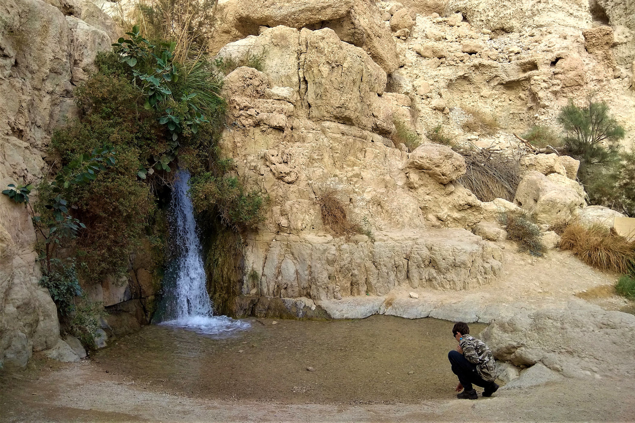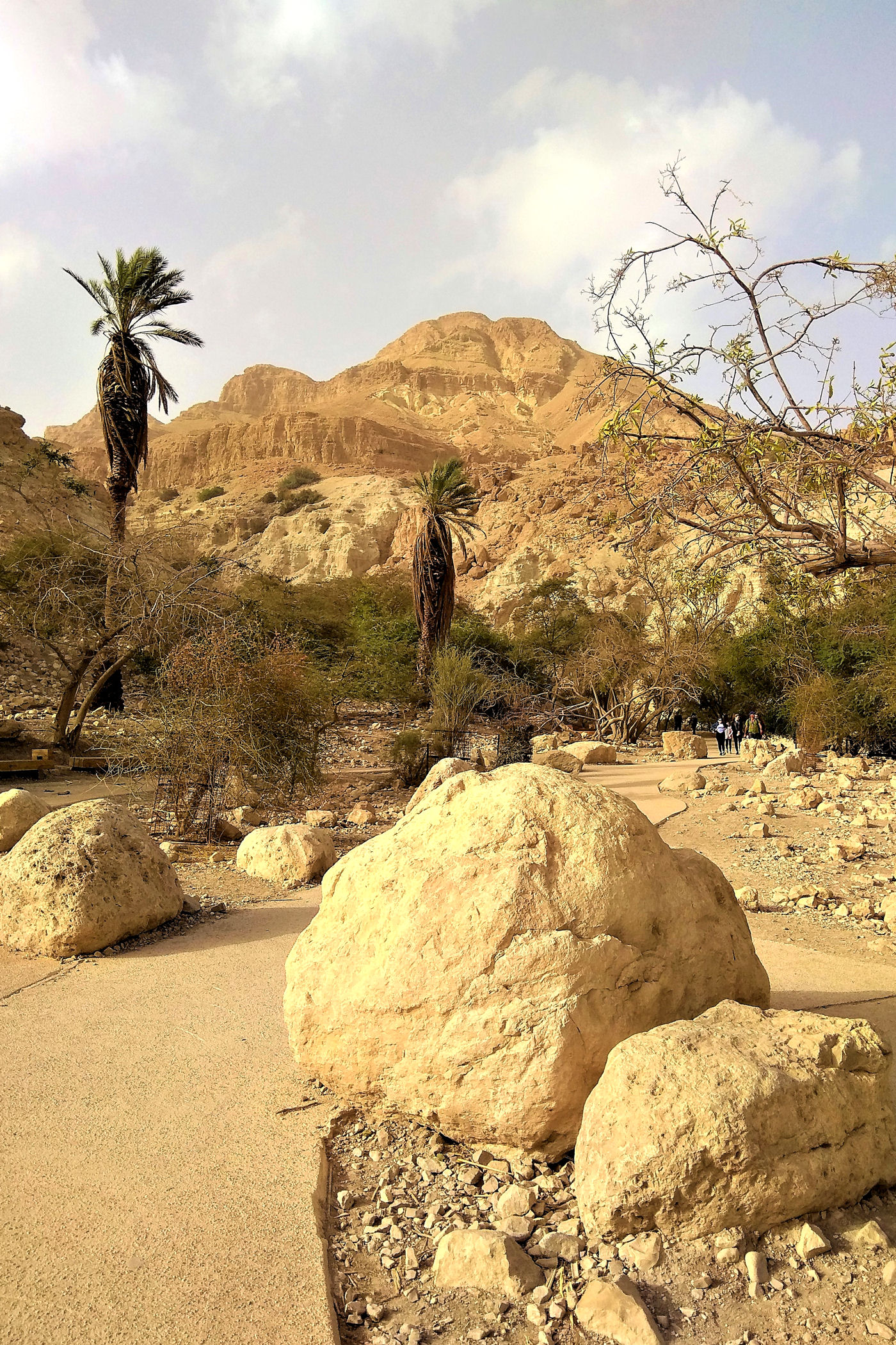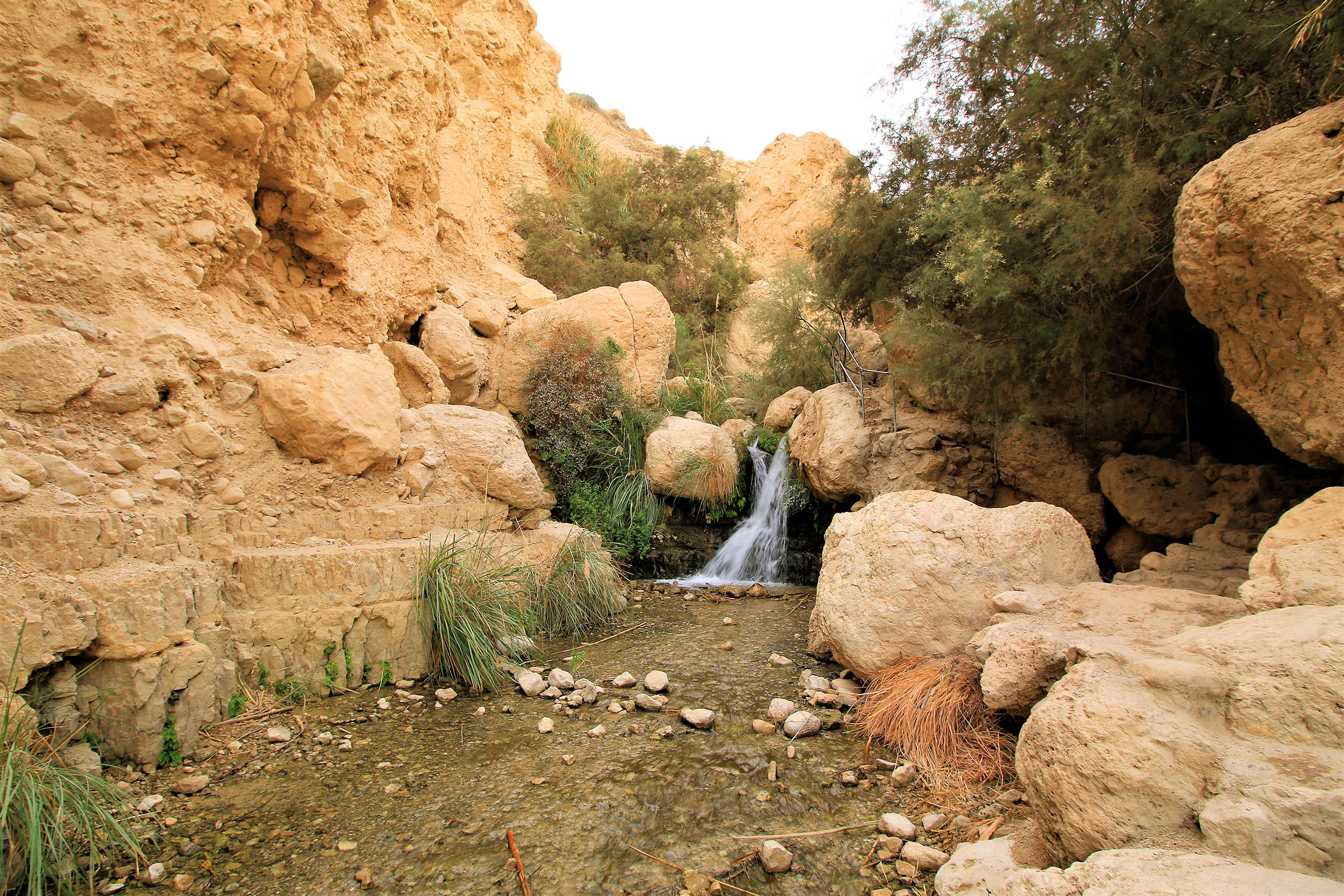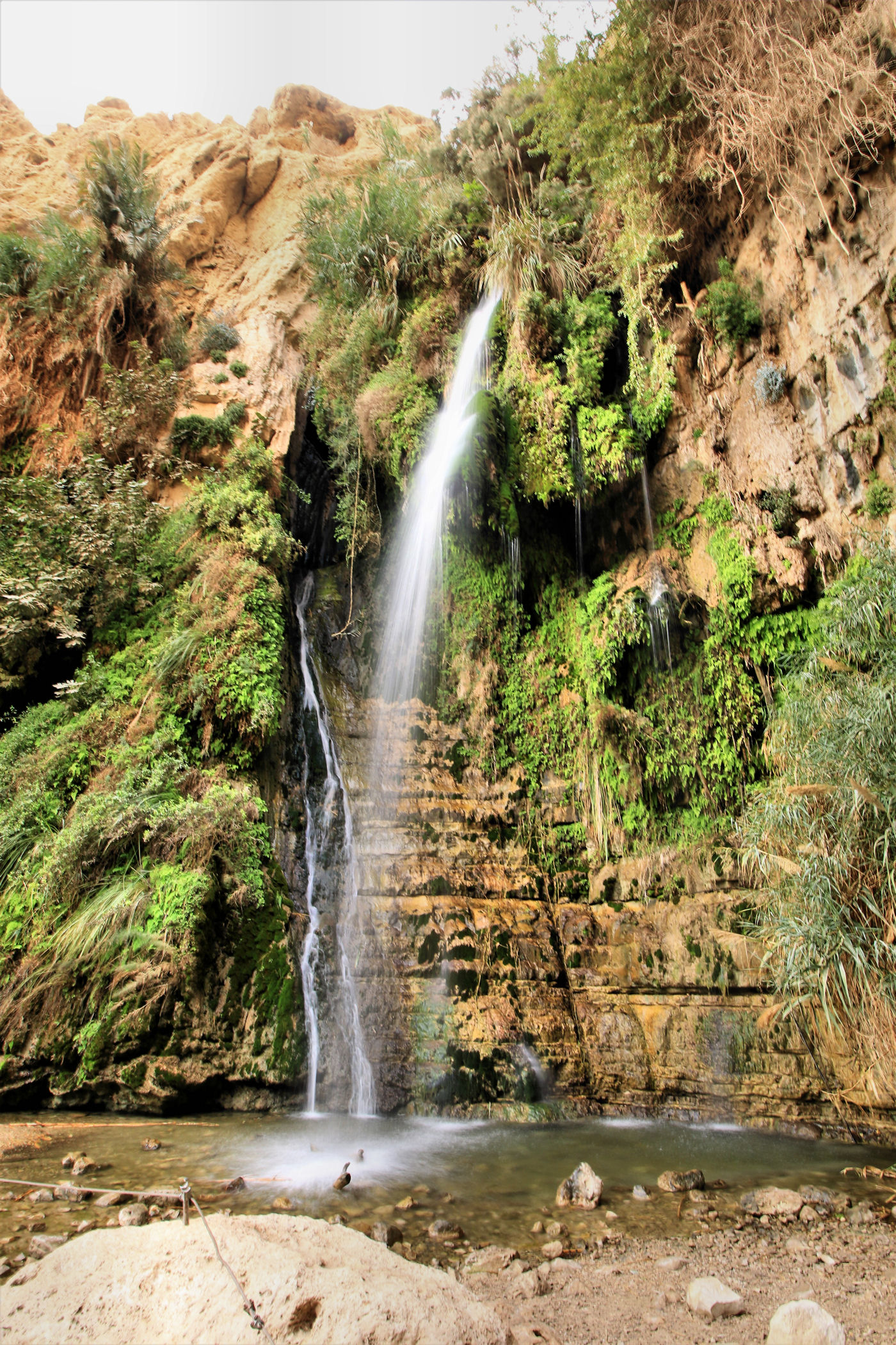 Najkrótszy i najpopularniejszy szlak prowadzi do Kanionu Wadi David , którym zawędrujemy do Wodospadu Dawida. Górna część kanionu dostępna jest dzięki stromej ścieżce prowadzącej wysoko ponad urwiskiem. Do górnej części wodospadu prowadzą metalowe klamry zamocowane na przewieszonej skałce . Niestety z powodów , które opisałam poniżej ( pod wpisem o faunie ) nie wpuszczono nas już na ten szlak.