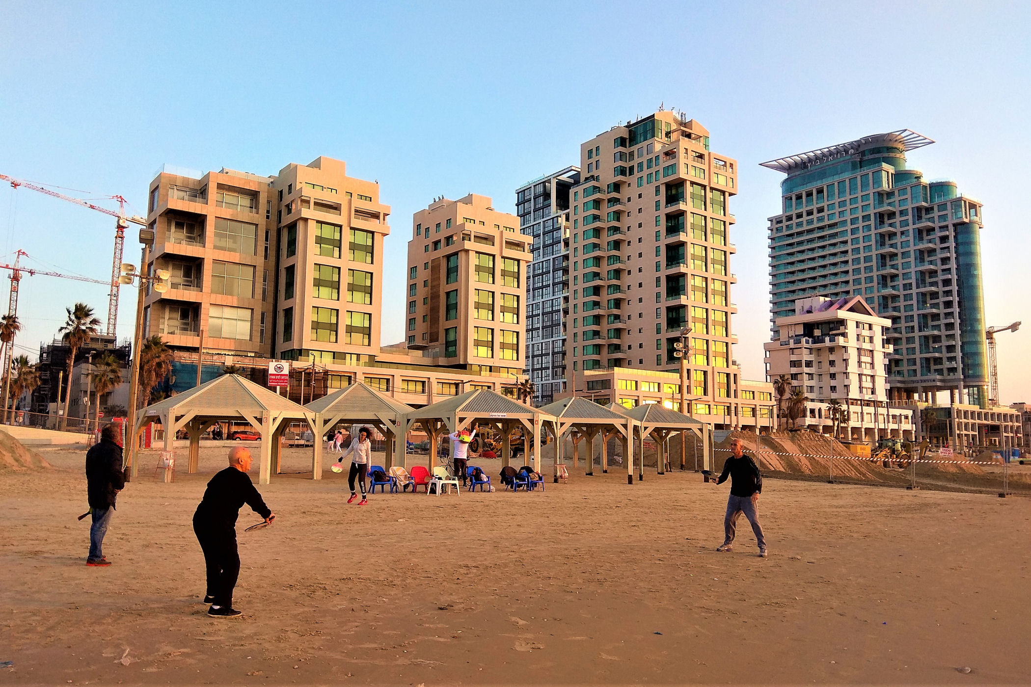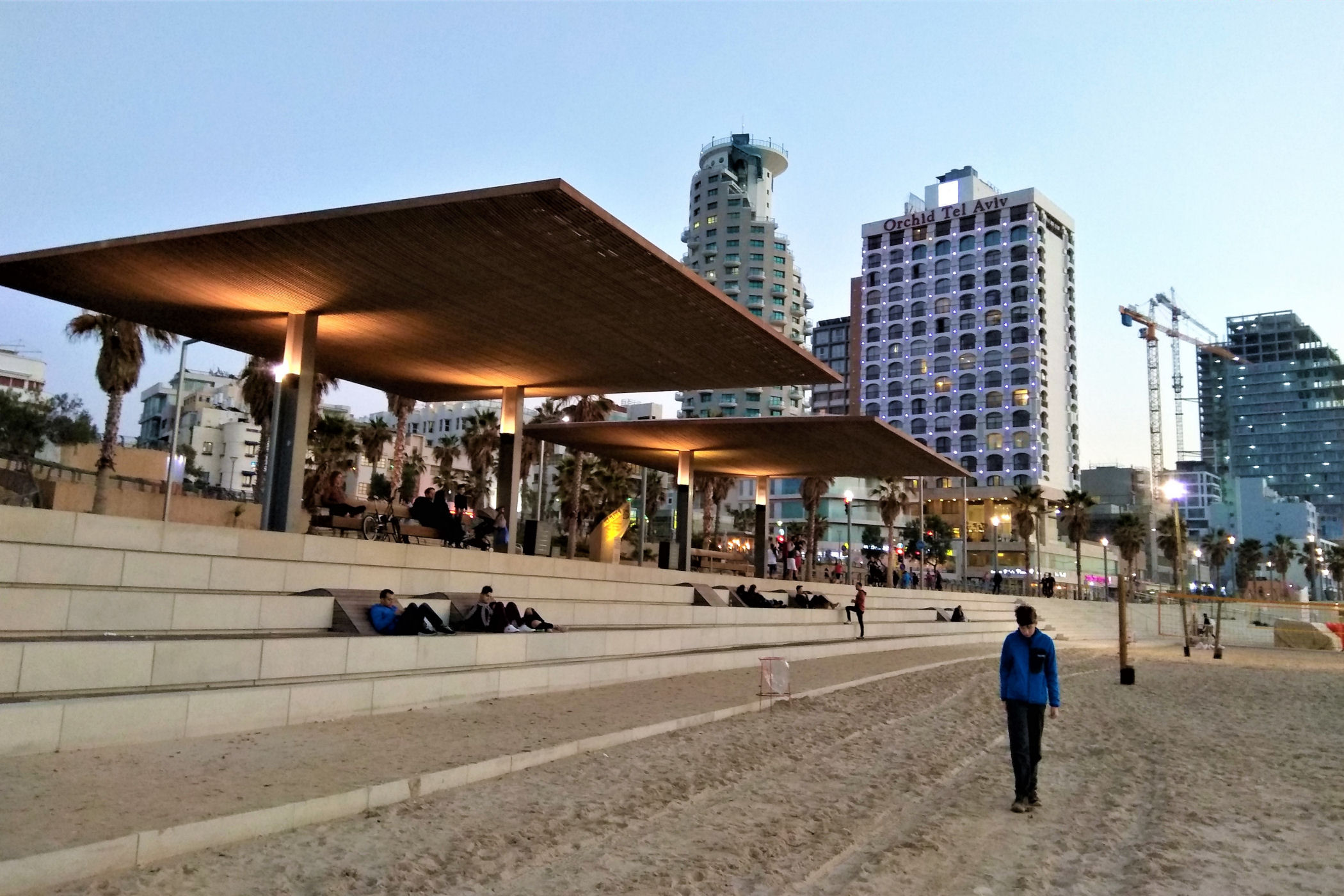 Tuż za mariną zaczynają się kolejne ciągnące się przez równo 2 km plaże : Topsea, Frishman (gdzie mijamy najbardziej kolorowy budynek Tel-Awiwu – Dan Tel Aviv Hotel), Bograshov, Jerusalem, aż po plażę Tupim. Szeroka, czysta plaża z licznymi knajpkami, zapleczami sanitarnymi przyciąga tłumy miejscowych i turystów mimo takiej pory roku. Kąpiel w morzu jest zabroniona, bo w miesiącach zimowych nie pracują tu ratownicy, ale samo wylegiwanie się na piasku z widokiem na fantastycznie rozwijające się miasto jednej strony, a z drugiej na morze jest czystą przyjemnością.