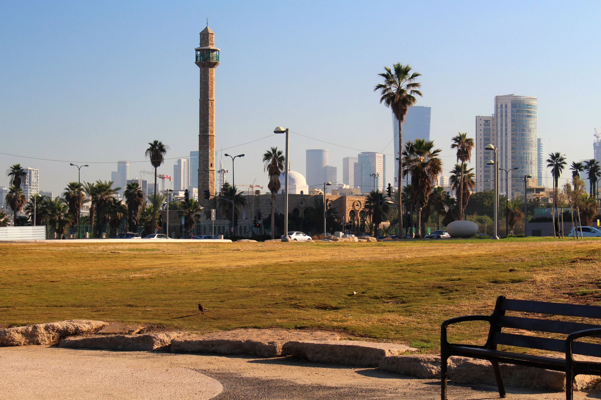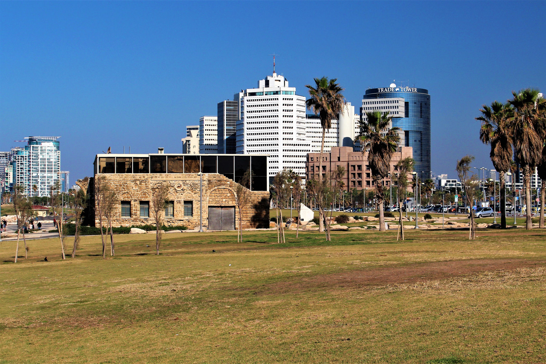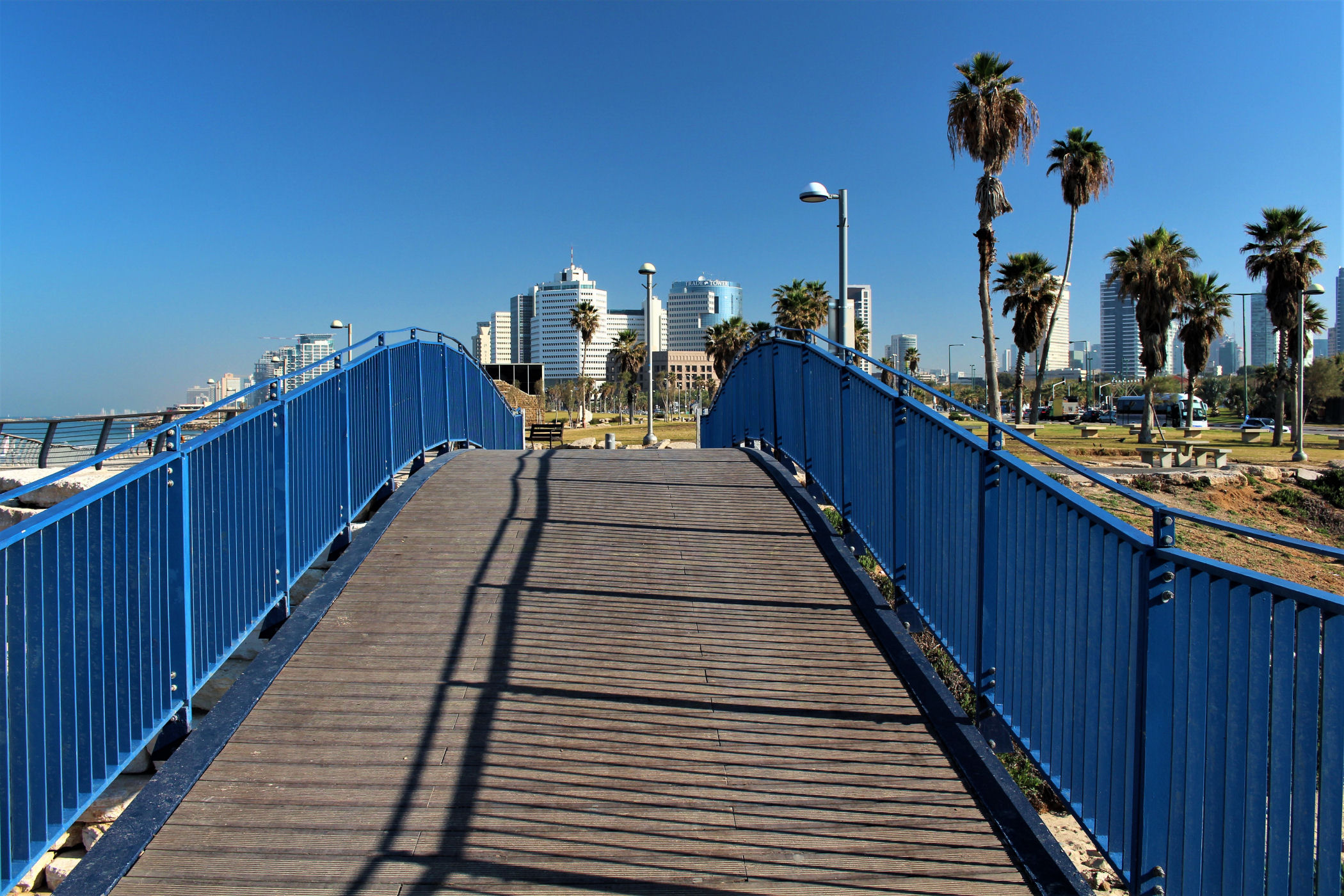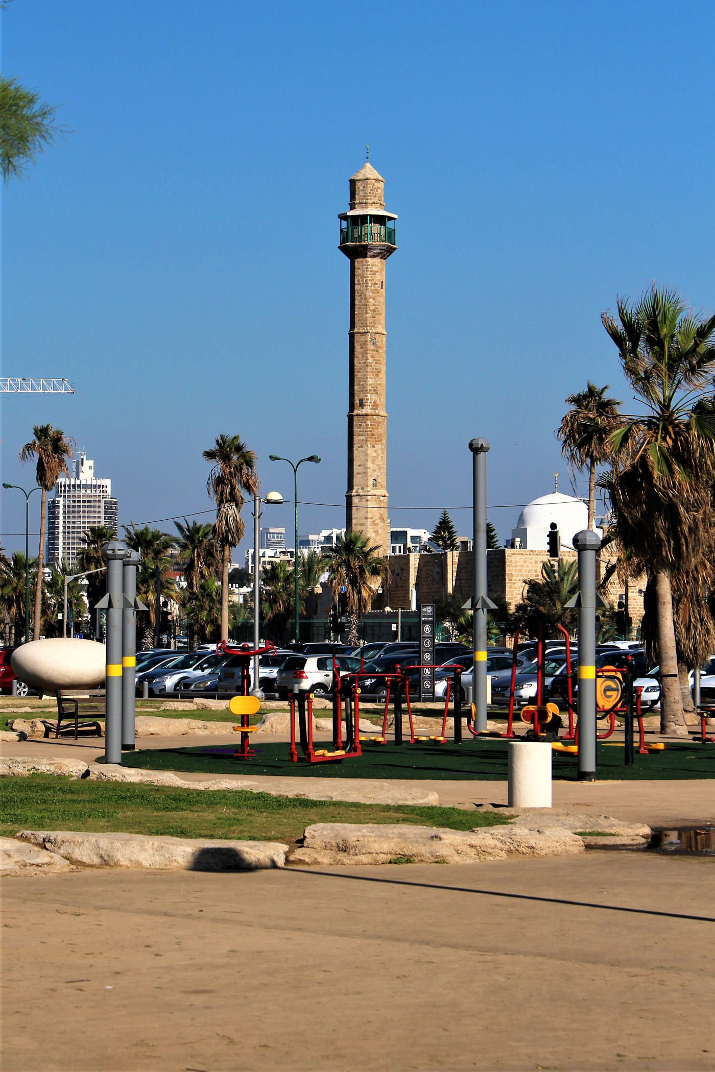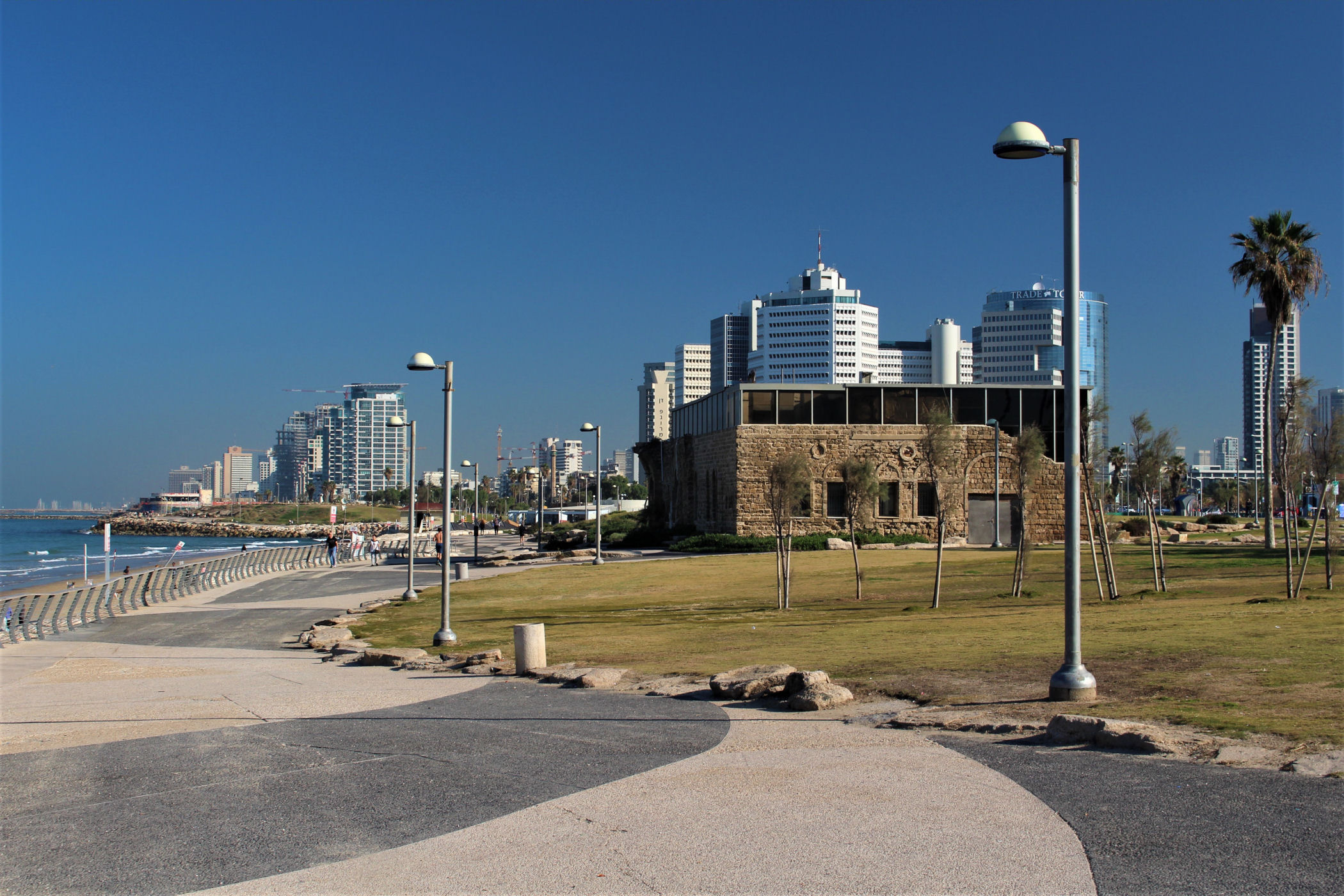 W okolicy nieistniejącego już delfinarium kończą się plaże, a zaczyna park z piękną promenadą wzdłuż wybrzeża. Przez kolejne kilkaset metrów idziemy wzdłuż porośniętego trawami terenu z nielicznymi palmami drzewami tamaryszkowymi we wschodniej części parku. Wcześniej znajdowało się w tym miejscu arabskie osiedle Menaszijja, czyli niegdysiejsza północna część Jafy.