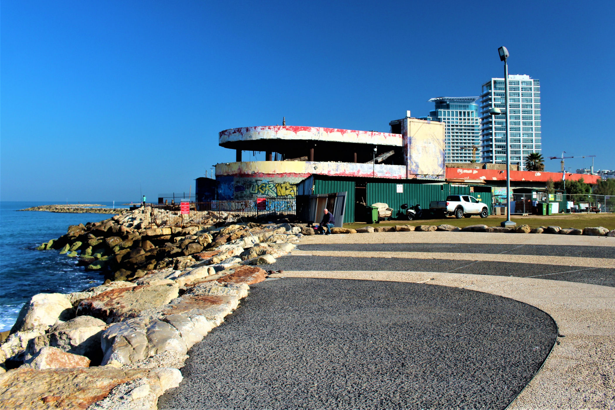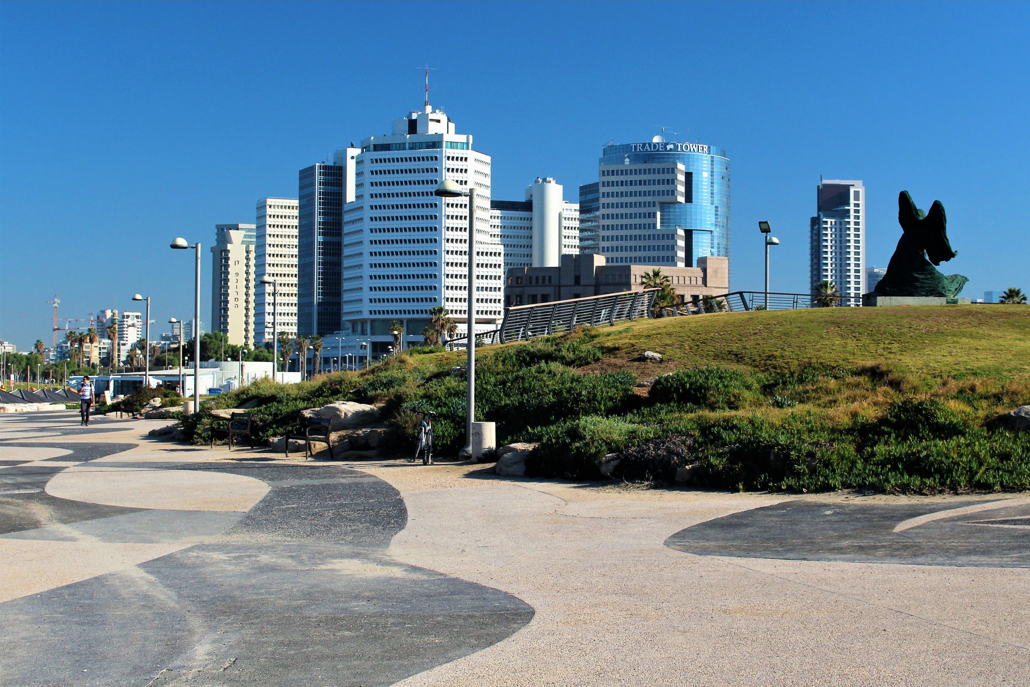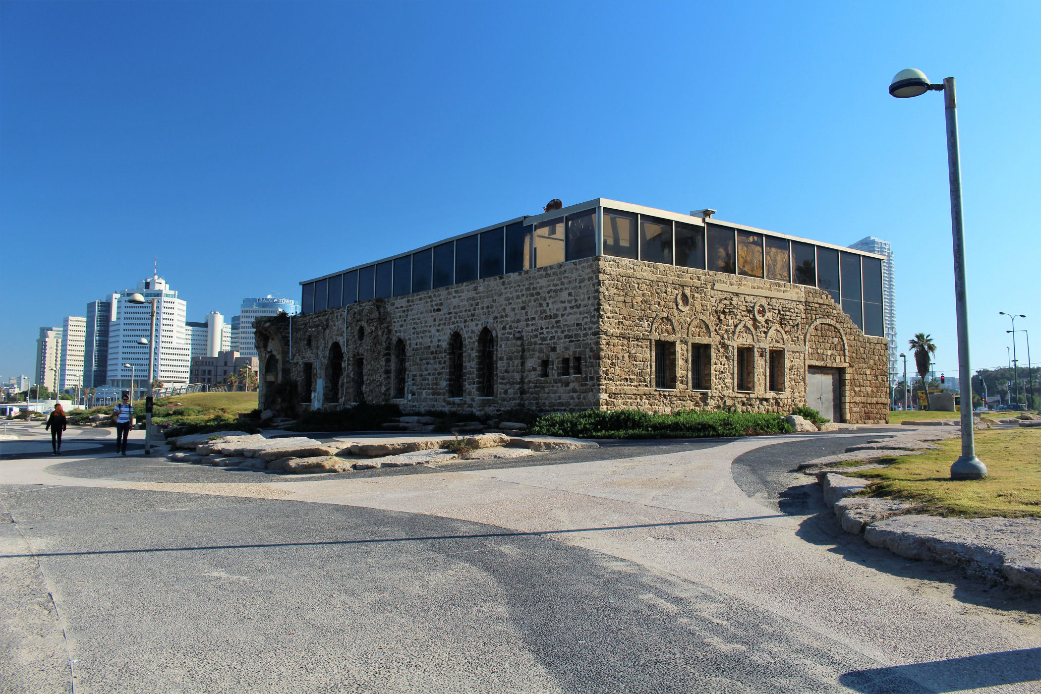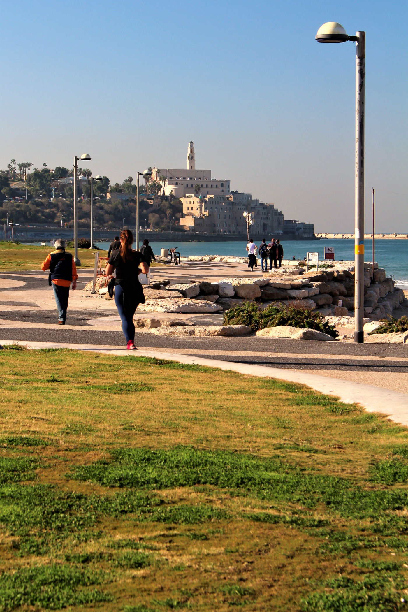 W okolicy nieistniejącego już delfinarium kończą się plaże, a zaczyna park z piękną promenadą wzdłuż wybrzeża. Przez kolejne kilkaset metrów idziemy wzdłuż porośniętego trawami terenu z nielicznymi palmami drzewami tamaryszkowymi we wschodniej części parku. Wcześniej znajdowało się w tym miejscu arabskie osiedle Menaszijja, czyli niegdysiejsza północna część Jafy.