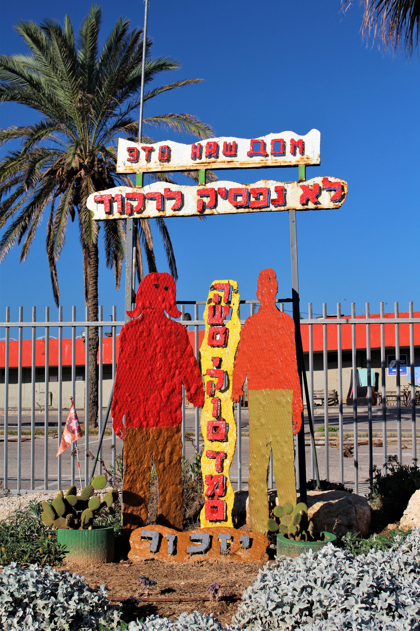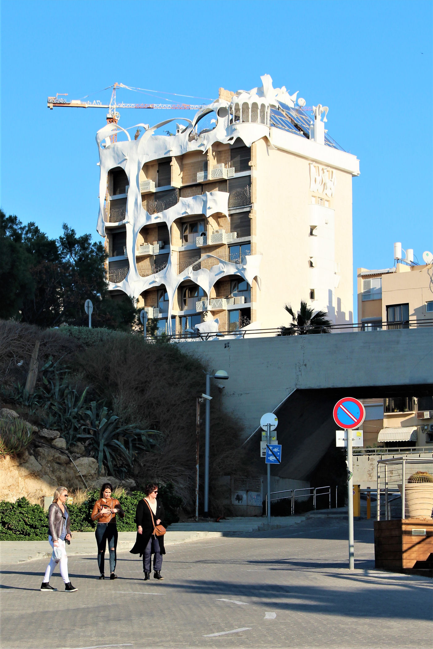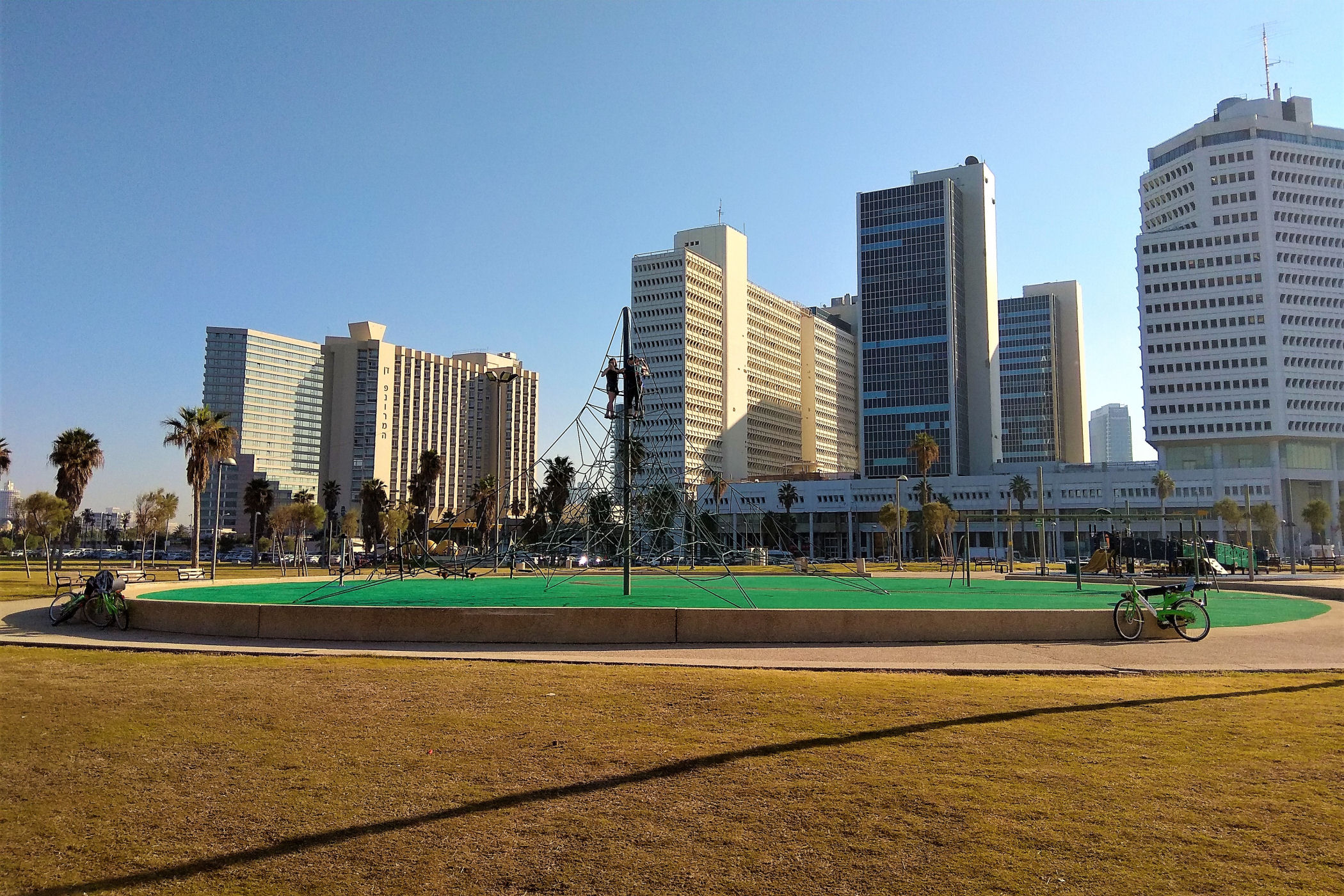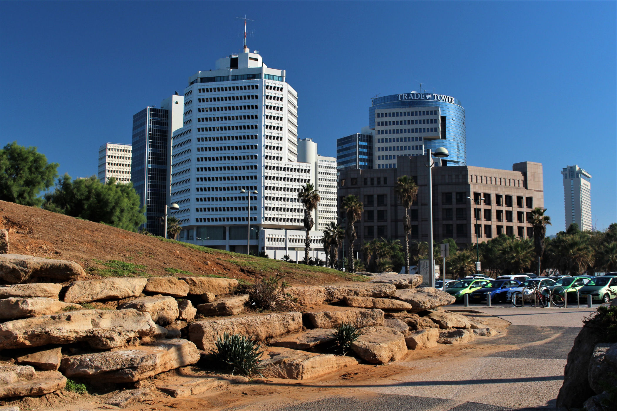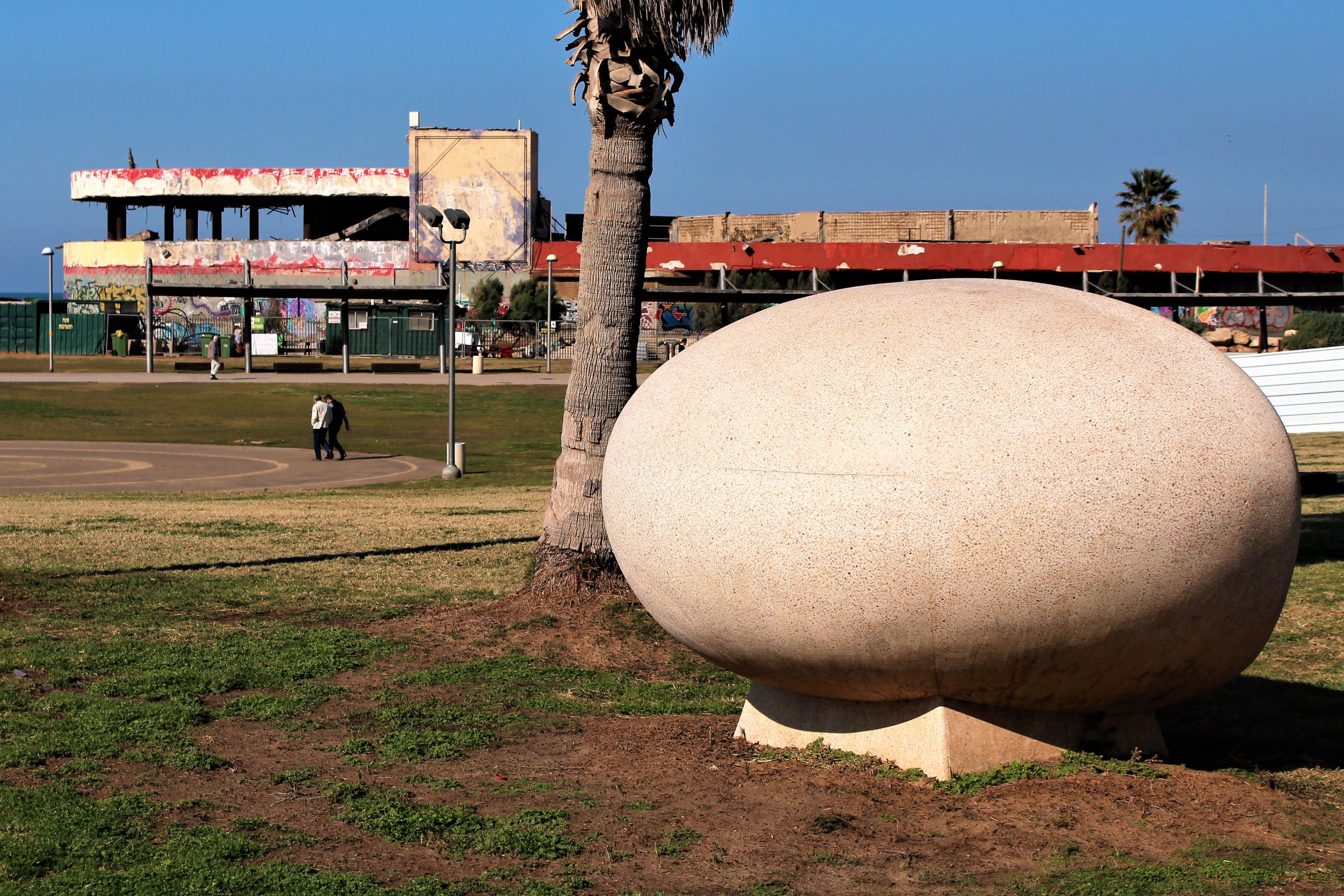 W okolicy nieistniejącego już delfinarium kończą się plaże, a zaczyna park z piękną promenadą wzdłuż wybrzeża. Przez kolejne kilkaset metrów idziemy wzdłuż porośniętego trawami terenu z nielicznymi palmami drzewami tamaryszkowymi we wschodniej części parku. Wcześniej znajdowało się w tym miejscu arabskie osiedle Menaszijja, czyli niegdysiejsza północna część Jafy.