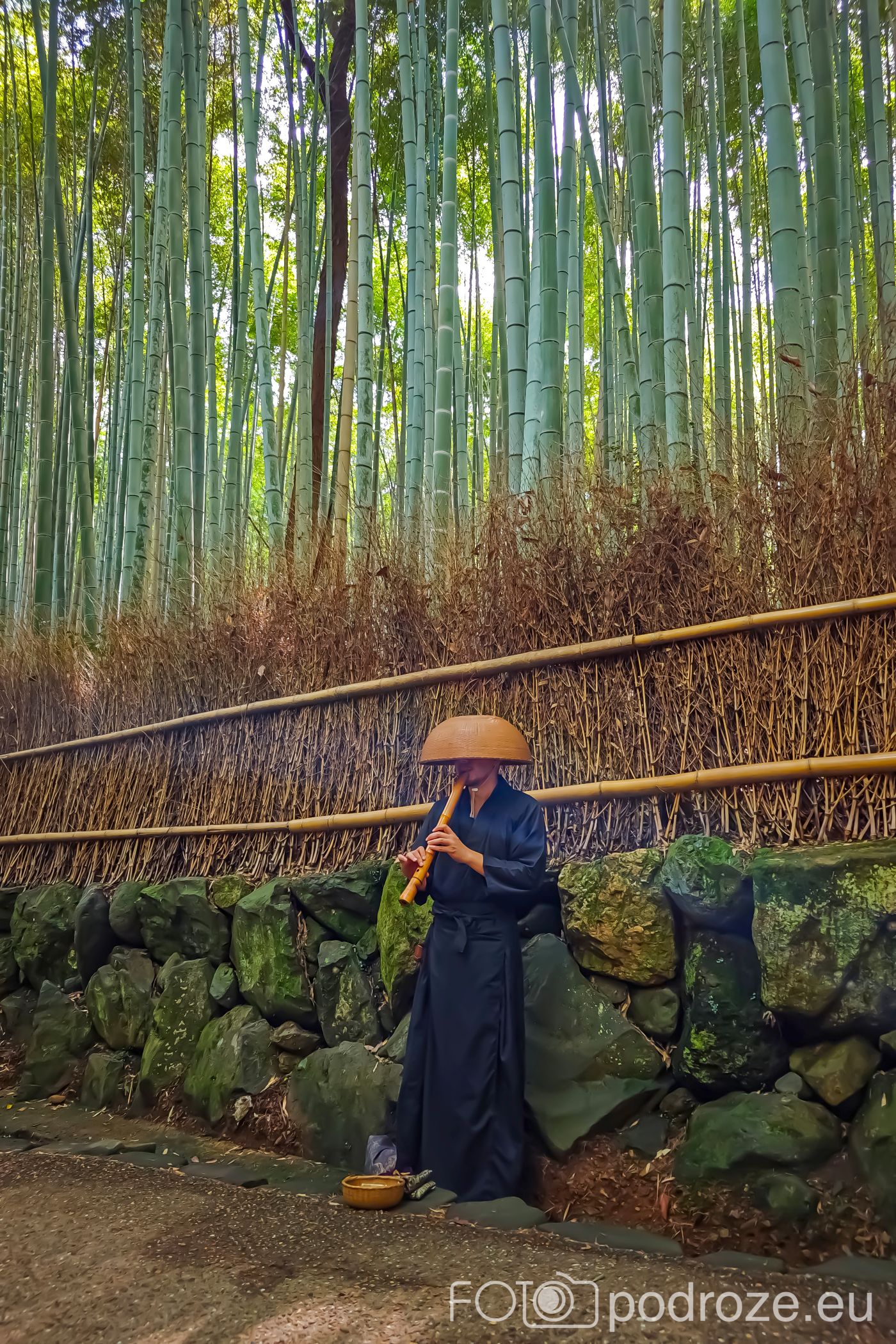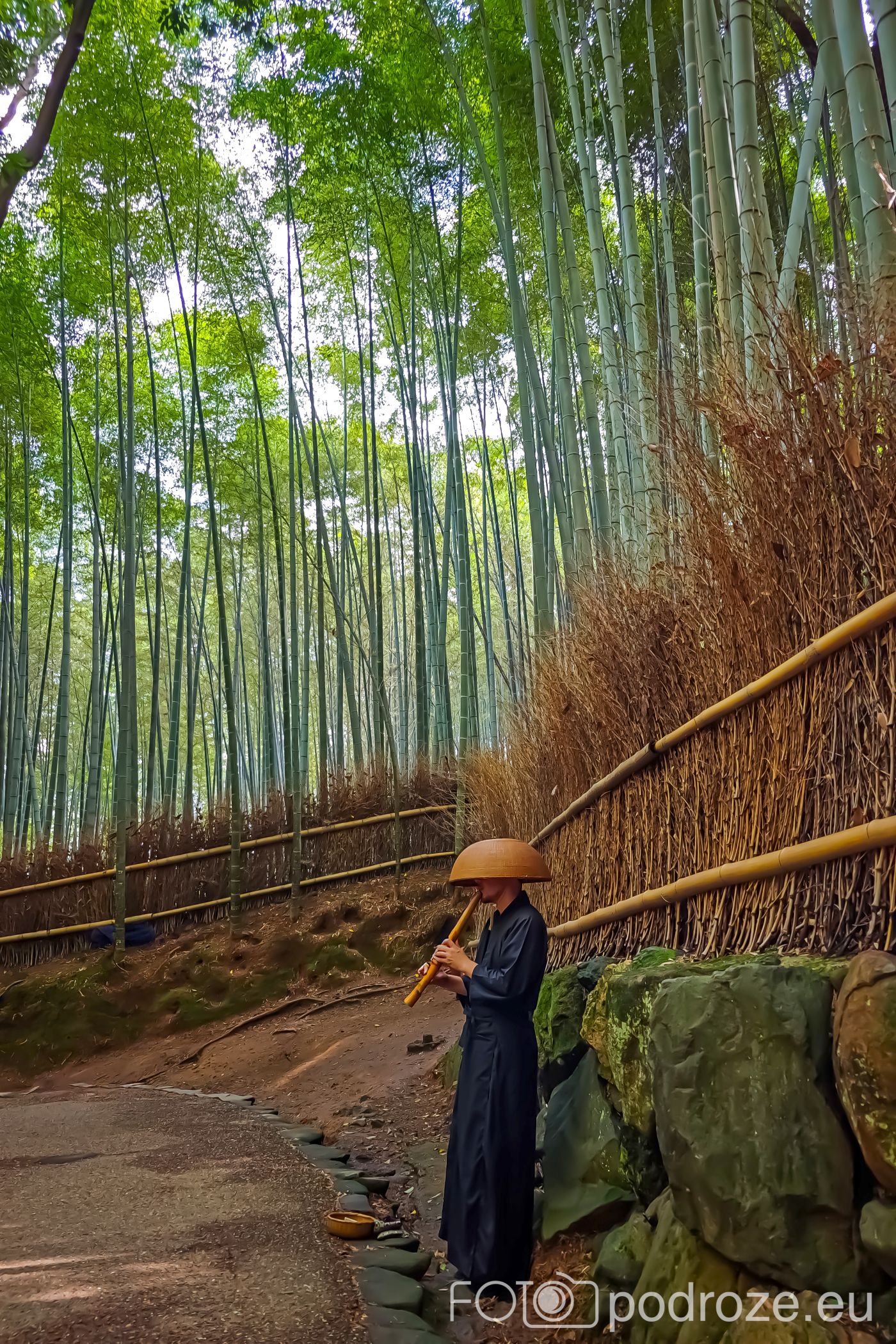 W połowie trasy często można natrafić na grajka w tradycyjnym stroju, który przygrywa na instrumencie przypominającym fujarkę lub shakuhachi. Jego spokojna, nastrojowa melodia w połączeniu z szumem bambusów tworzy niemal mistyczną atmosferę, jakby czas na chwilę zwalniał, a każdy krok stawał się częścią medytacyjnego rytmu natury.