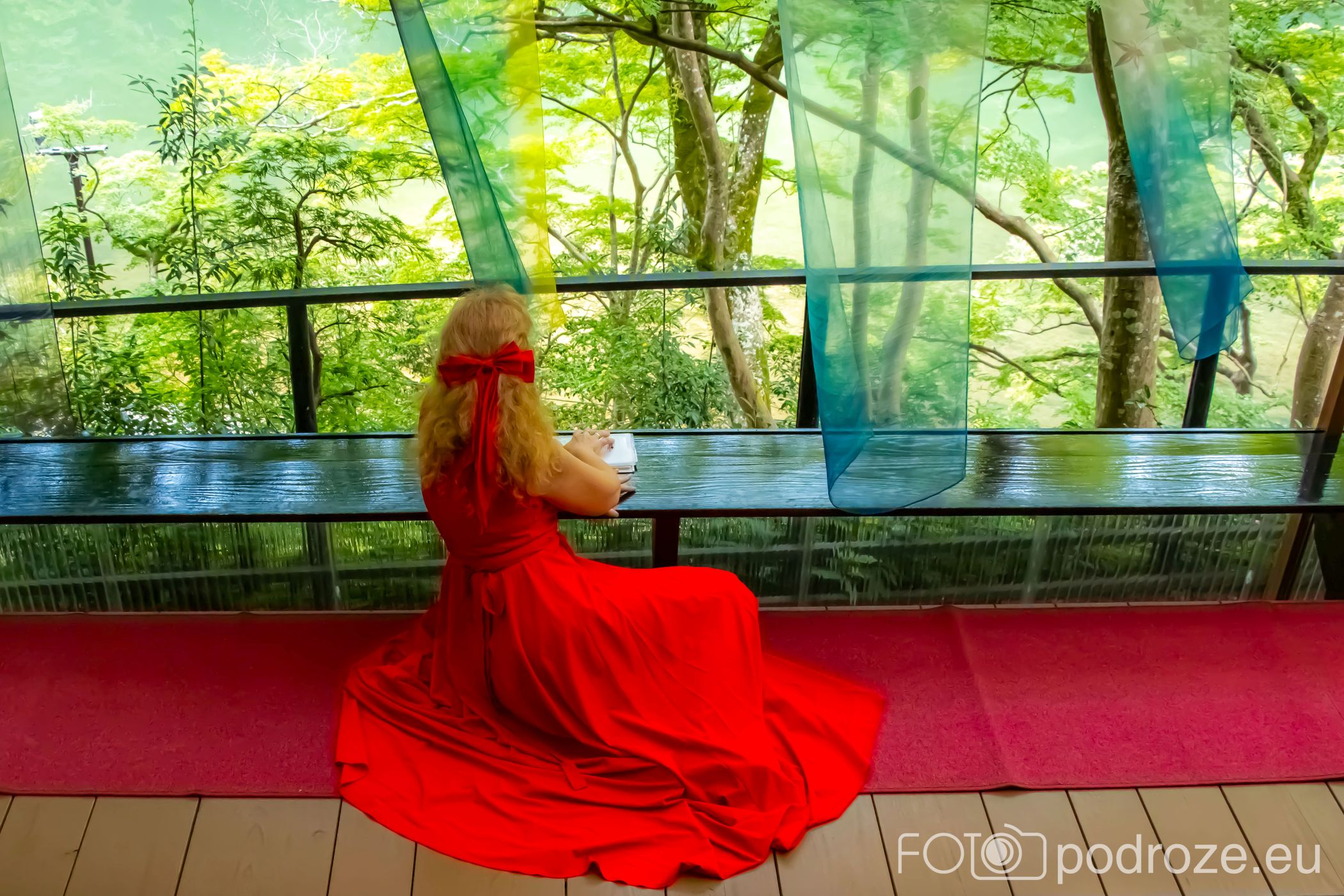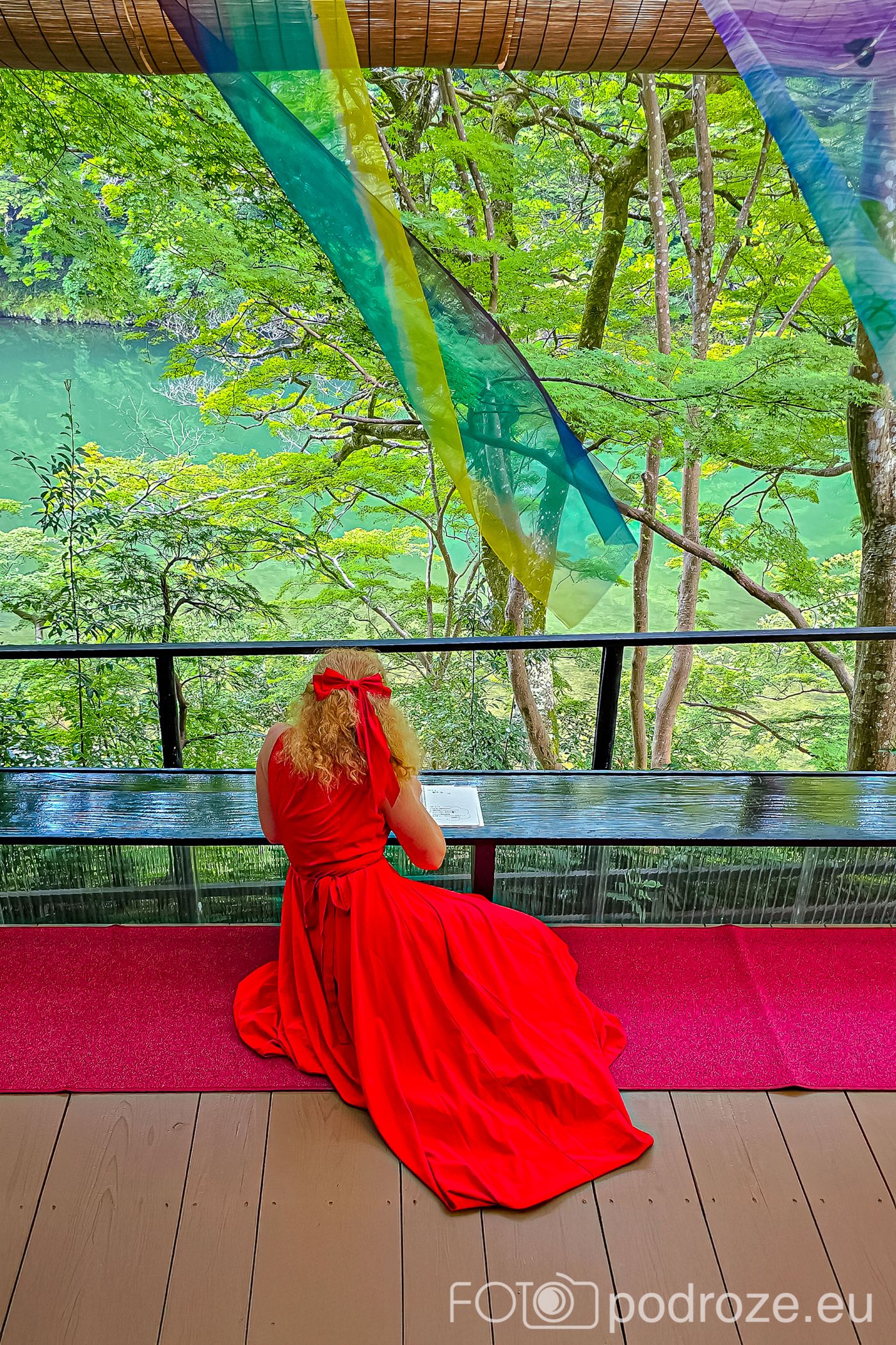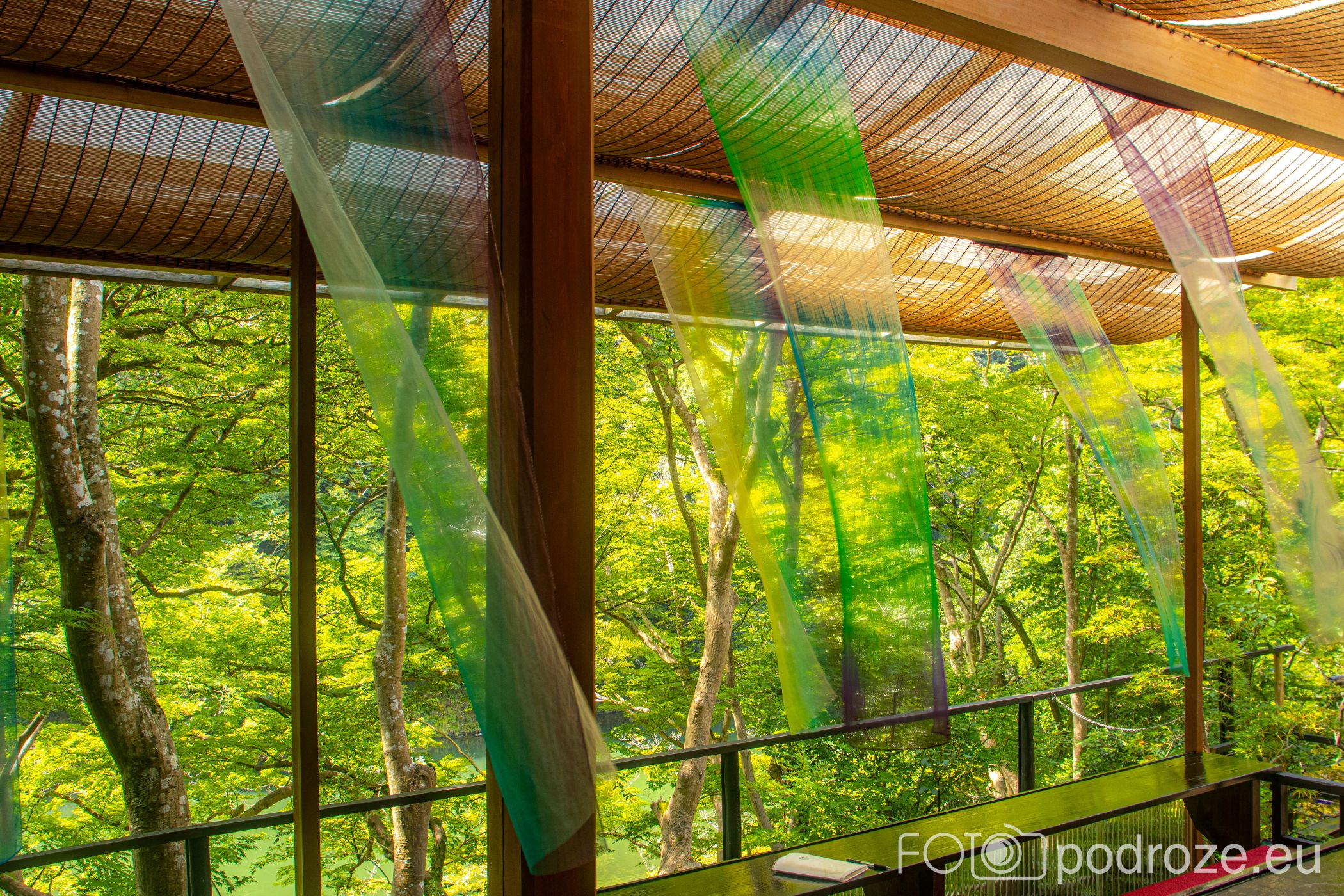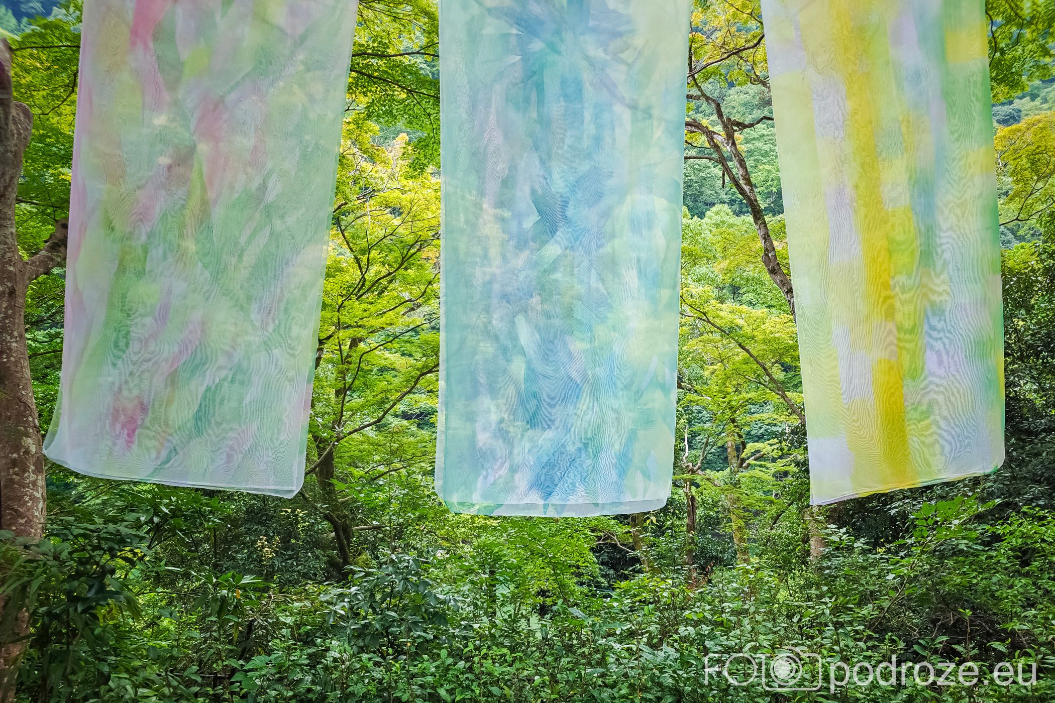 Prawdziwa magia czeka jednak na zewnątrz. Taras wychodzący na rzekę Katsura jest sceną dla niezwykłego spektaklu natury i sztuki. Jedwabne szale rozwieszone na drewnianych ramach delikatnie powiewają na wietrze, reagując na światło, wilgoć i ruch powietrza. W małych basenikach z wodą odbija się niesamowita zieleń. Tu nic nie jest przypadkowe …