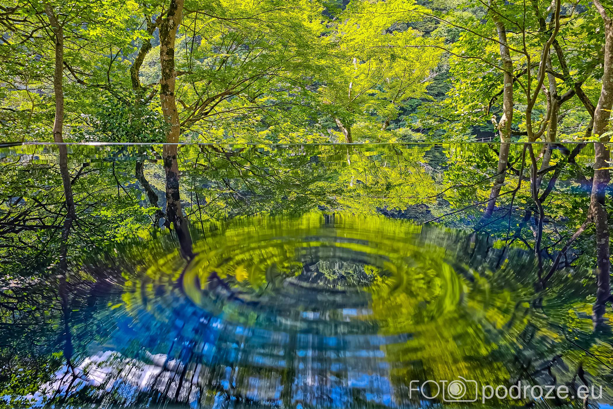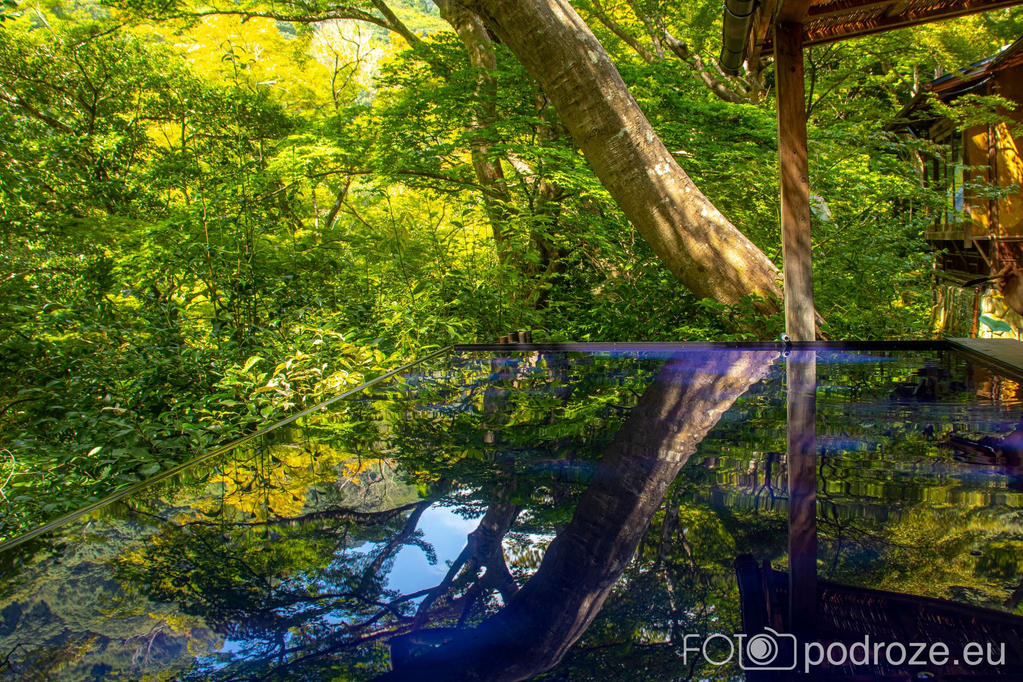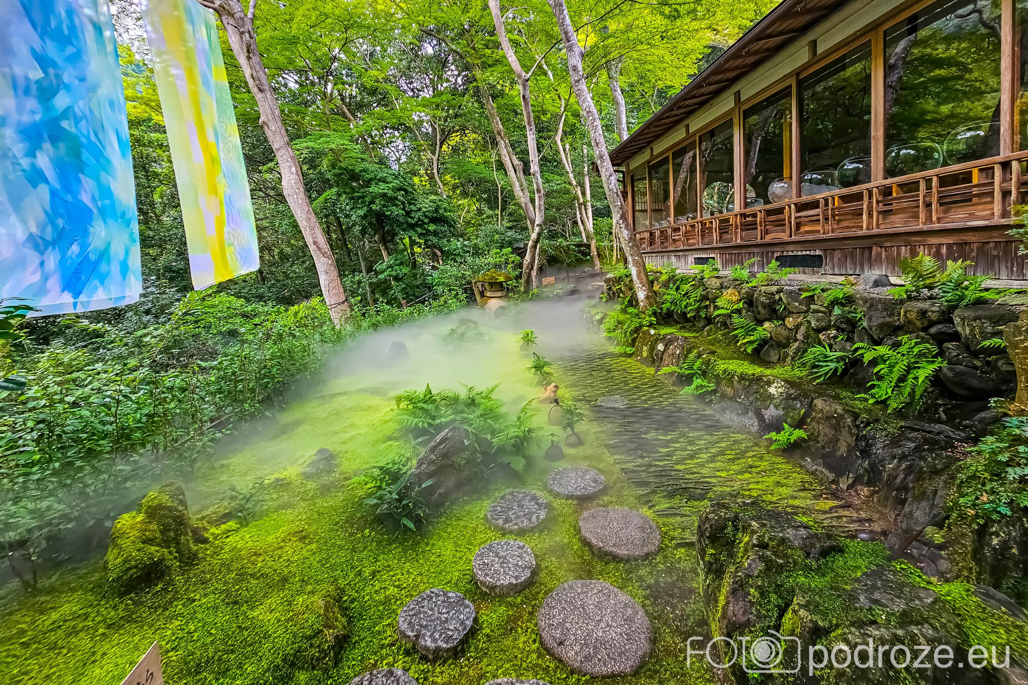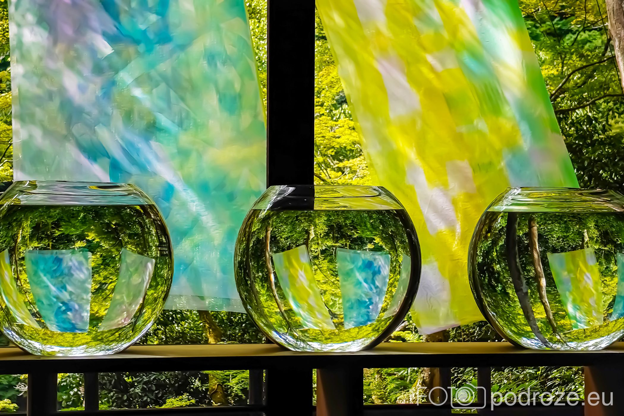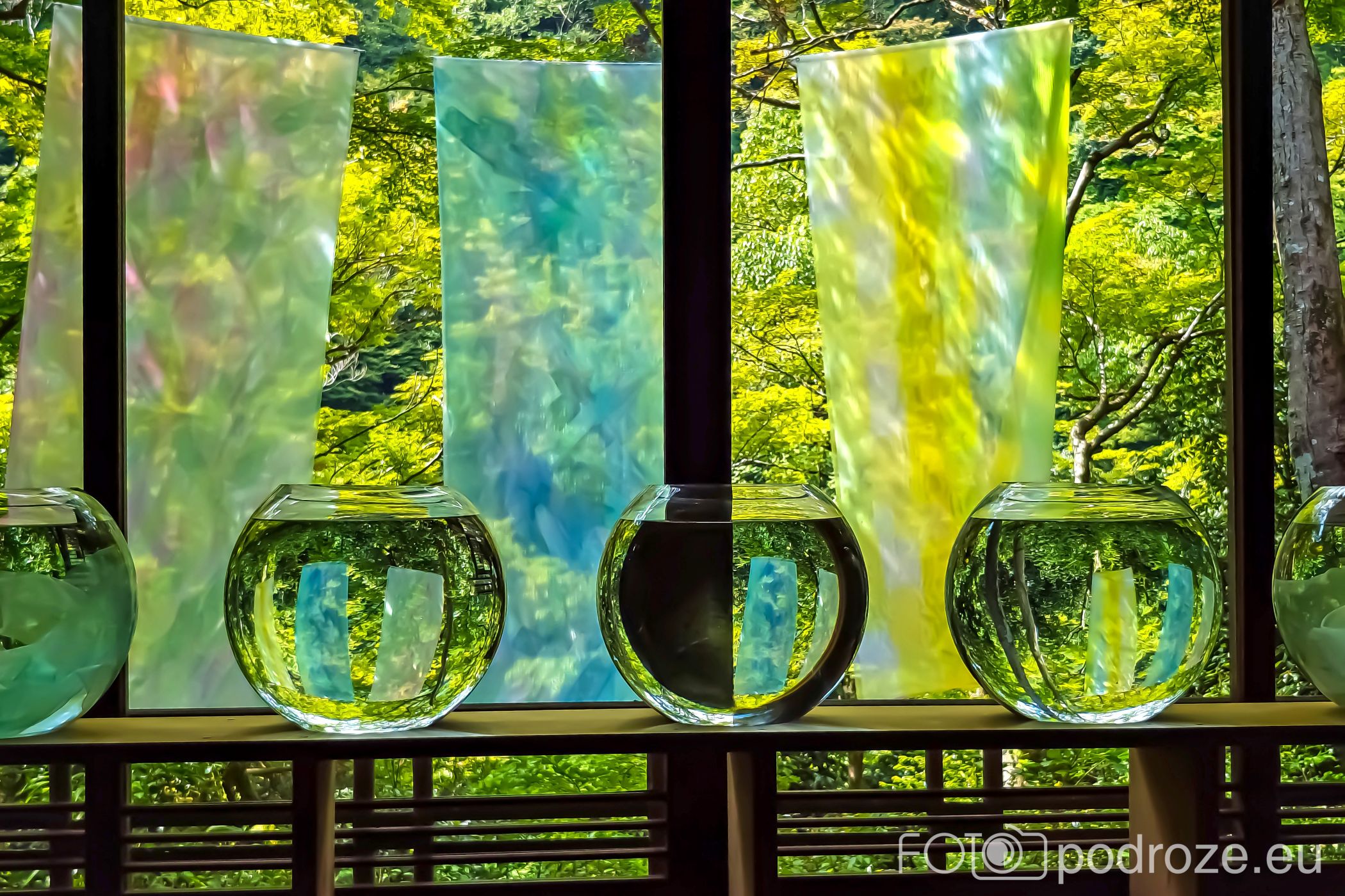 Prawdziwa magia czeka jednak na zewnątrz. Taras wychodzący na rzekę Katsura jest sceną dla niezwykłego spektaklu natury i sztuki. Jedwabne szale rozwieszone na drewnianych ramach delikatnie powiewają na wietrze, reagując na światło, wilgoć i ruch powietrza. W małych basenikach z wodą odbija się niesamowita zieleń. Tu nic nie jest przypadkowe …