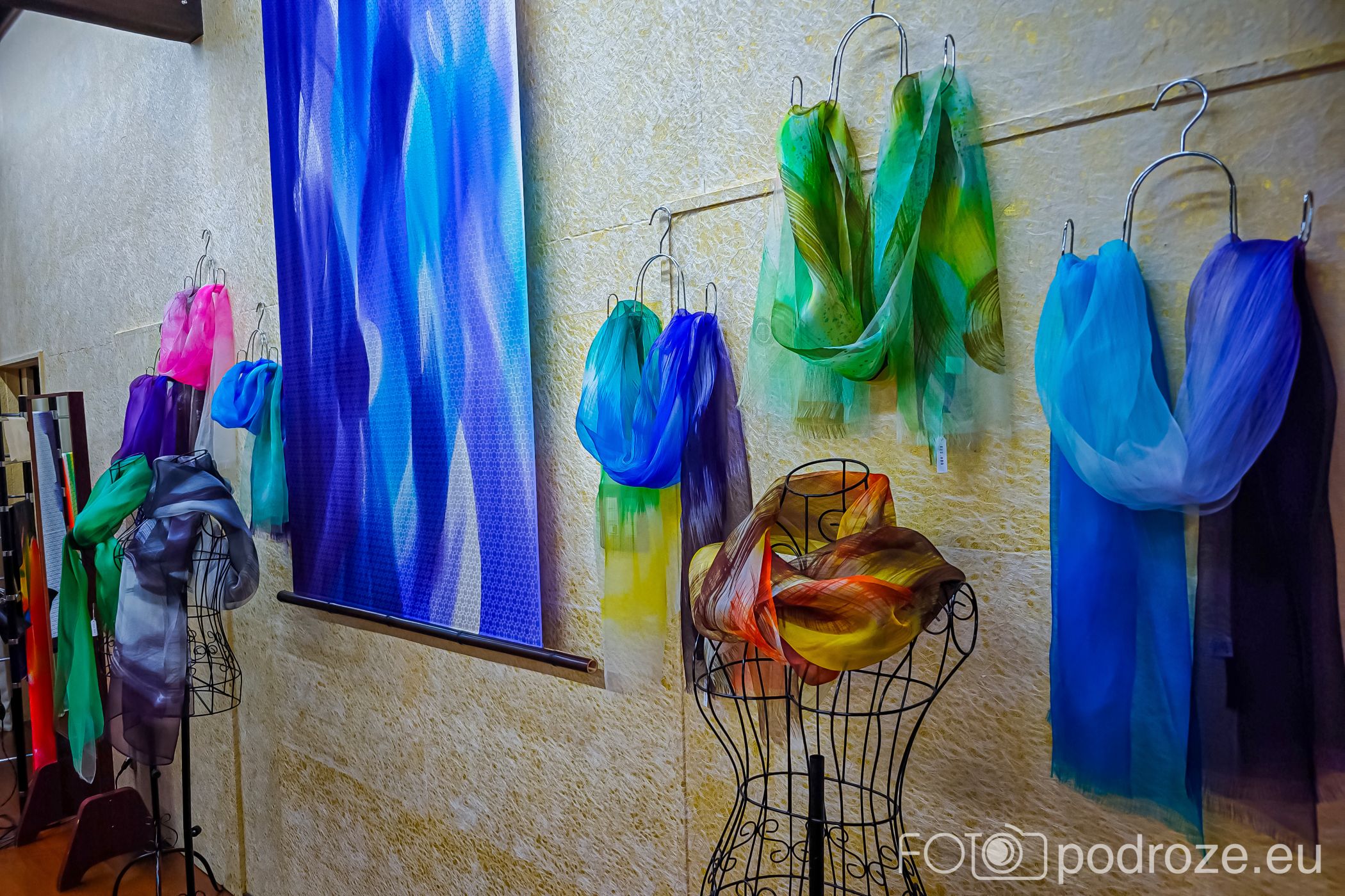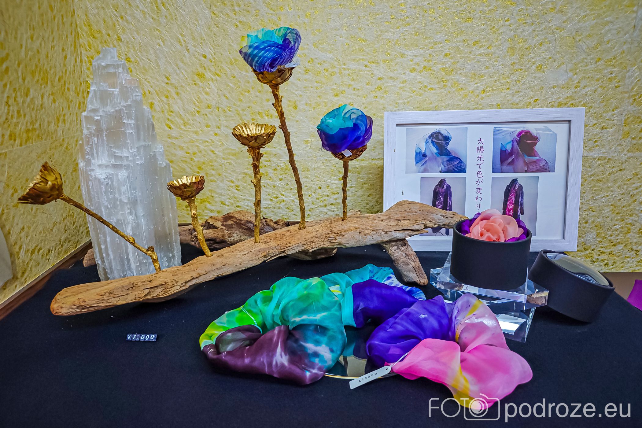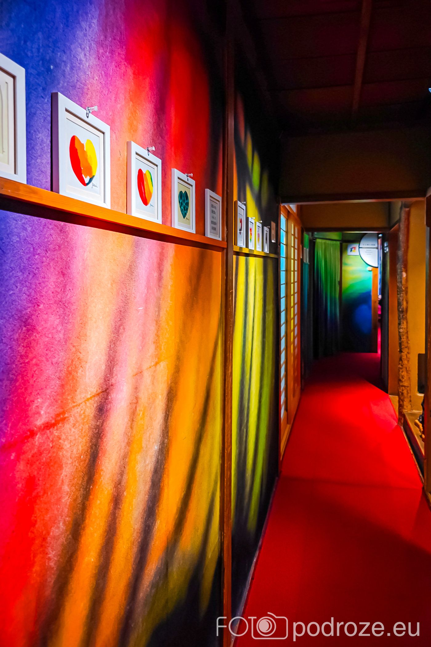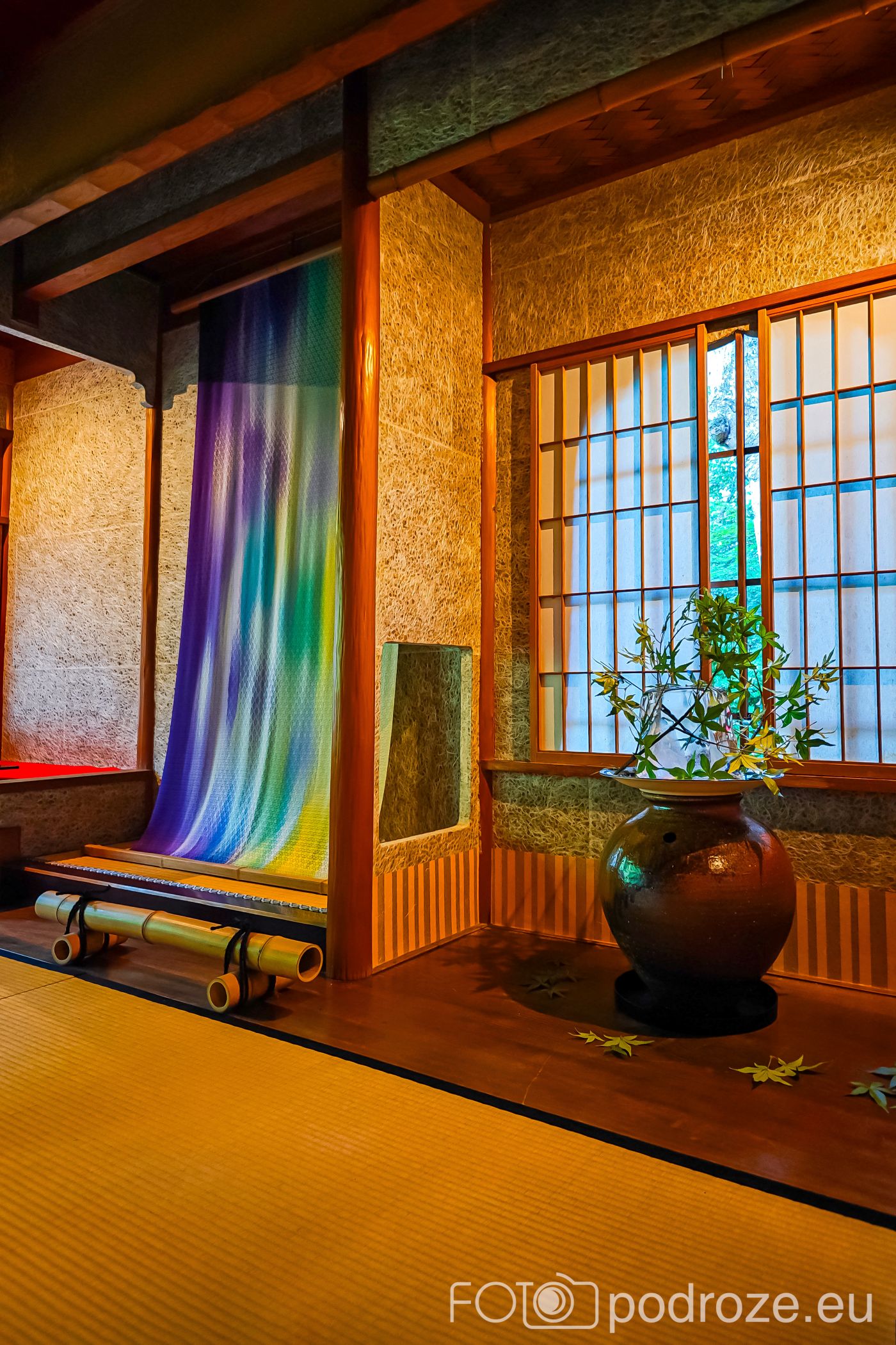 Wnętrza galerii są minimalistyczne, niemal ascetyczne, ale pełne znaczeń. Drewniane podłogi, maty tatami i subtelne światło tworzą idealne tło dla barwnych dzieł mistrza farbowania jedwabiu Yūsai Okamoto. Intensywne kolory tkanin kontrastują z ciszą przestrzeni, a ich odbicia w wypolerowanych podłogach sprawiają wrażenie, jakby wzory unosiły się w powietrzu. To miejsce, które bardziej się odczuwa, niż zwiedza. Panuje tu kompletna cisza, nikt nie śmie się odezwać, a wszyscy poruszają się na paluszkach, aby nie zakłócić tej niesamowitej atmosfery.