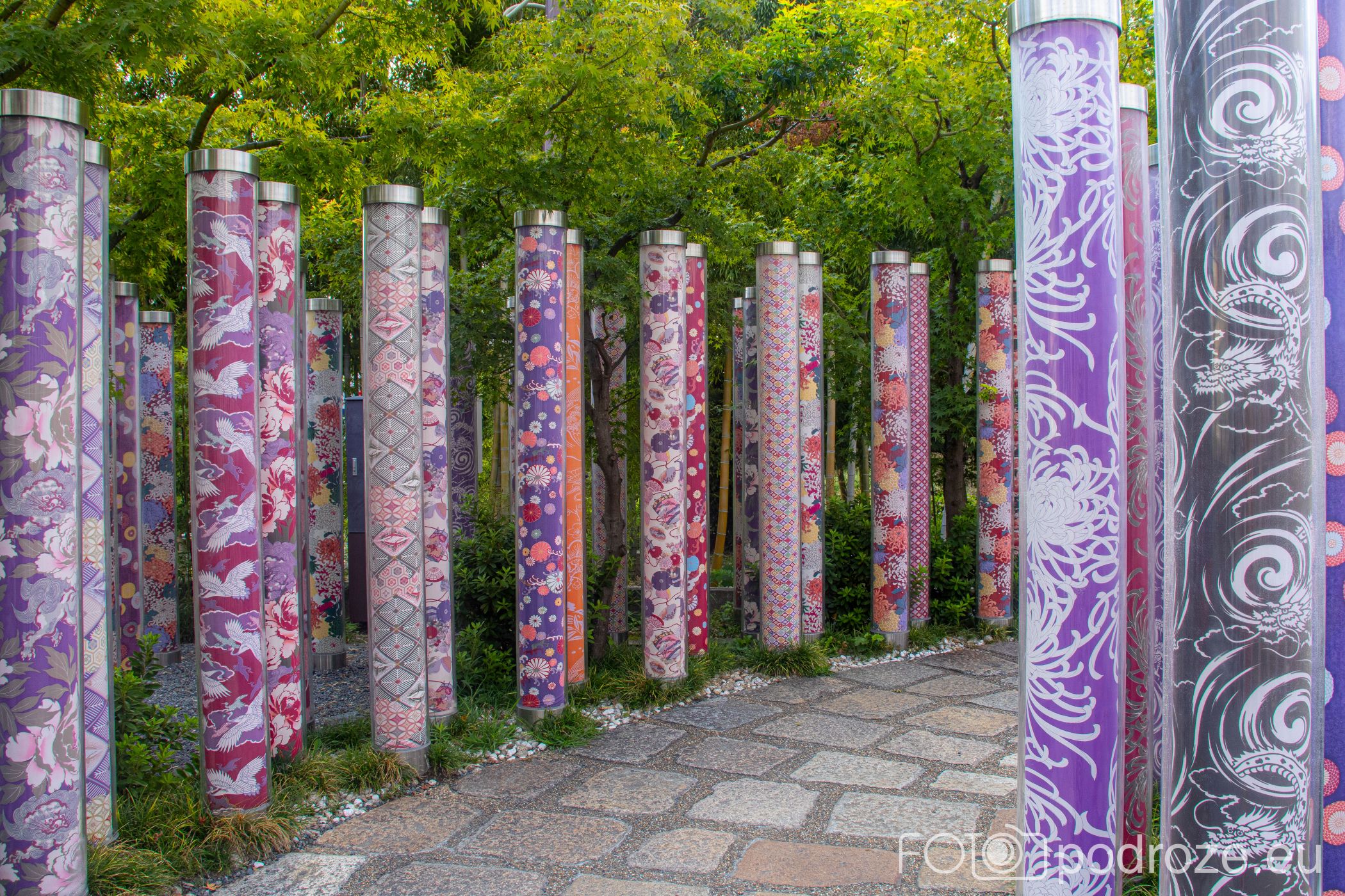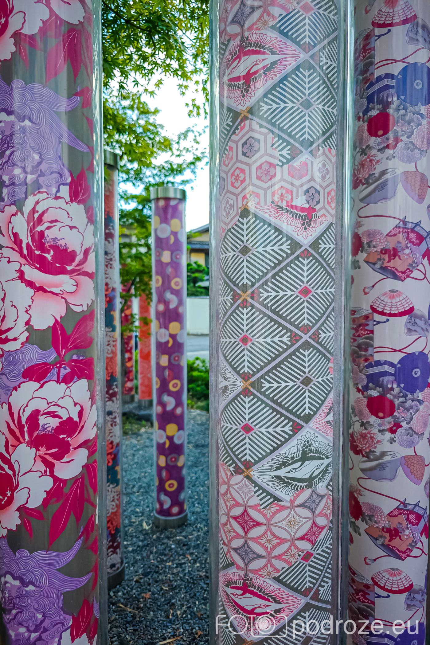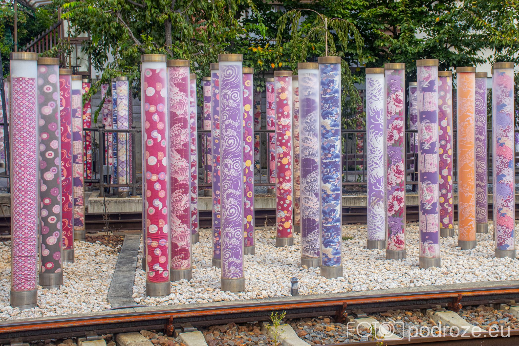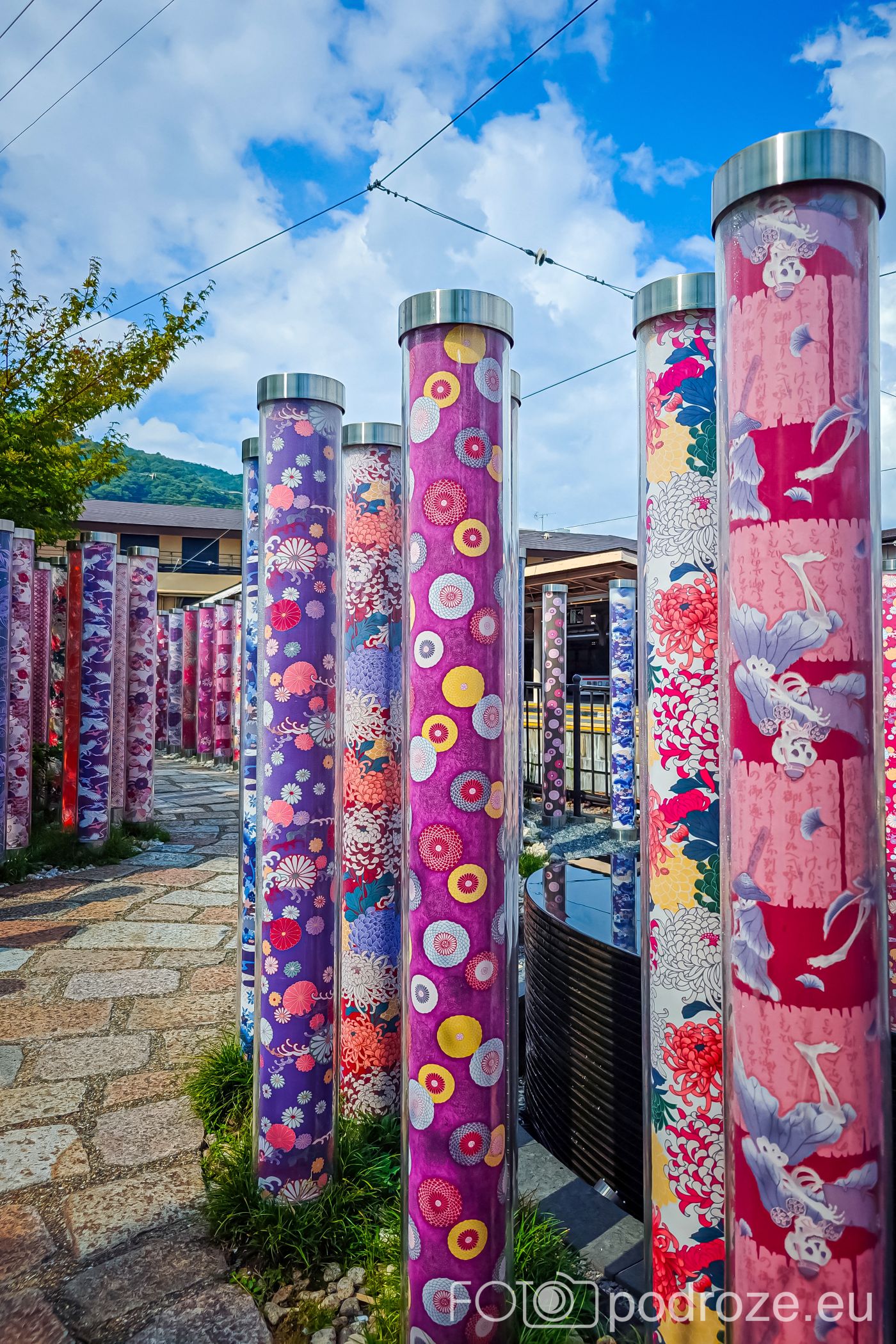 Do tej dzielnicy warto dotrzeć pociągiem jeszcze z innego powodu. Na stacji końcowej znajduje się bowiem Kimono Forest. To jedna z najbardziej fotogenicznych atrakcji Arashiyamy. Instalacja składa się z ponad 600 podświetlanych 2-metrowych kolumn, z których każda ozdobiona jest innym wzorem tradycyjnego kimona kyō-yūzen, czyli charakterystycznego stylu barwienia tkanin z Kioto. W ciągu dnia zachwycają detalami oraz kolorami, natomiast po zmroku zamieniają się w magiczny, świetlny las. W samym centrum instalacji znajduje się niewielki „smoczy staw” (Ryū no Atago no Ike), który według lokalnych wierzeń ma przynosić szczęście i oczyszczenie.