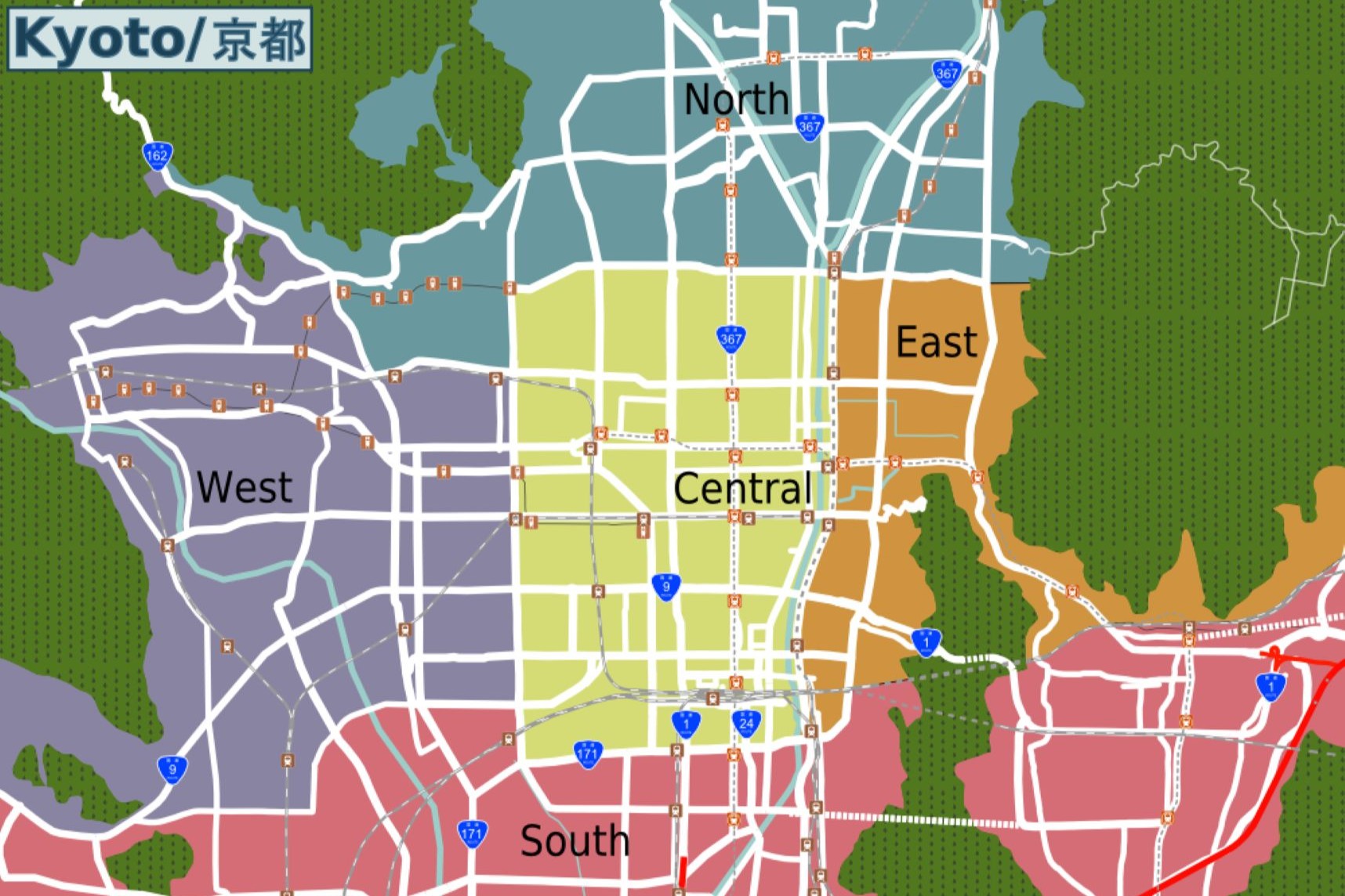 Centrum Kioto, zaznaczone na mapie jako obszar „Central”rozciąga się od okolic Zamek Nijō na zachodzie aż w kierunku rzeki Kamo na wschodzie, a od rejonu Pałacu Cesarskiego i północnych kwartałów śródmieścia po obszar w stronę Kyoto Station na południu. To zwarty, stosunkowo płaski teren o charakterystycznym, szachownicowym układzie ulic.
