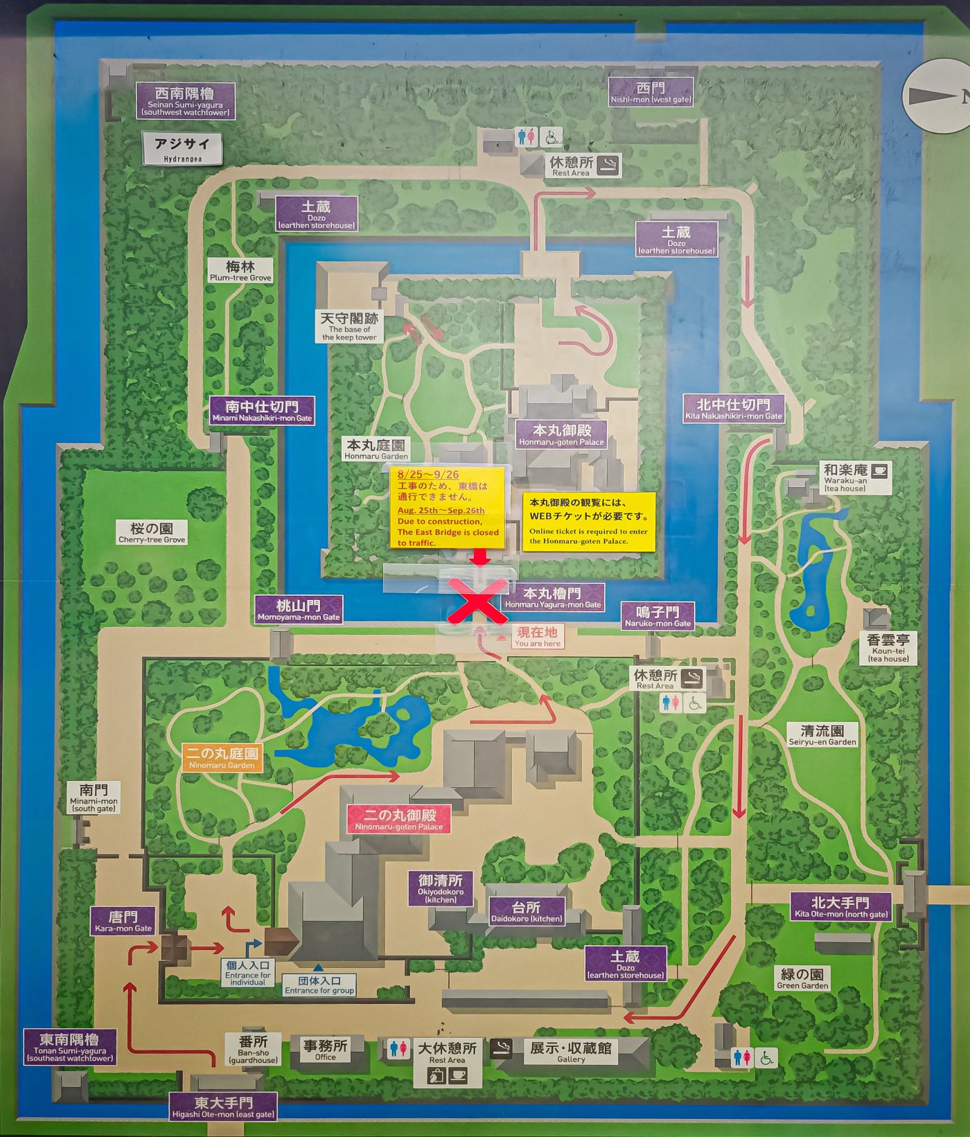 - UWAGI DODATKOWE: W Pałacu Ninomaru obowiązuje zakaz fotografowania, a przed wejściem do wnętrz należy zdjąć buty. Na miejscu: toalety, automat z napojami oraz niewielki sklep z pamiątkami.