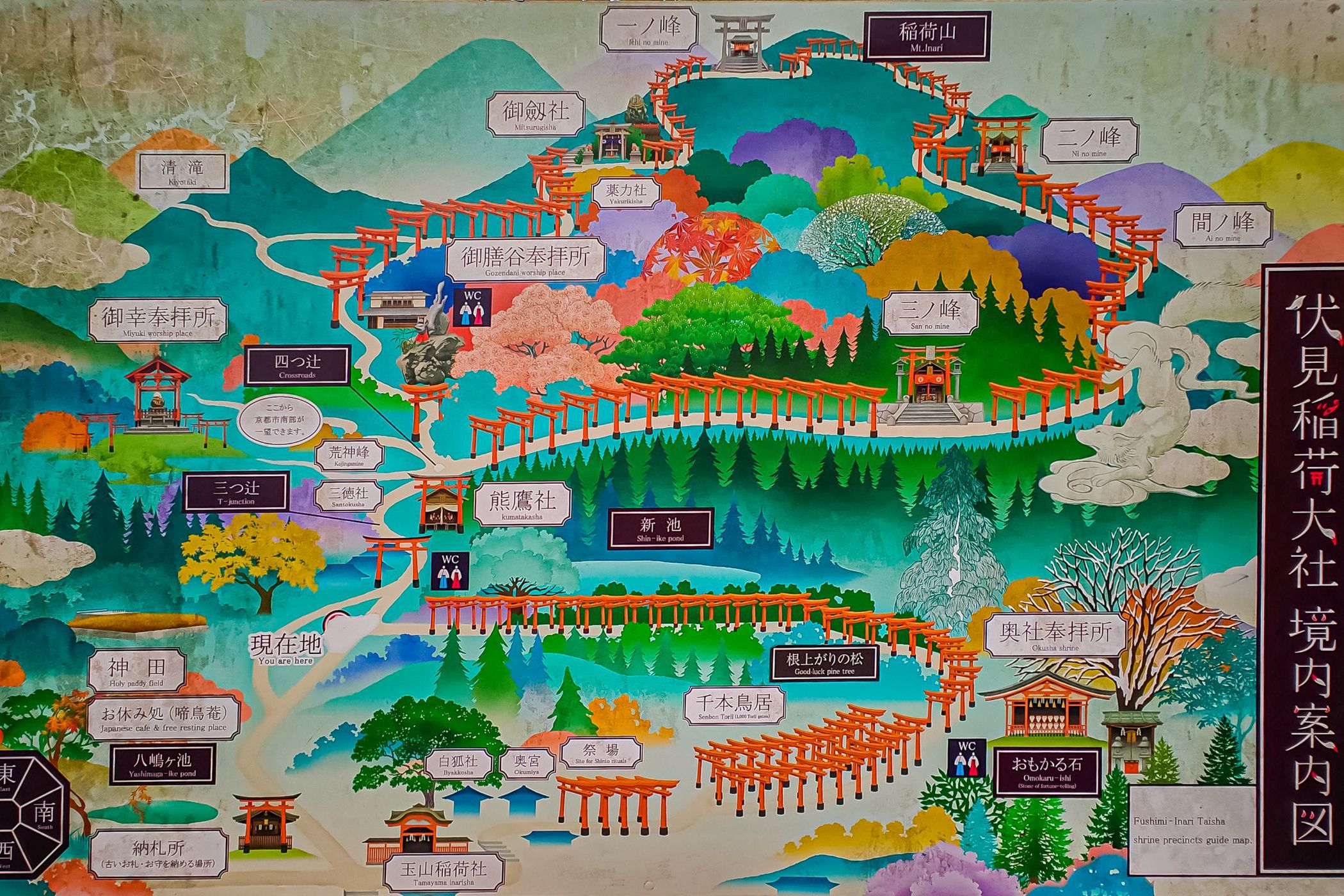 W pobliżu głównych budynków znajdują się także mniejsze kapliczki, pawilony z tabliczkami ema, na których wierni zapisują swoje życzenia. Jest tu także miejsca, gdzie można kupić amulety ochronne. Dopiero za tą reprezentacyjną częścią kompleksu rozpoczyna się słynna ścieżka z tysiącami bram torii prowadząca w głąb górskiego sanktuarium.