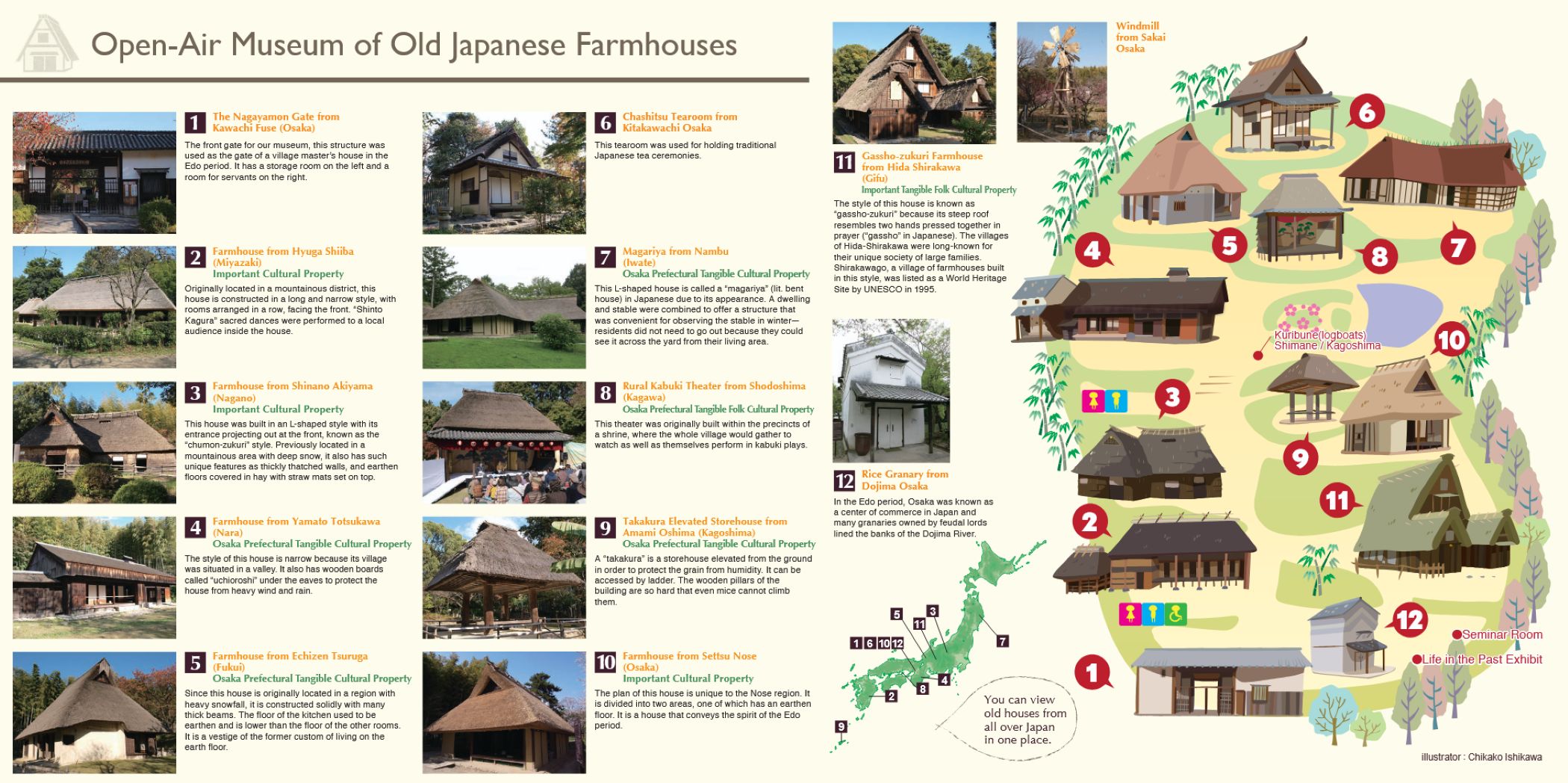 Na terenie muzeum zgromadzono oryginalne historyczne domy, które przeniesiono z różnych regionów kraju. Są tu dawne chaty chłopskie, domy kupców oraz budynki rzemieślników. Każdy obiekt pokazuje inny styl życia i inne warunki klimatyczne, w jakich mieszkali dawni Japończycy.