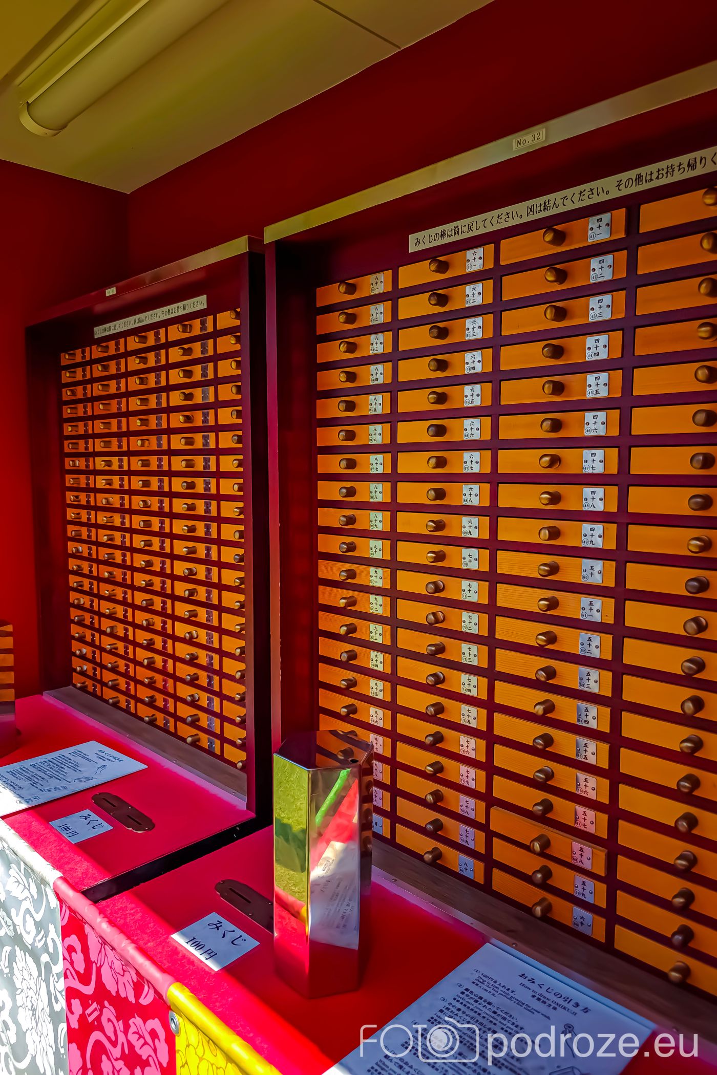 Na terenie świątyni można również wylosować omikuji, czyli tradycyjną wróżbę. Dobrą przepowiednię zabiera się ze sobą, a złą wiąże na specjalnych stojakach, symbolicznie pozostawiając pecha w świątyni.