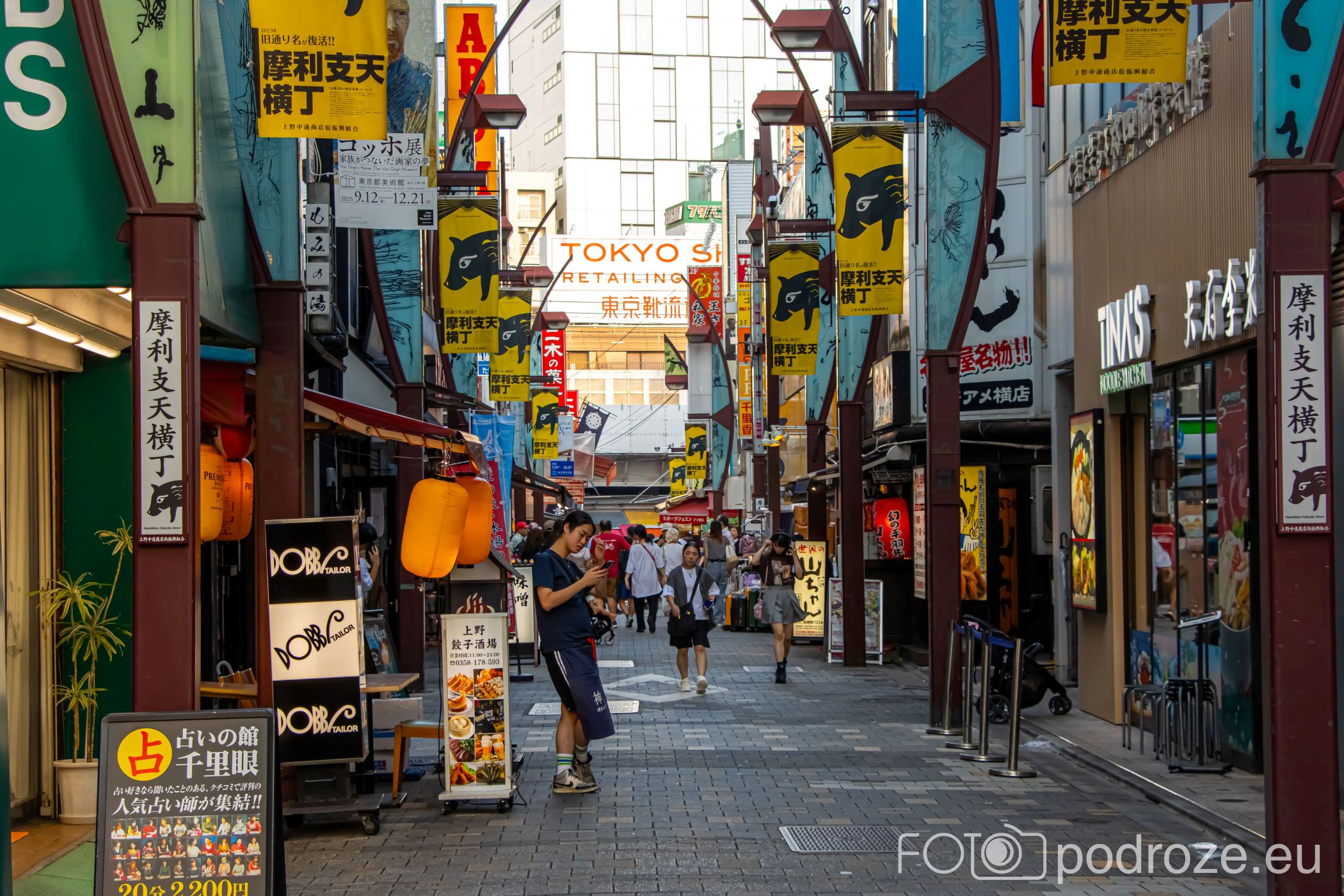 Najbardziej znana jest okolica Ameyoko (Ameya-Yokochō). To tętniąca życiem ulica pełna sklepów z odzieżą, kosmetykami, elektroniką, owocami morza i ulicznym jedzeniem. W bocznych uliczkach znajdziecie małe bary, izakaye i restauracje, które wieczorami przyciągają mieszkańców wracających z pracy.