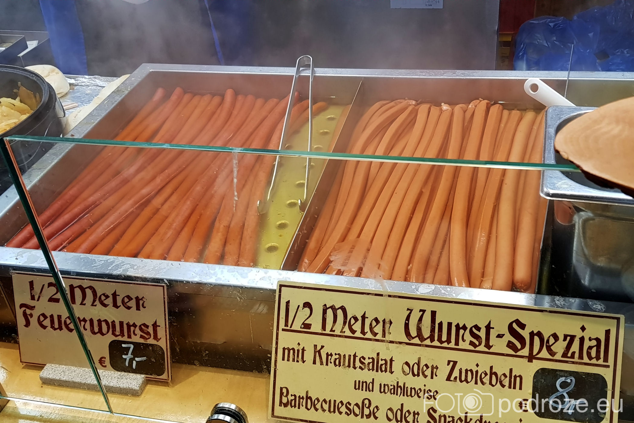 Zanim nacieszymy oczy, trzeba pomyśleć o żołądku. To co wyróżnia ten jarmark to wszechobecna kiełbaska, której historia w tym mieście sięga aż 700 lat wstecz. Nürnberger Rostbratwürstchen, czyli mała grillowana kiełbaska, wyrabiana według receptury z XIV wieku to flagowy i zastrzeżony produkt tylko tego regionu. Ale na straganach znajdziemy coś jeszcze, a mianowicie pół metrowe parówki.