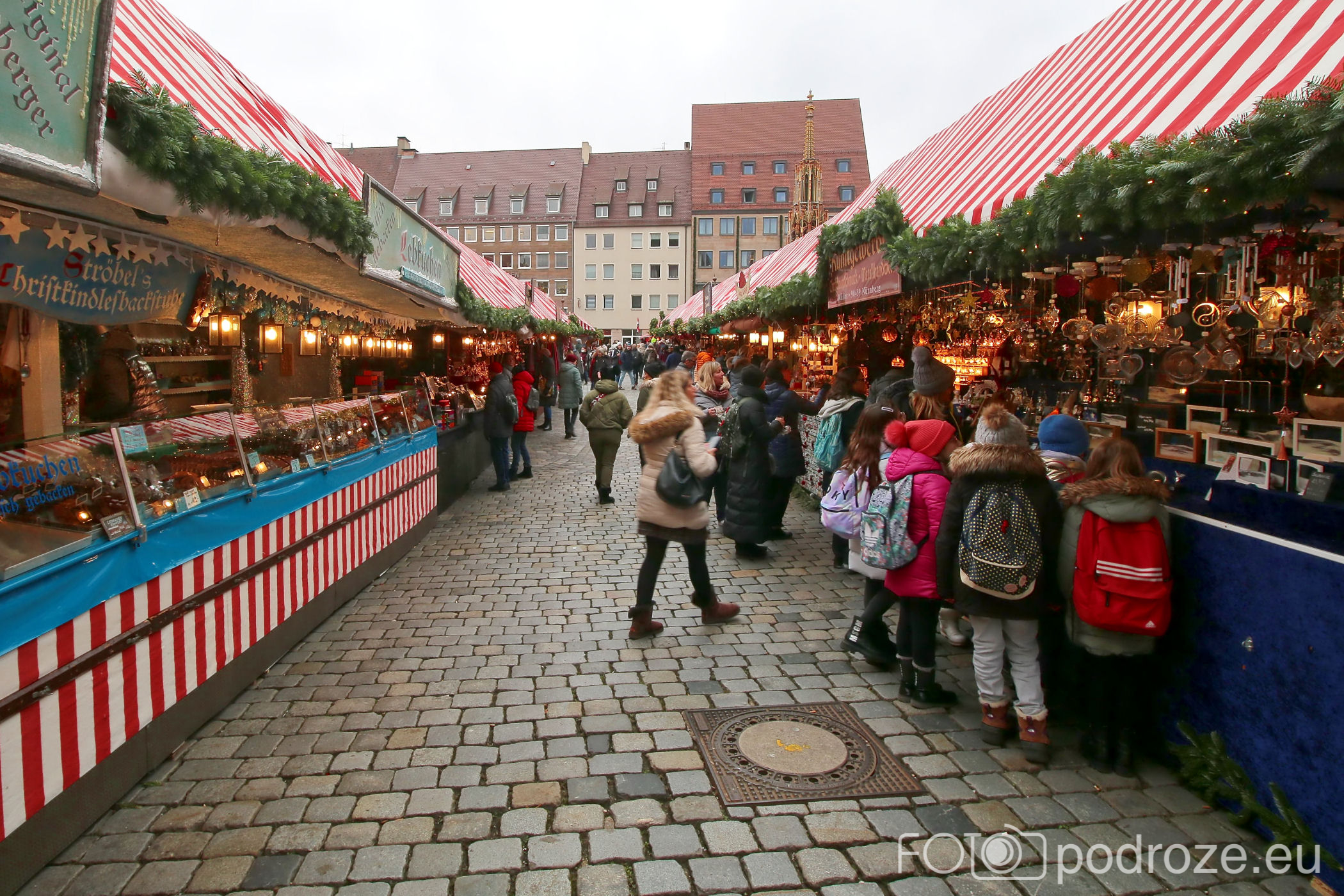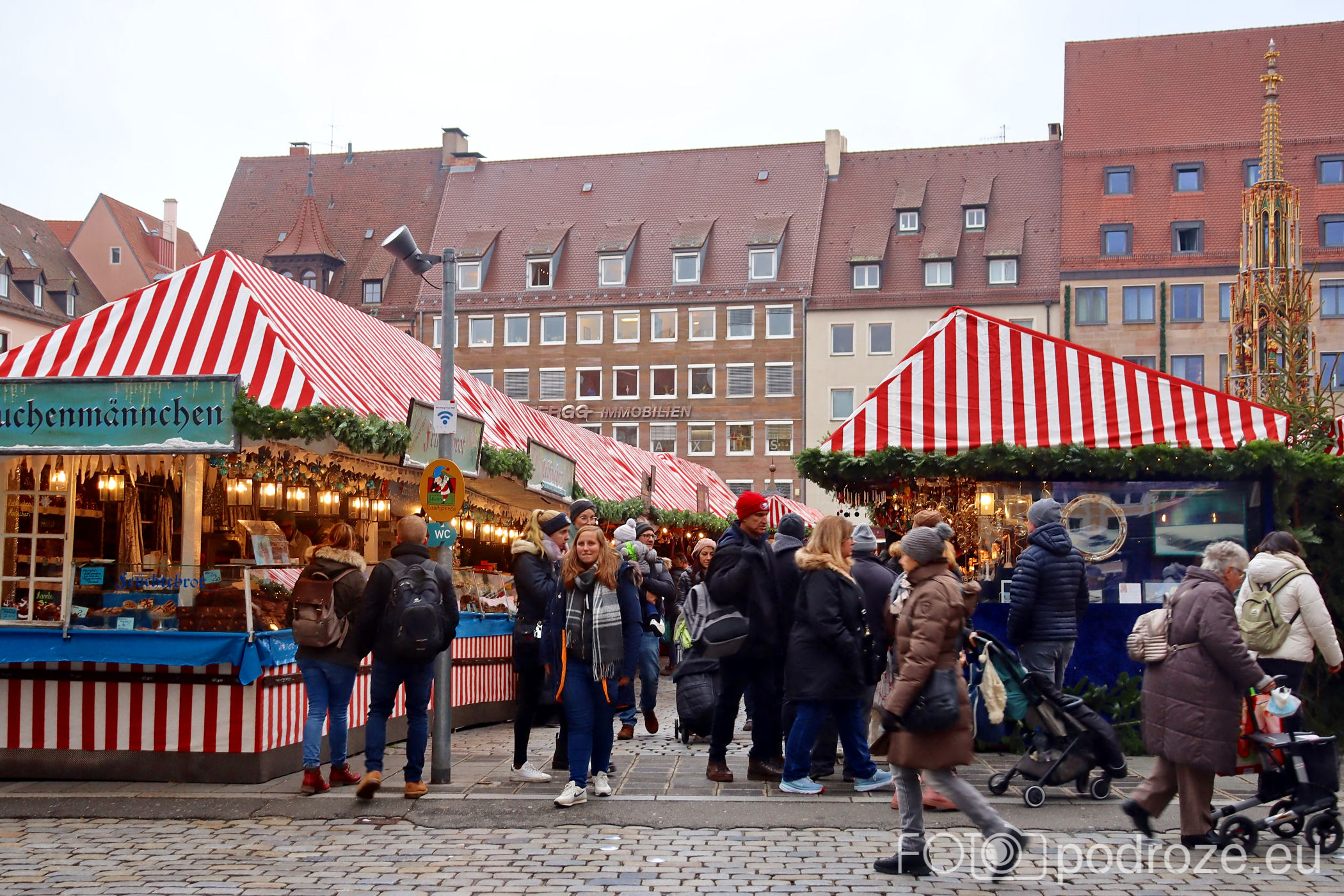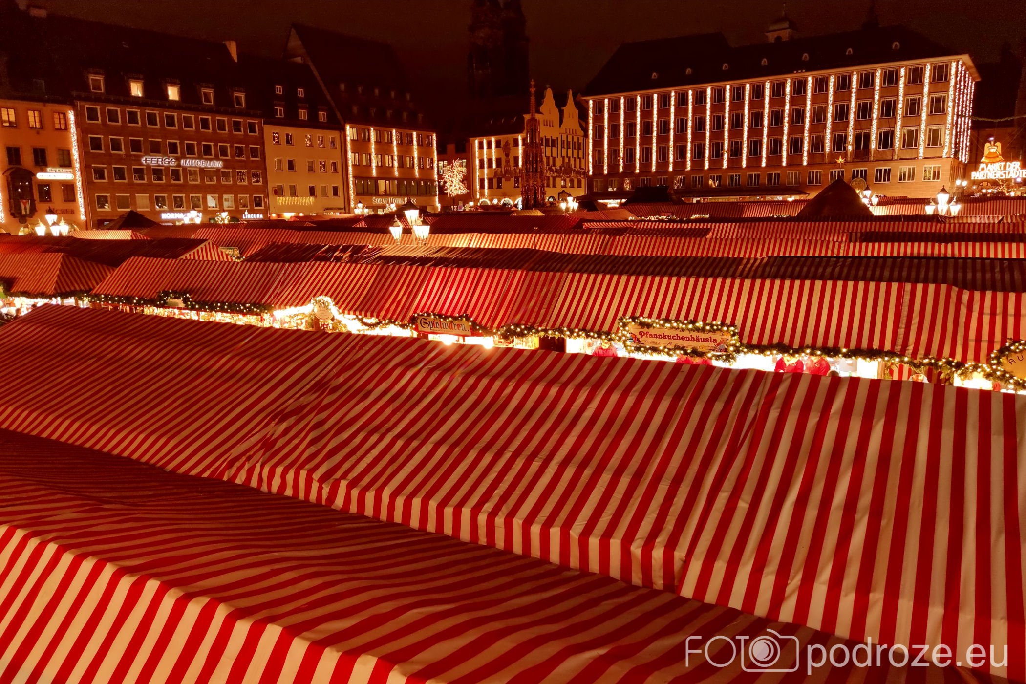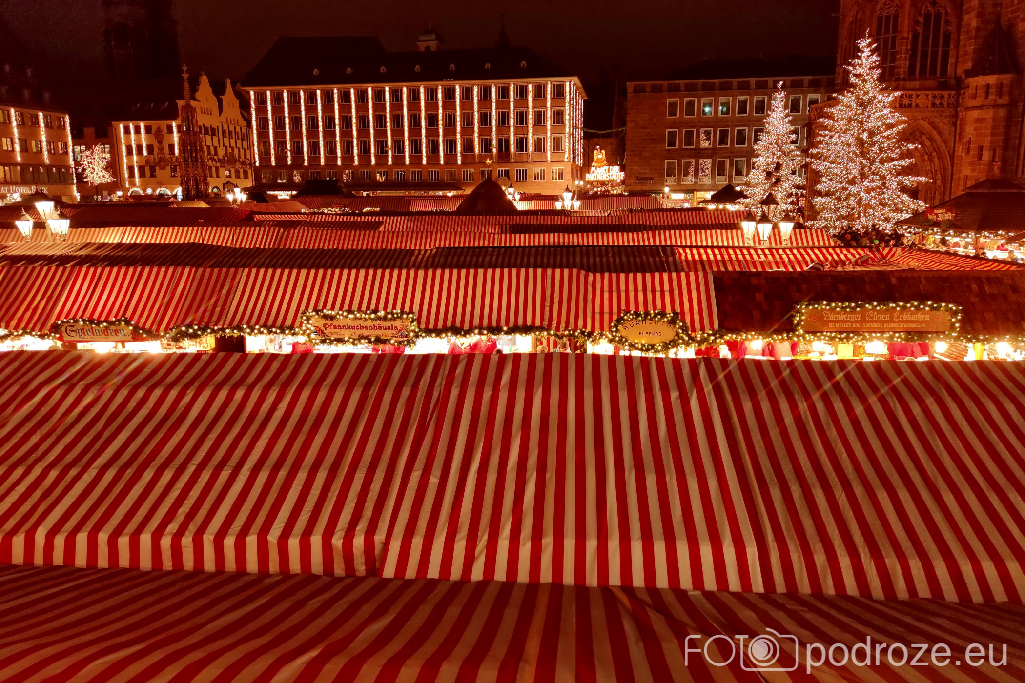Zaczynamy od głównego, historycznego placu. Jego historia sięga XVI wieku, kiedy to podobno odbył się pierwszy jarmark przedświąteczny. Niestety zabudowa historyczny została zniszczona w czasie wojny i odbudowana już w zupełnie innym stylu, bo w okresie modernizmu. Teraz kompletnie nie pasuje do tego miejsca. Jedynie górujący nad placem kościół Frauenkirche i przepiękna historyczna studnia Schöner Brunnen pozwalają oczami wyobraźni przywołać tamte czasy. Jarmark z góry wygląda inaczej niż te które widzieliśmy w poprzednich latach. Wszystkie stoiska przykryte są jednolitymi dachami w biało – czerwone pasy. I nie ma na nich żadnych dekoracji, ani oświetlenia.