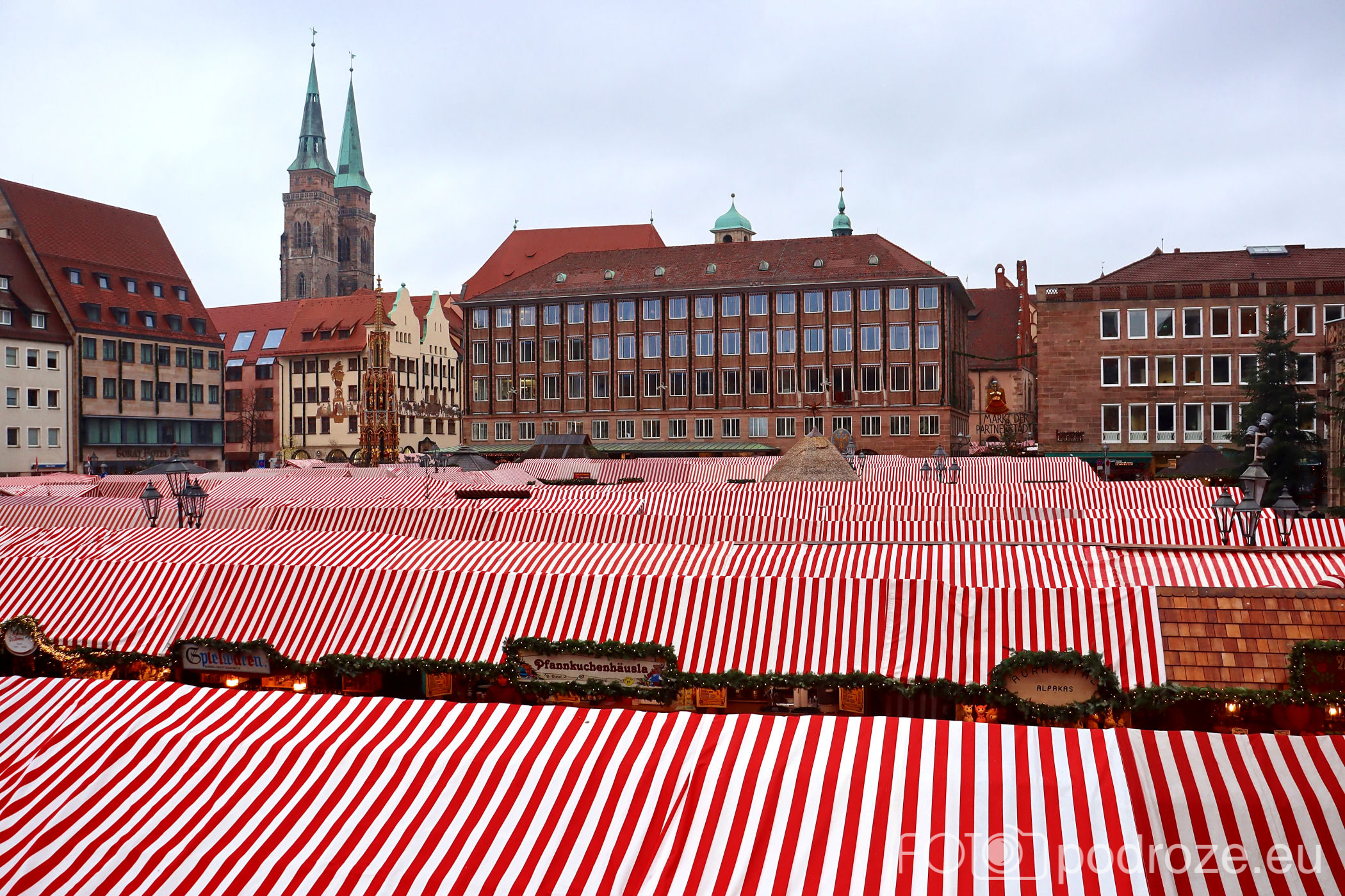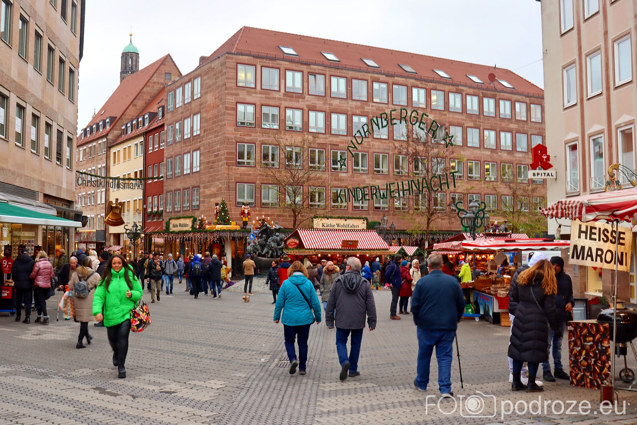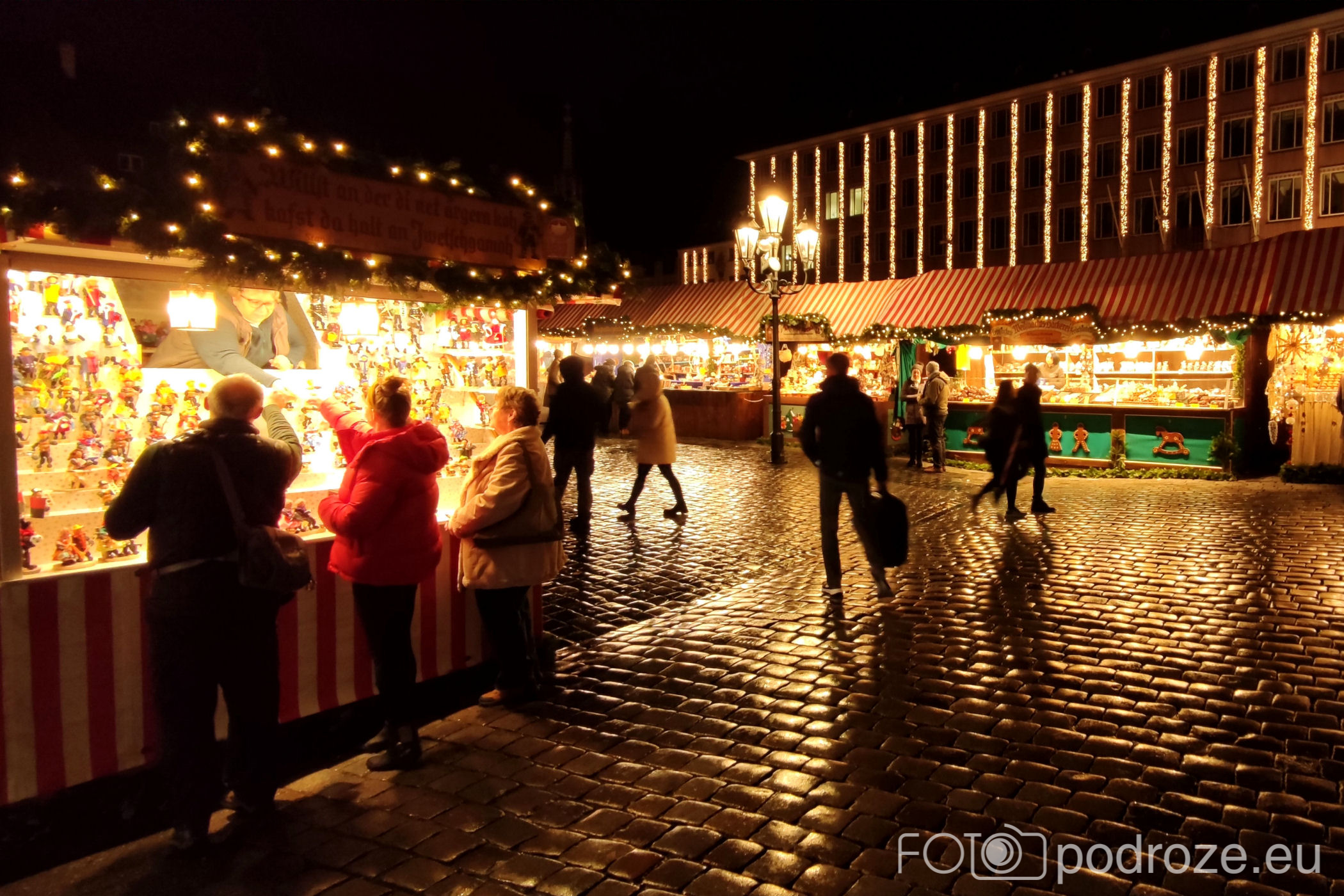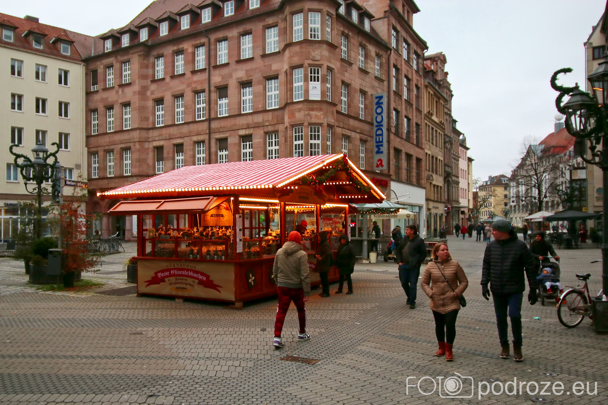 Zaczynamy od głównego, historycznego placu. Jego historia sięga XVI wieku, kiedy to podobno odbył się pierwszy jarmark przedświąteczny. Niestety zabudowa historyczny została zniszczona w czasie wojny i odbudowana już w zupełnie innym stylu, bo w okresie modernizmu. Teraz kompletnie nie pasuje do tego miejsca. Jedynie górujący nad placem kościół Frauenkirche i przepiękna historyczna studnia Schöner Brunnen pozwalają oczami wyobraźni przywołać tamte czasy. Jarmark z góry wygląda inaczej niż te które widzieliśmy w poprzednich latach. Wszystkie stoiska przykryte są jednolitymi dachami w biało – czerwone pasy. I nie ma na nich żadnych dekoracji, ani oświetlenia.