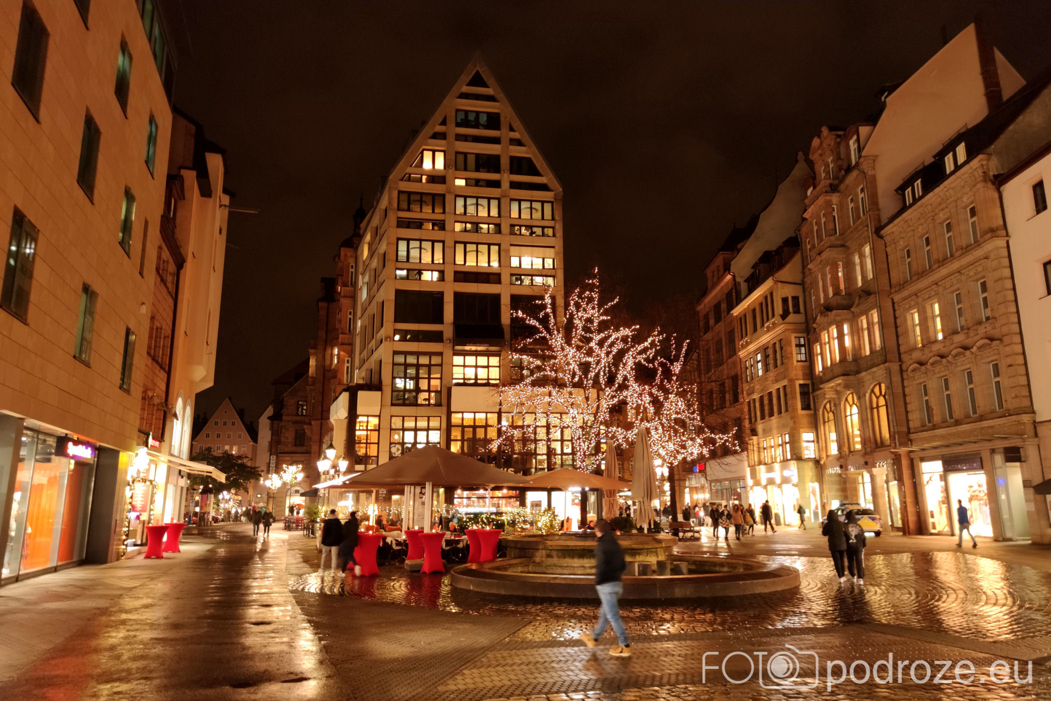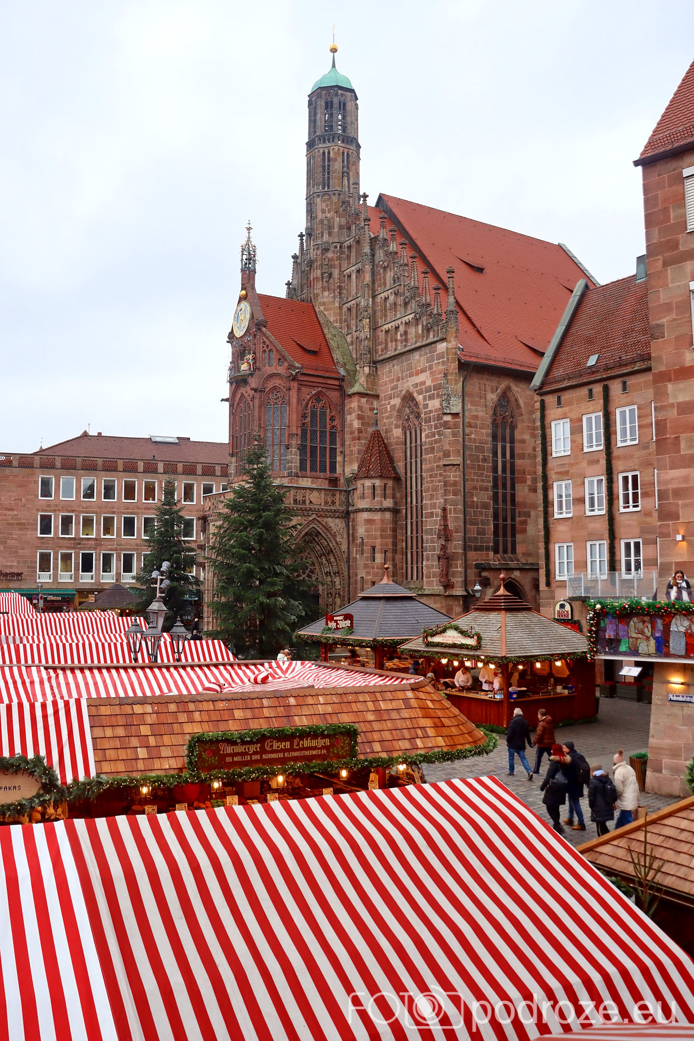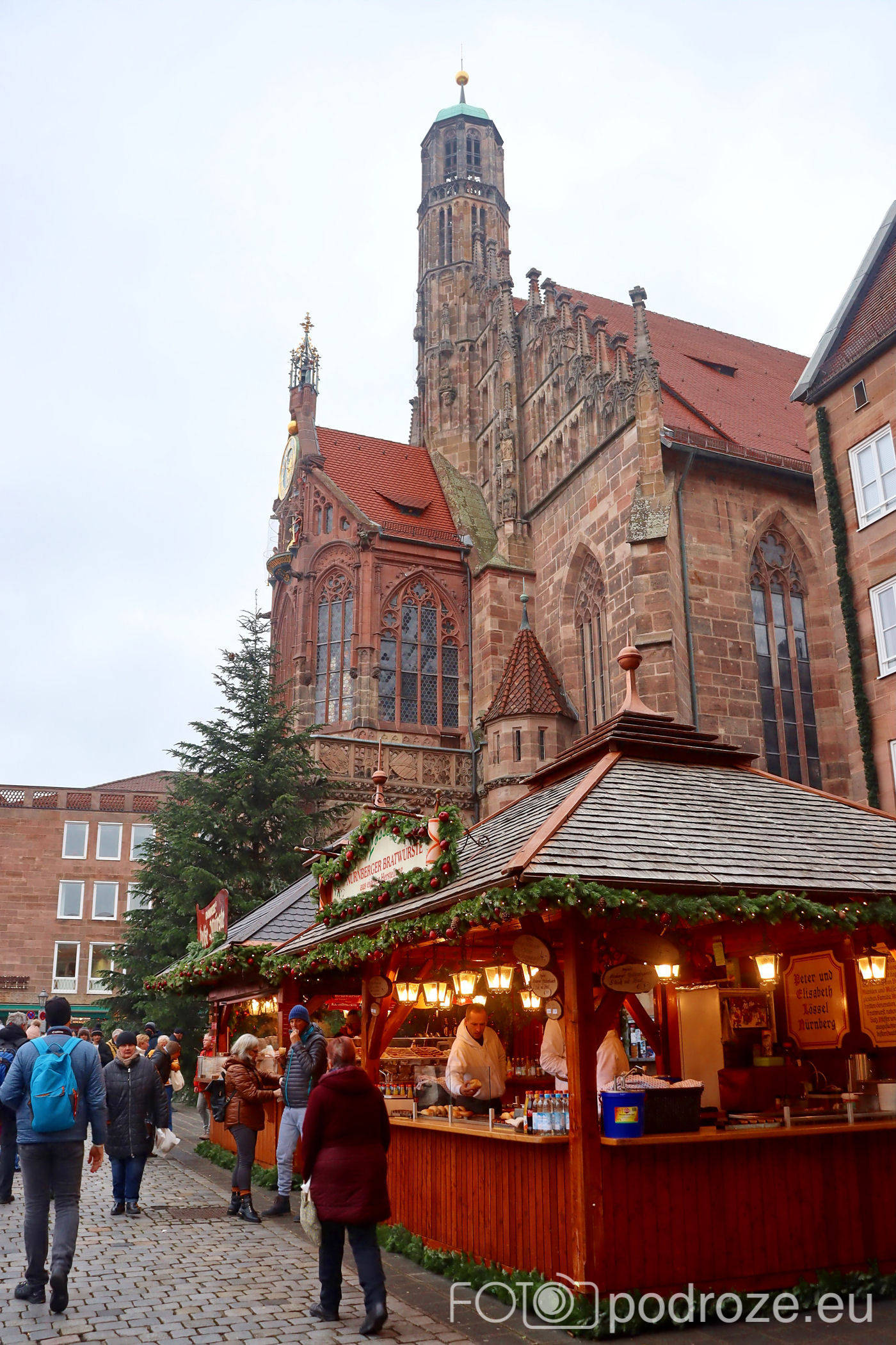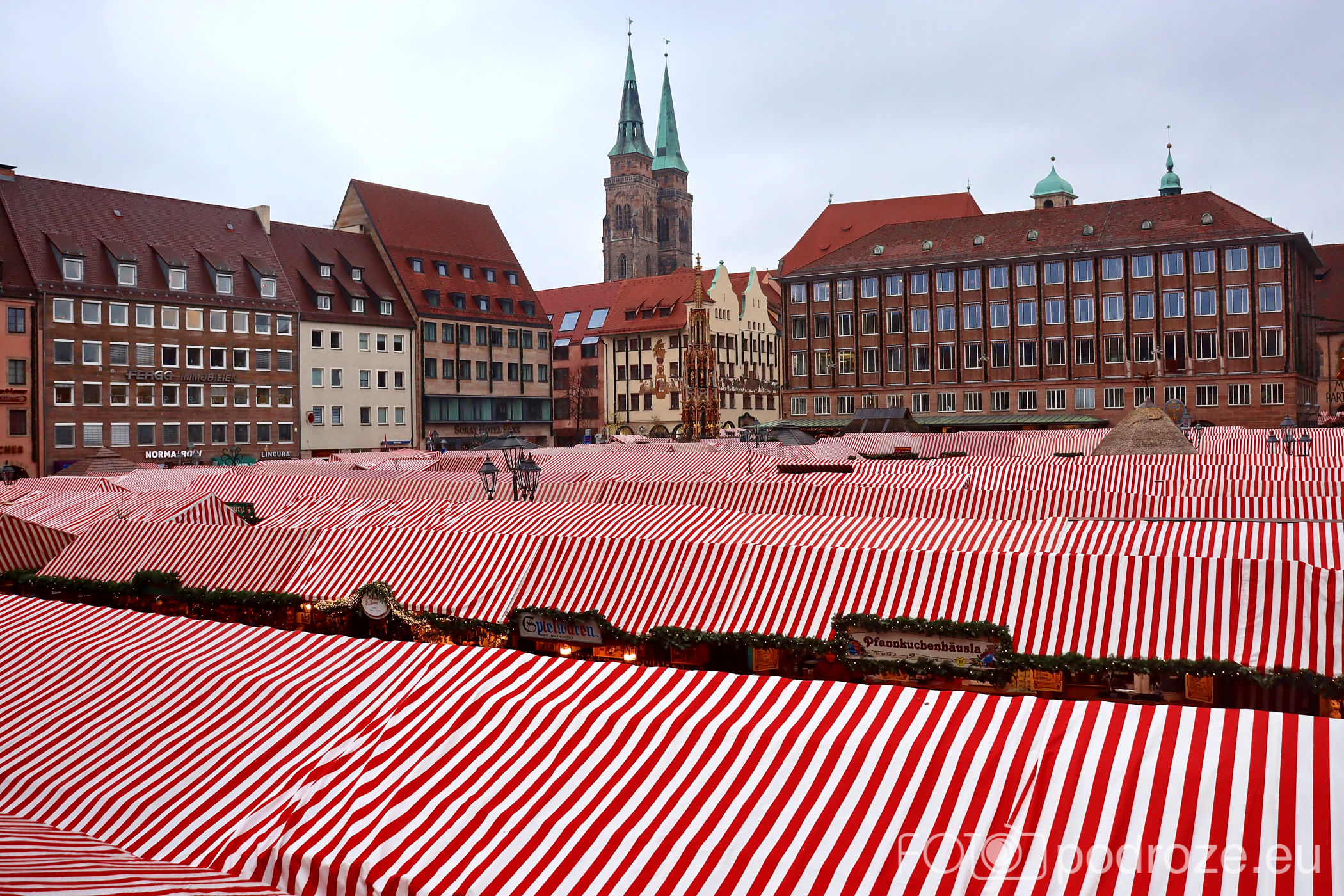 Zaczynamy od głównego, historycznego placu. Jego historia sięga XVI wieku, kiedy to podobno odbył się pierwszy jarmark przedświąteczny. Niestety zabudowa historyczny została zniszczona w czasie wojny i odbudowana już w zupełnie innym stylu, bo w okresie modernizmu. Teraz kompletnie nie pasuje do tego miejsca. Jedynie górujący nad placem kościół Frauenkirche i przepiękna historyczna studnia Schöner Brunnen pozwalają oczami wyobraźni przywołać tamte czasy. Jarmark z góry wygląda inaczej niż te które widzieliśmy w poprzednich latach. Wszystkie stoiska przykryte są jednolitymi dachami w biało – czerwone pasy. I nie ma na nich żadnych dekoracji, ani oświetlenia.