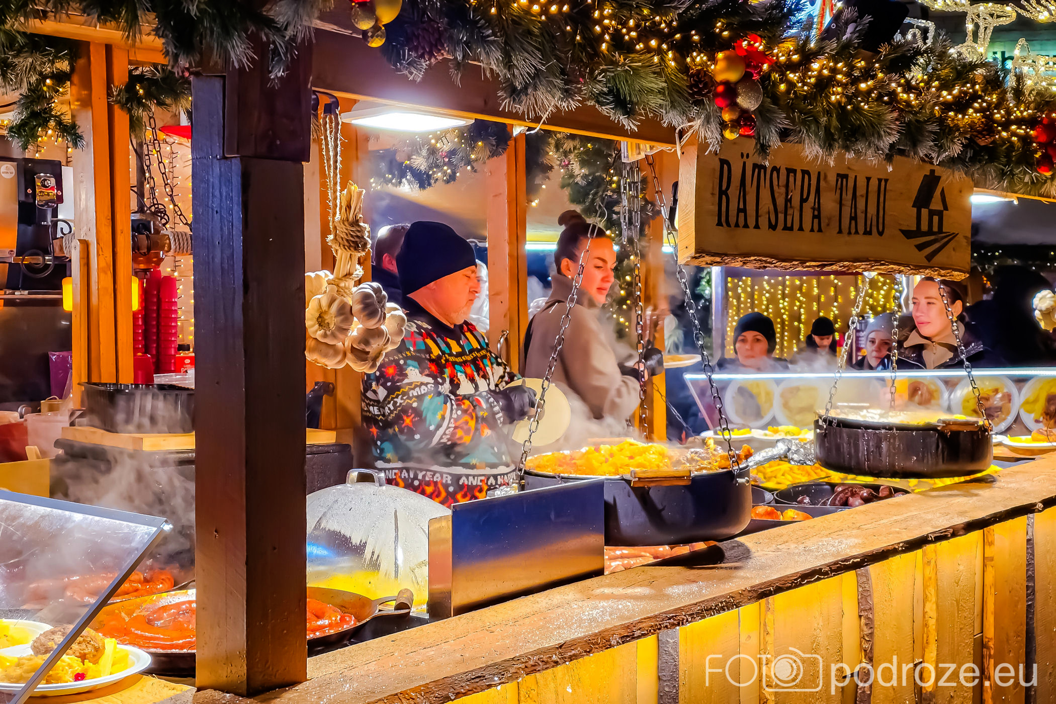 Z jarmarku na pewno nie wrócicie głodni. Mnóstwo straganów oferuje tu duże i ciepłe posiłki, a ich cena nie dobiega zbytnio od tego co jest na mieście. Estończycy lubią duże i obfite posiłki. Na estońskim stole bożonarodzeniowym znajdziemy takie potrawy jak: kapustę kiszoną, kiełbaski krwiste i wieprzowinę. Na jarmarku można spróbować każdej z nich. Krwawe kiełbasy składające się z wieprzowiny, jęczmienia, krwi zwierzęcej i przypraw, swoją nazwą i zawartością mogą odstraszyć, ale smakują podobno wyśmienicie. Można je zjeść np. z dżemem z borówki. Kiszona kapusta to z kolei ogromna ilość witaminy C, która pomaga przetrwać zimę w zdrowiu. Posiłki często serwowane są na talerzach z ciasta, które oczywiście także na koniec można spożyć.