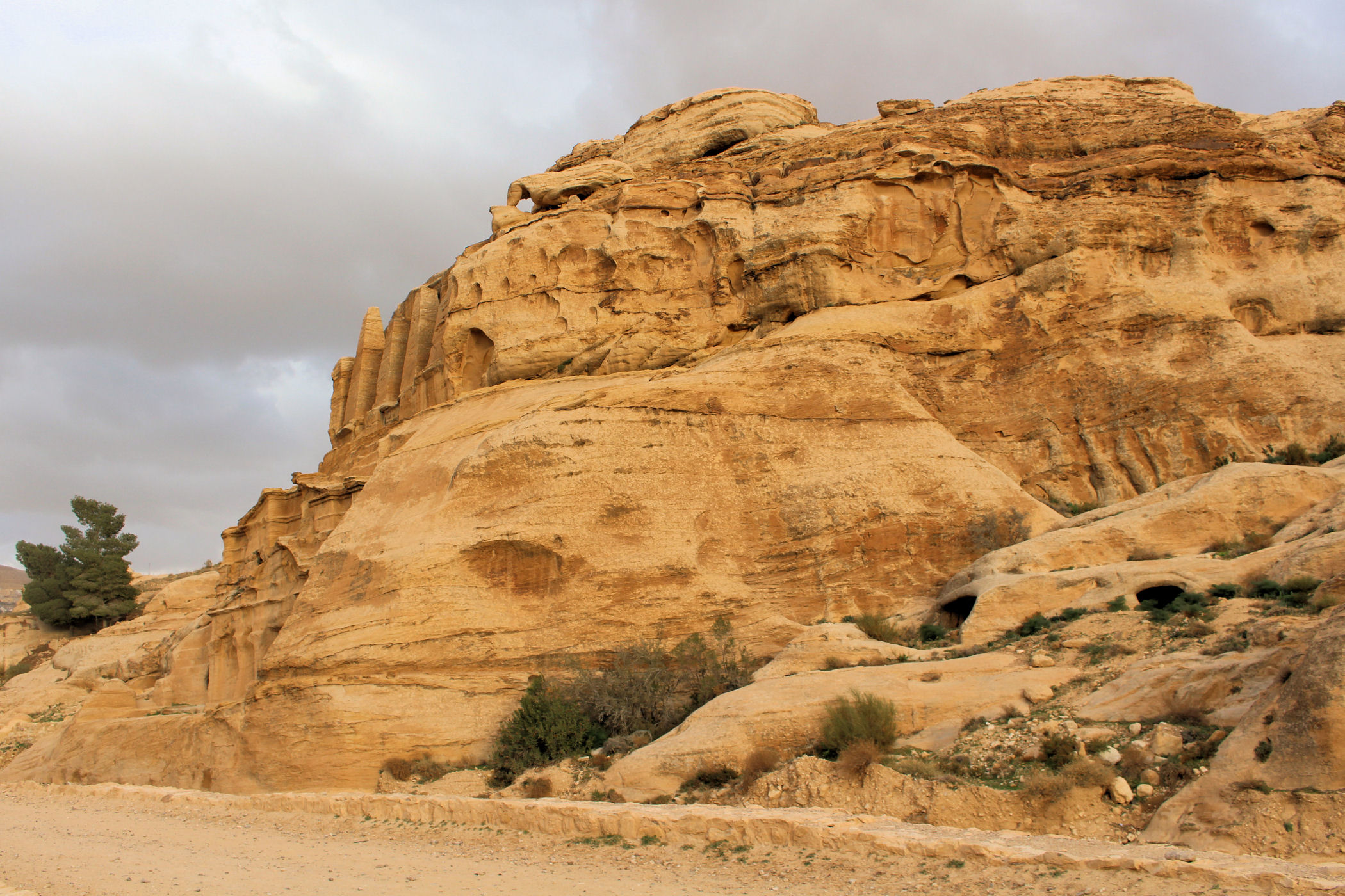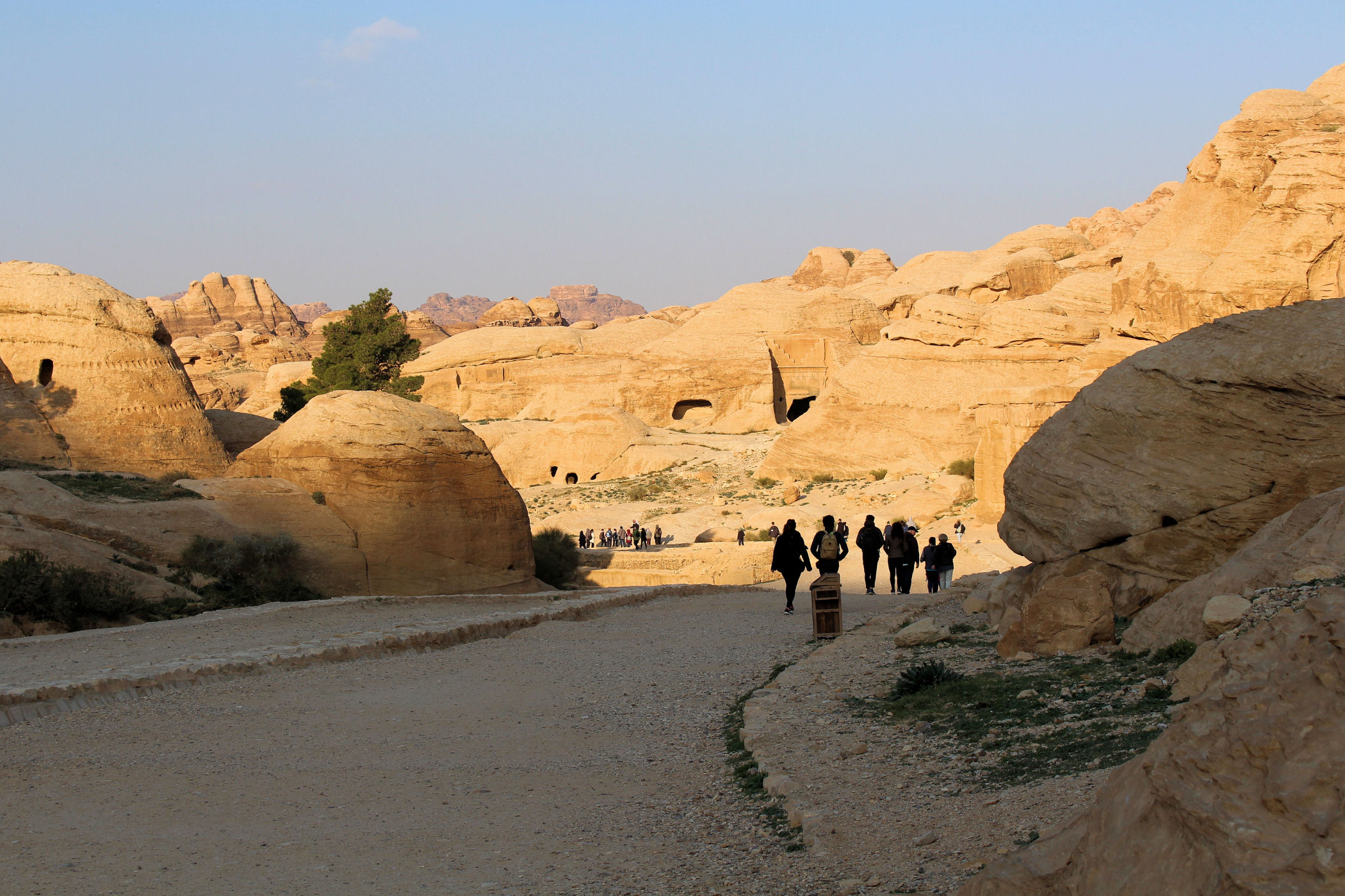 Początkowo szlak wiedzie nas szeroką (na początku nawet 2-pasmową) drogą przez skalistą dolinę w żółtych odcieniach. Już tutaj stykamy się z pierwszymi budowlami i fasadami wykutymi w skale. To kolejno: Bab al-Siq, Djinn Blocks i Grobowiec Obelisków (czyli Obelisk Tomb – dość mocno nadszarpnięty zębem czasu) . Ten odcinek jak już pisałam w PETRA – INFORMACJE można pokonać bryczką konną w ramach biletu wstępu (ale patrząc na te biedne zwierzęta – odradzam) .