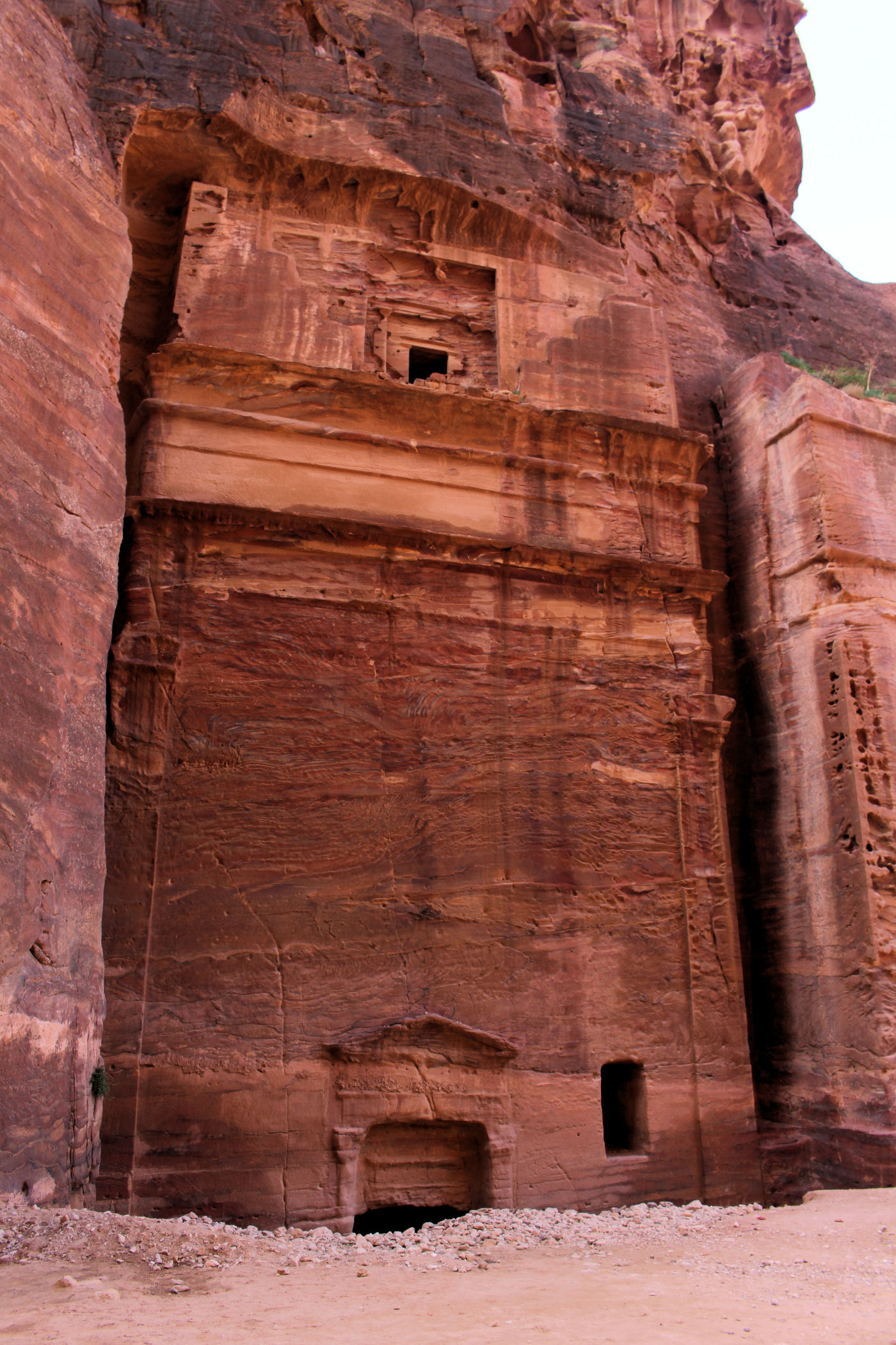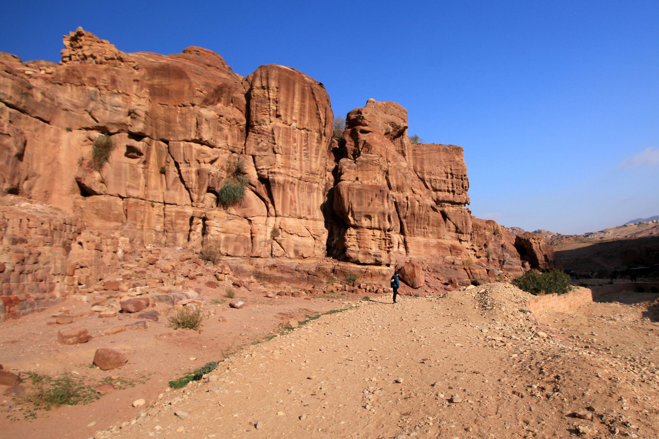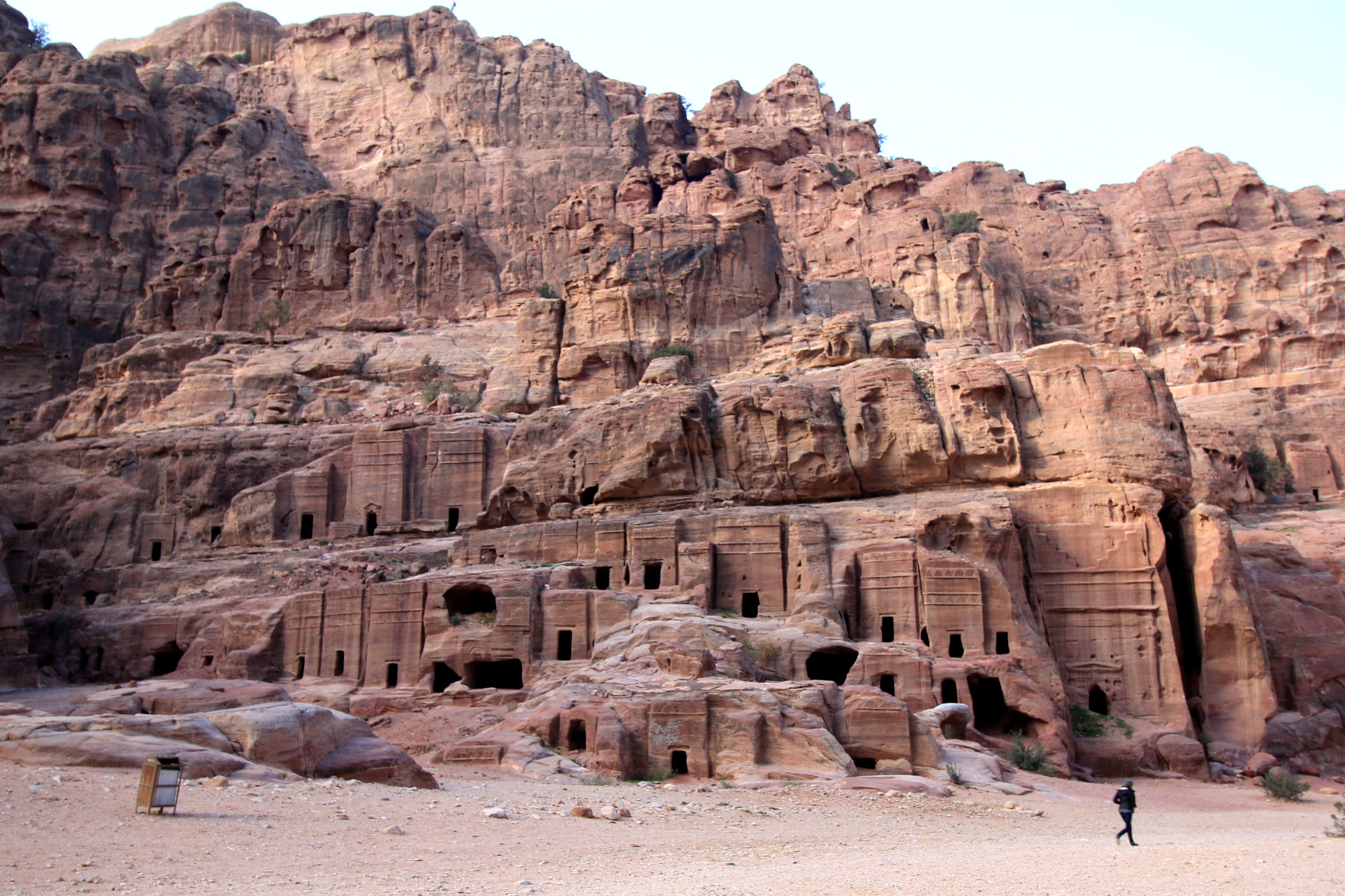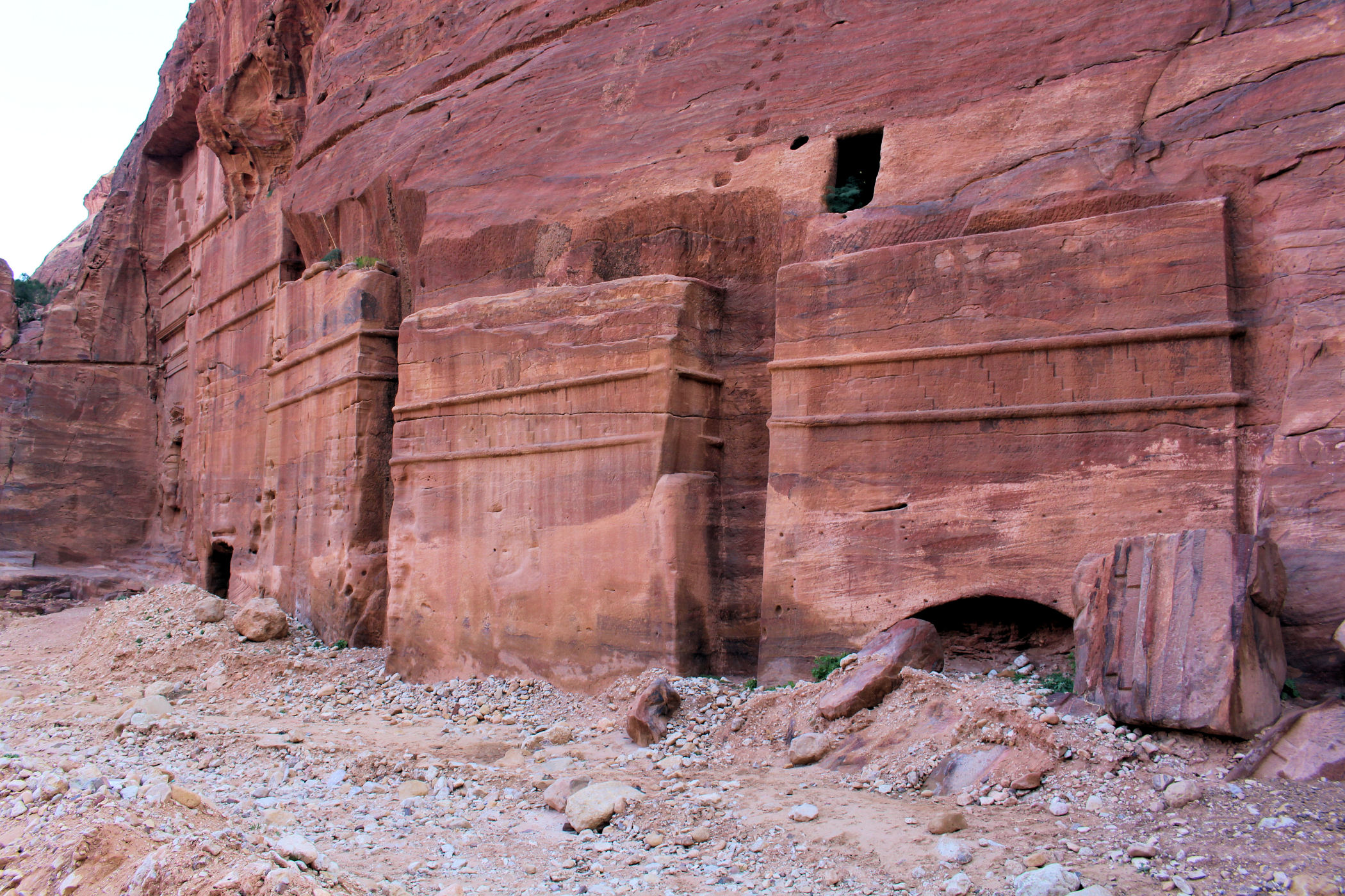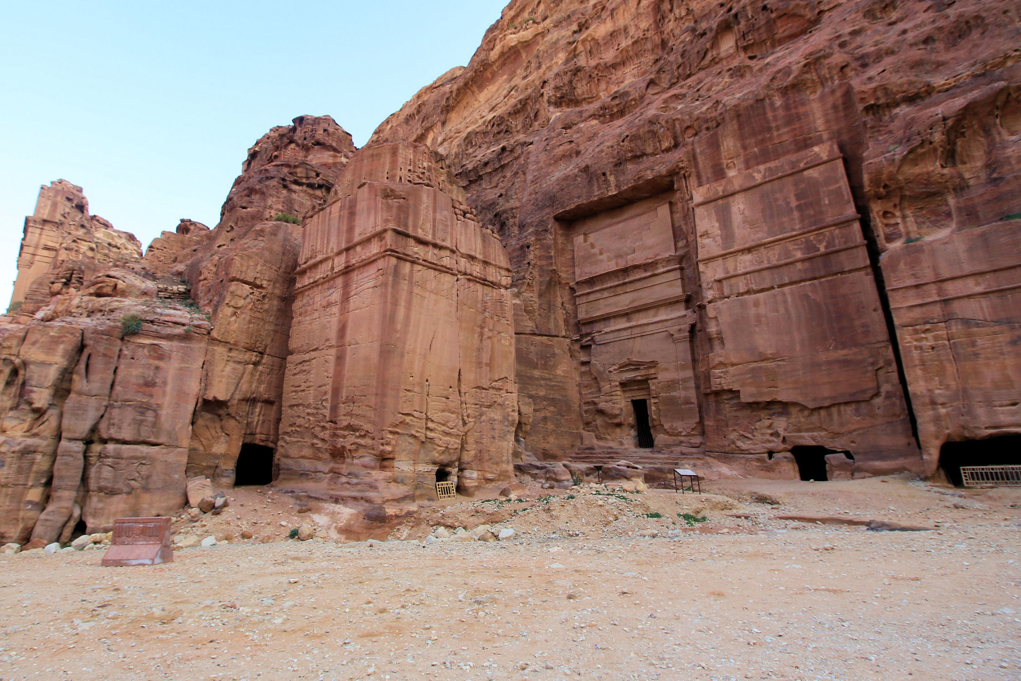 Tuż za Skarbcem skręcamy w Ulicę Fasad, która ciągnie się przez 0,5 km. Tu skalny wąwóz zupełnie się otwiera. Po lewej stronie zaczyna się (lub kończy) szlak prowadzący na szczyt Dżabal Madbah, który opisuję TUTAJ. Ulica fasad to 44 fasady grobowców, wykute w czterech rzędach. Grobowce pochodzą z początków świetności Petry. Najwięcej grobowców jest prostych, pylonowych z rzędami tzw. fryzu blankowego. Nieliczne są schodkowe oraz rzadko spotykane grobowce łukowe. Mają czyste nabatejskie formy, bez zapożyczeń z innych stylów. Kawałek dalej, znajduje się grupa kolejnych 31 grobowców, wykutych wzdłuż dwóch ciągów. Dla zainteresowanych tą częścią skalnego miasta – ciekawe opracowanie znalazłam TUTAJ .