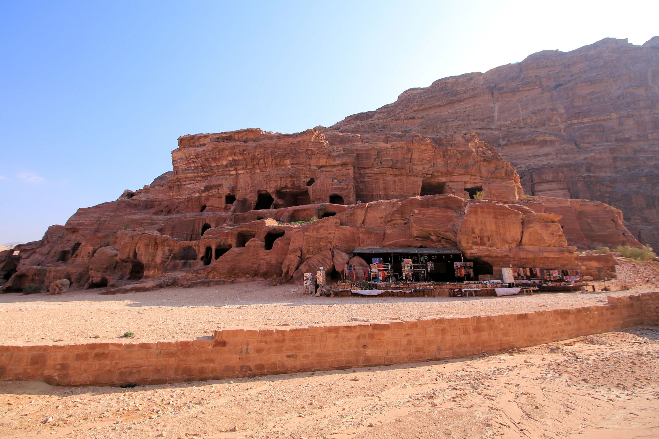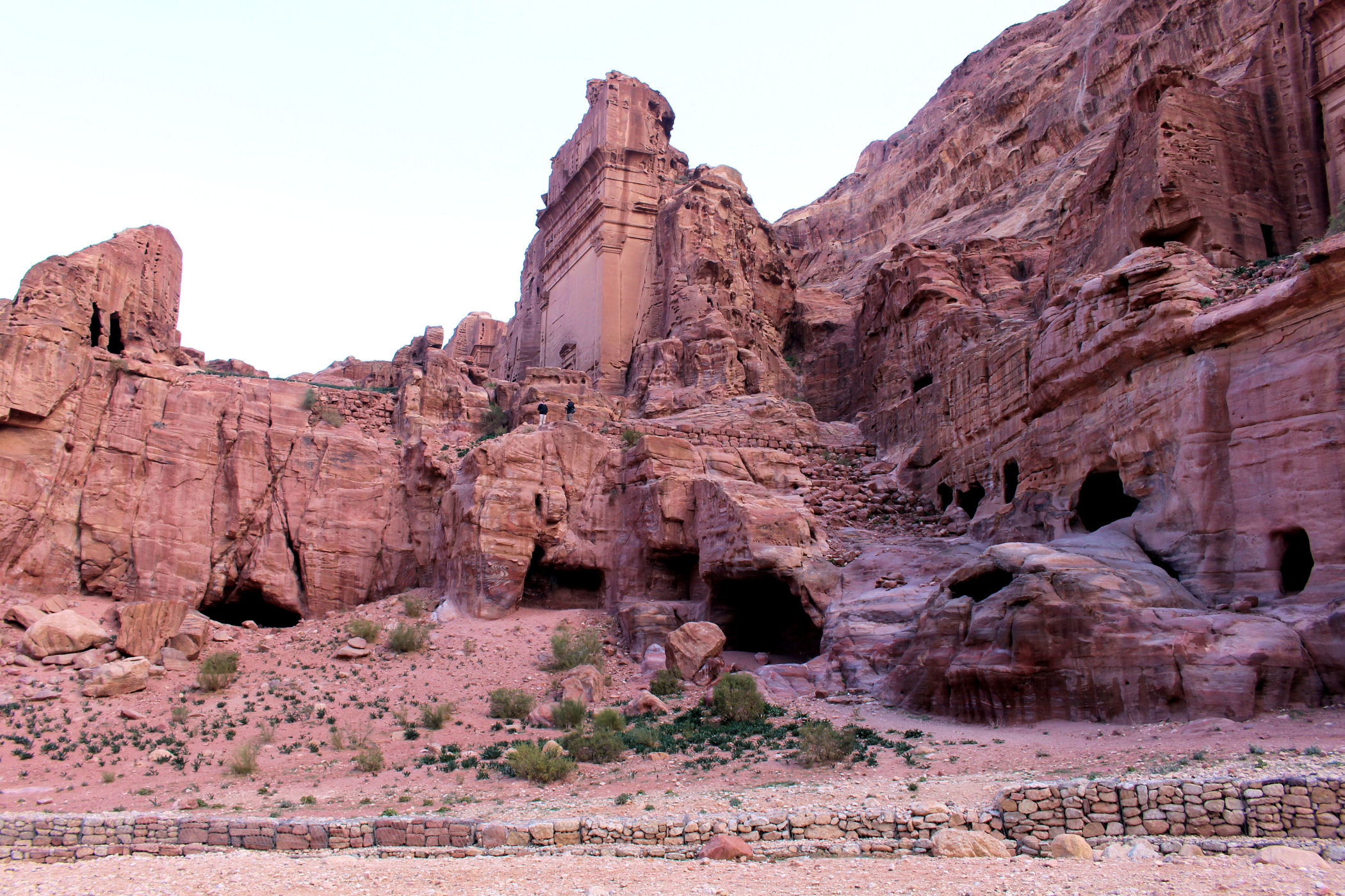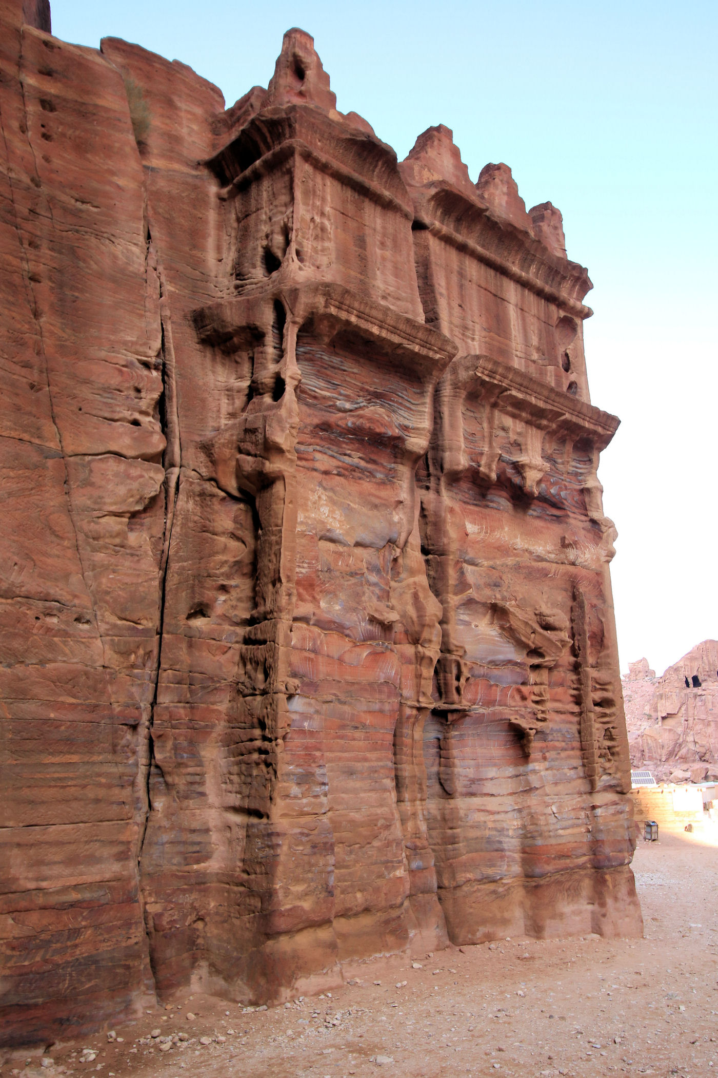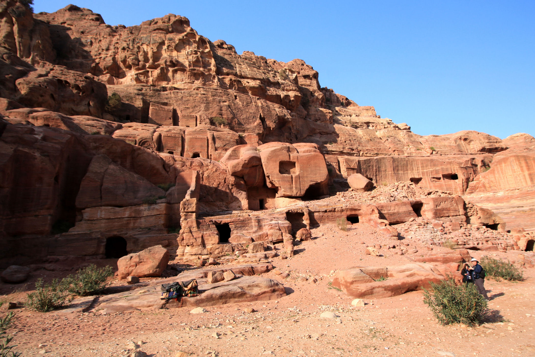 Tuż za Skarbcem skręcamy w Ulicę Fasad, która ciągnie się przez 0,5 km. Tu skalny wąwóz zupełnie się otwiera. Po lewej stronie zaczyna się (lub kończy) szlak prowadzący na szczyt Dżabal Madbah, który opisuję TUTAJ. Ulica fasad to 44 fasady grobowców, wykute w czterech rzędach. Grobowce pochodzą z początków świetności Petry. Najwięcej grobowców jest prostych, pylonowych z rzędami tzw. fryzu blankowego. Nieliczne są schodkowe oraz rzadko spotykane grobowce łukowe. Mają czyste nabatejskie formy, bez zapożyczeń z innych stylów. Kawałek dalej, znajduje się grupa kolejnych 31 grobowców, wykutych wzdłuż dwóch ciągów. Dla zainteresowanych tą częścią skalnego miasta – ciekawe opracowanie znalazłam TUTAJ .