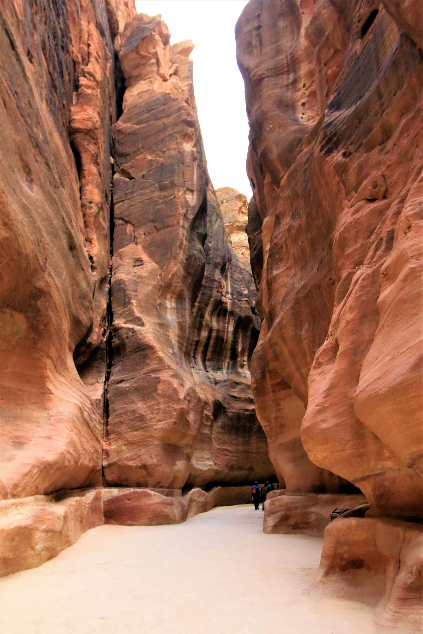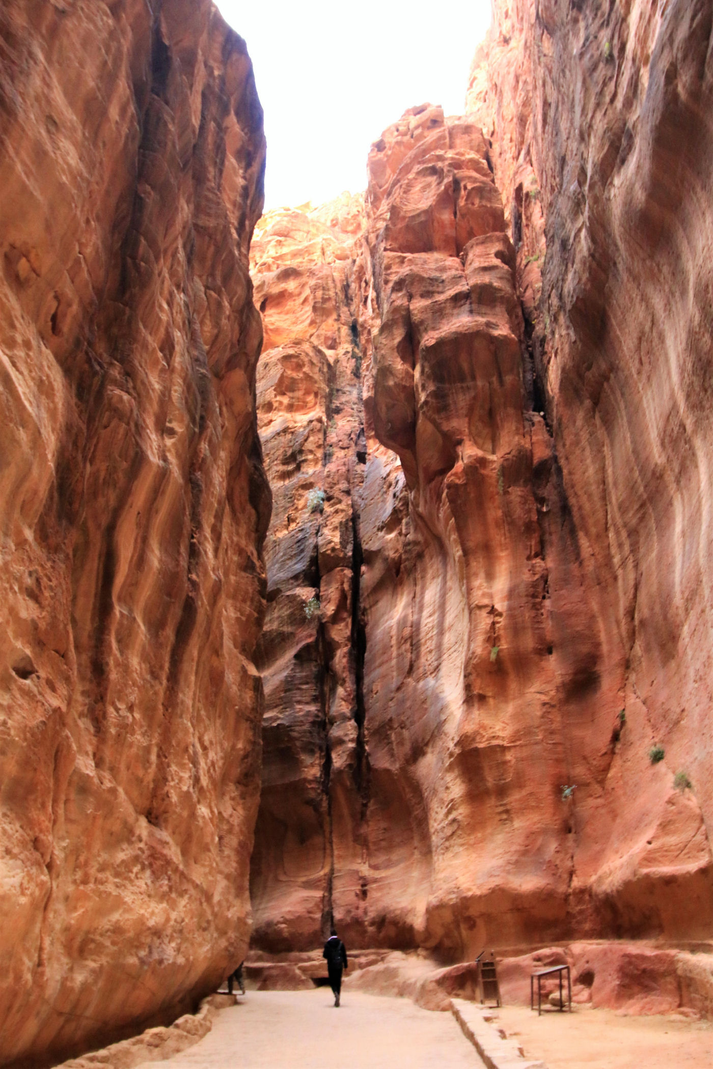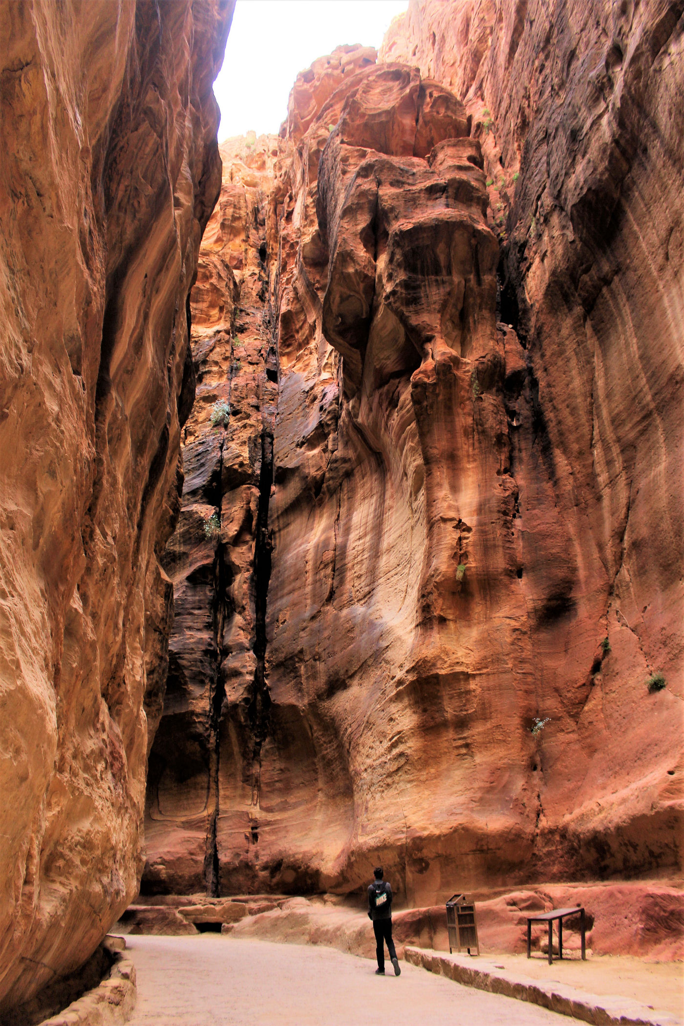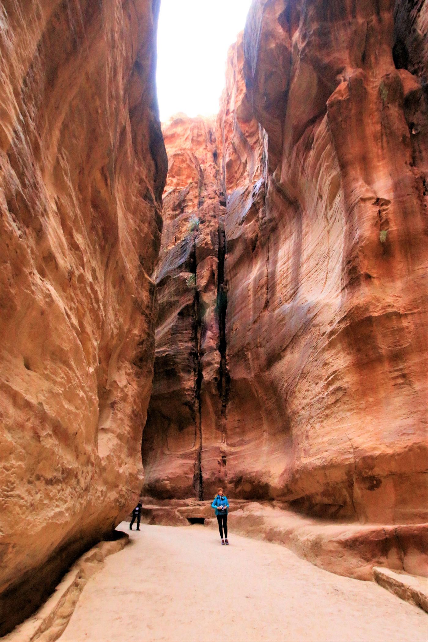 Mniej więcej 1,5 kilometra dalej droga nagle zwęża się i wchodzimy w krainę bajecznego czerwonego kanionu. Jego długość to około 1 km. Po obu stronach otoczony jest strzelistymi klifami o wysokości do 80 metrów. Kanion ma unikalny geologicznie krajobraz na świecie. Wyrzeźbiona z bladoczerwonego piaskowca wschodnia strona tego obszaru jest ograniczona murem królewskim. Gdy docieramy do końca Siq, przez wąską szczelinę ukazuje nam się słynny Skarbiec.