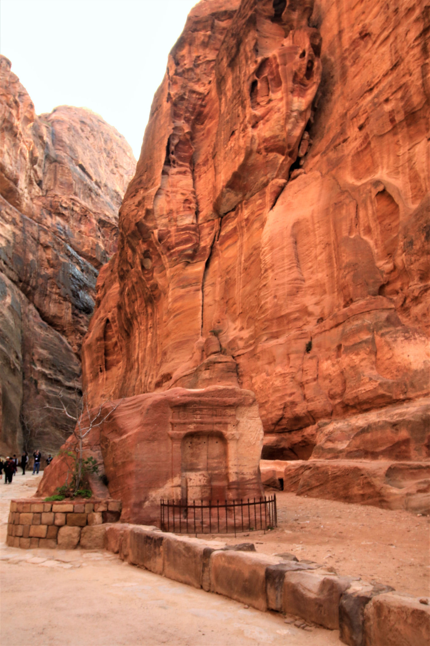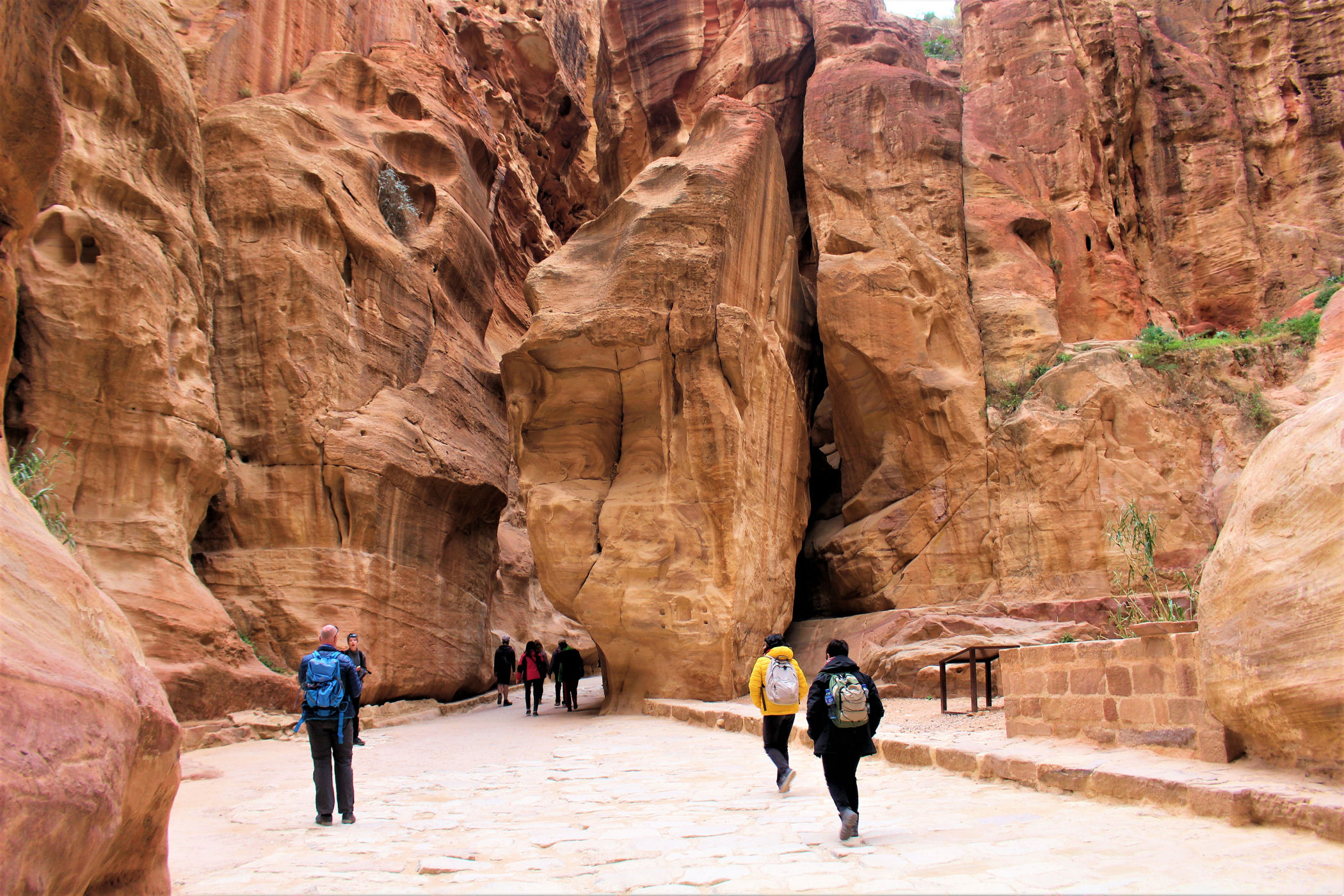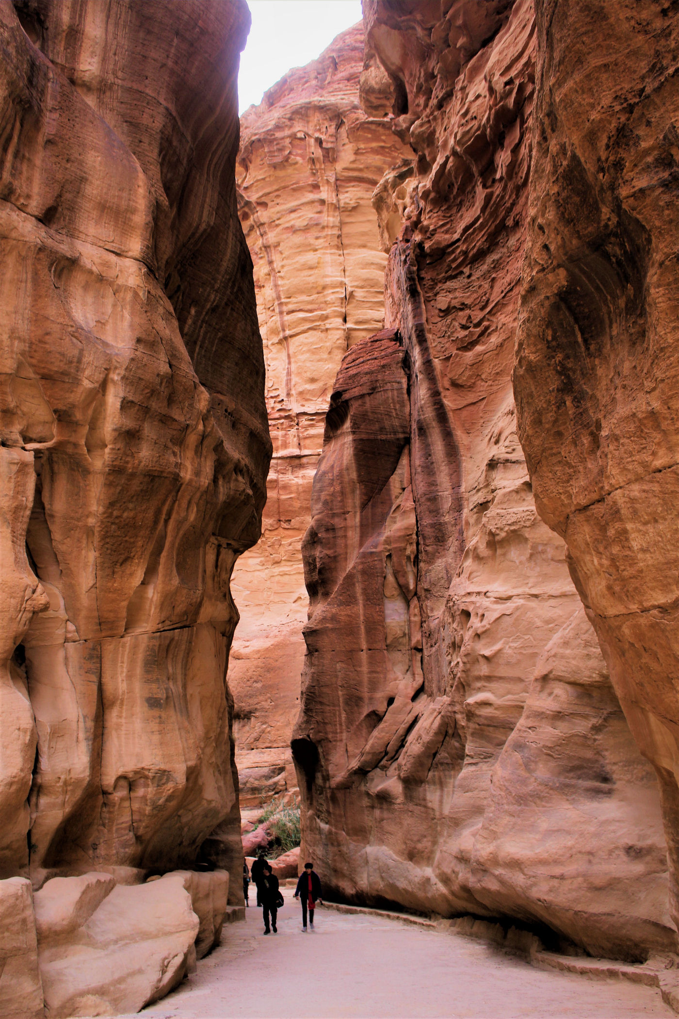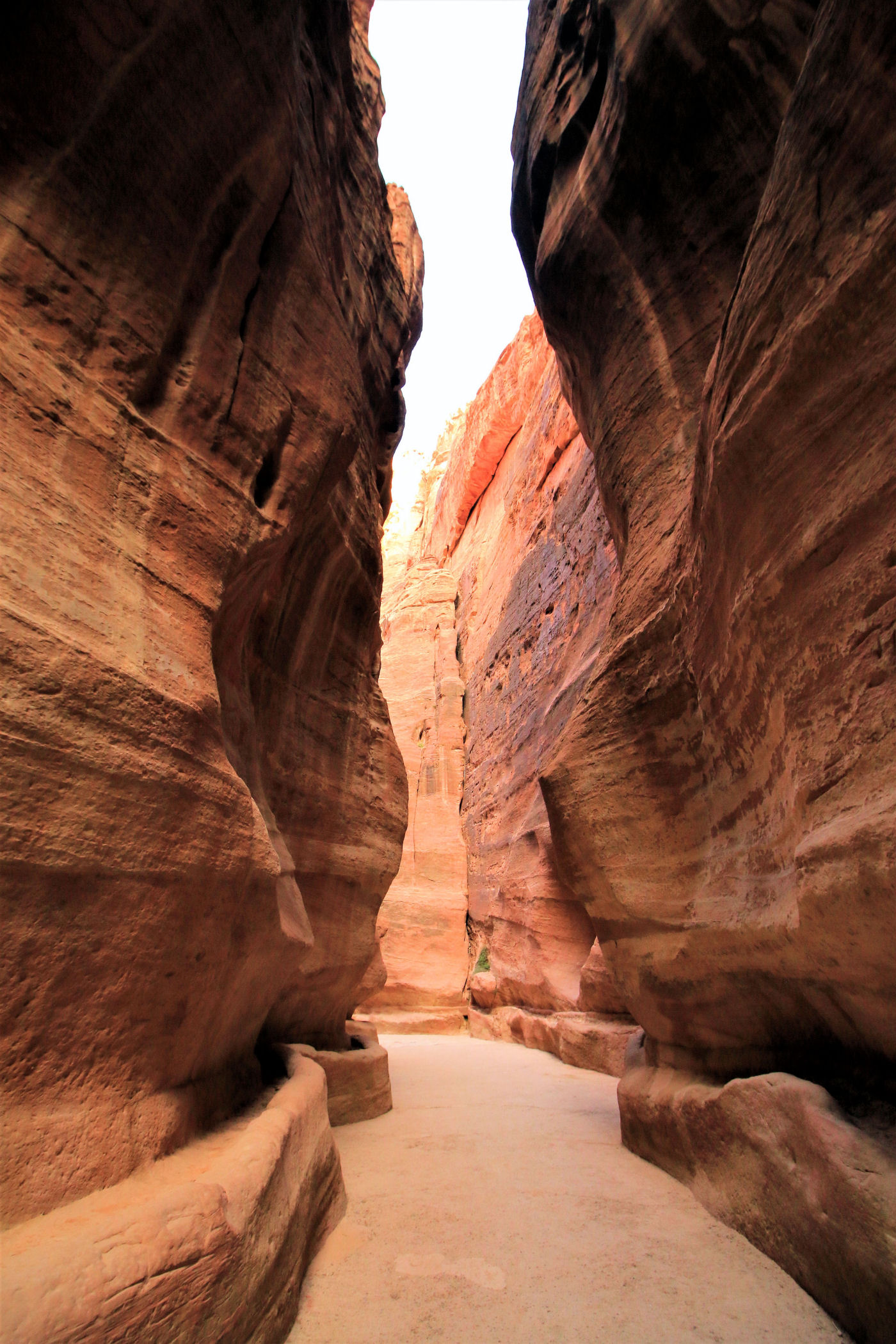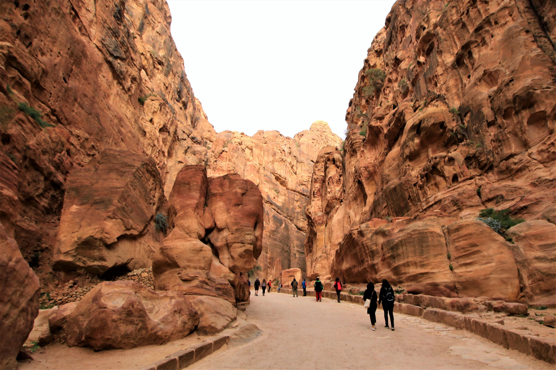 Mniej więcej 1,5 kilometra dalej droga nagle zwęża się i wchodzimy w krainę bajecznego czerwonego kanionu. Jego długość to około 1 km. Po obu stronach otoczony jest strzelistymi klifami o wysokości do 80 metrów. Kanion ma unikalny geologicznie krajobraz na świecie. Wyrzeźbiona z bladoczerwonego piaskowca wschodnia strona tego obszaru jest ograniczona murem królewskim. Gdy docieramy do końca Siq, przez wąską szczelinę ukazuje nam się słynny Skarbiec.
